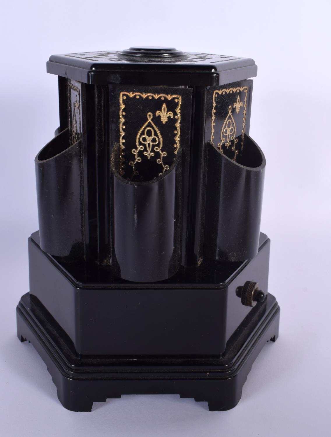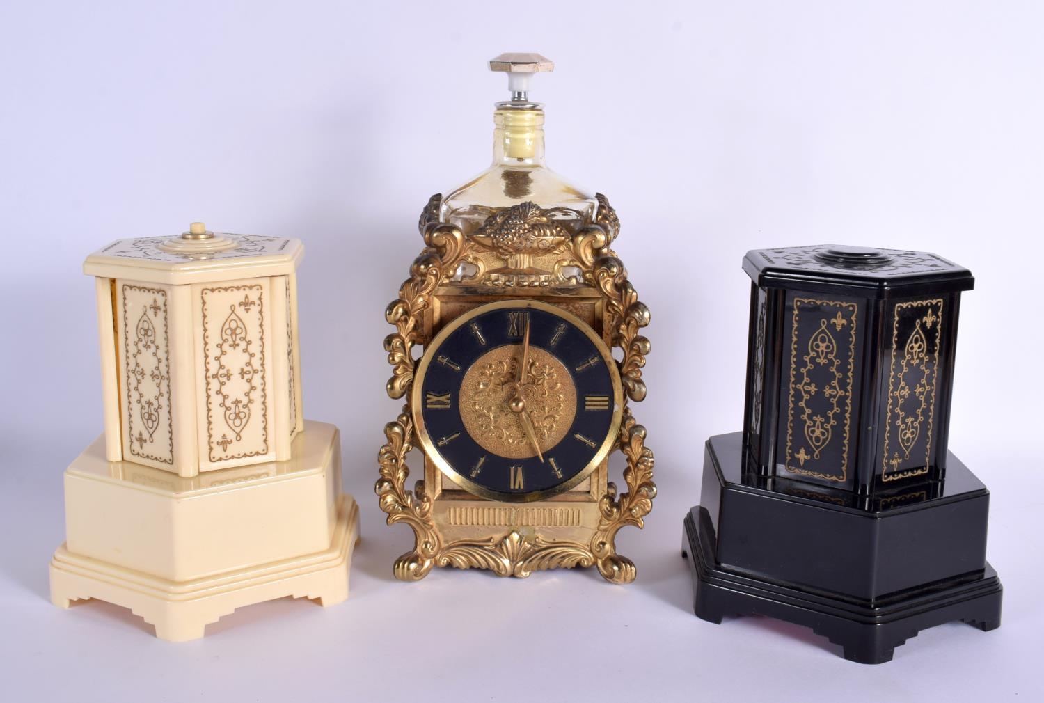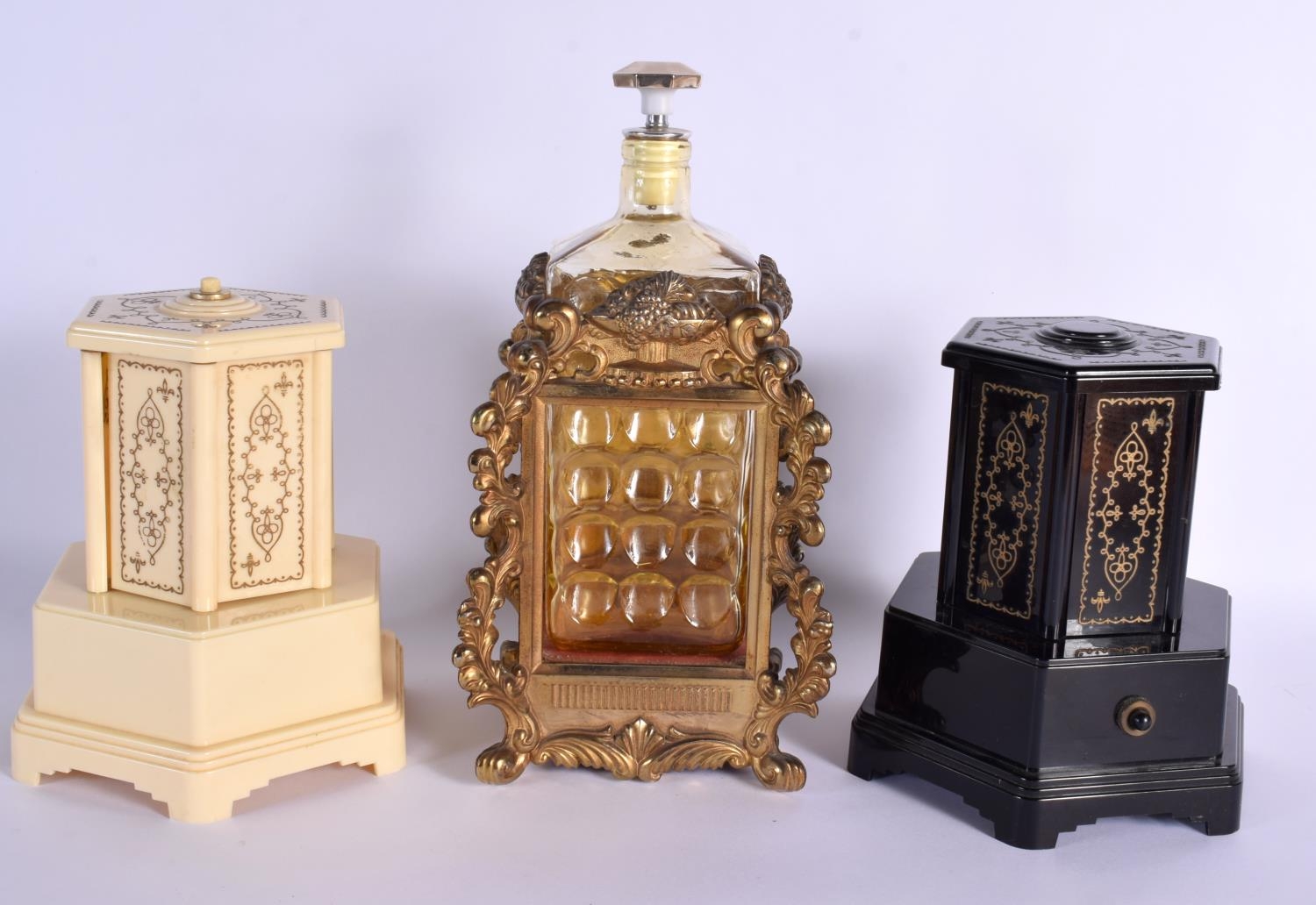 THREE NOVELTY VINTAGE MUSIC BOXES one formed as a decanter. Largest 30 cm high. (3)