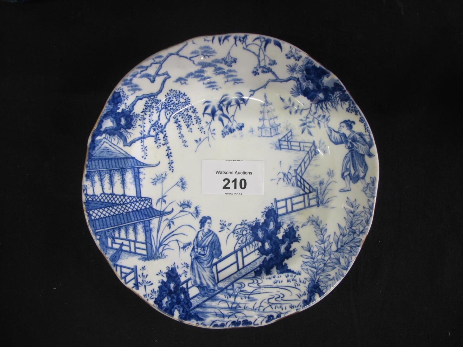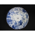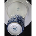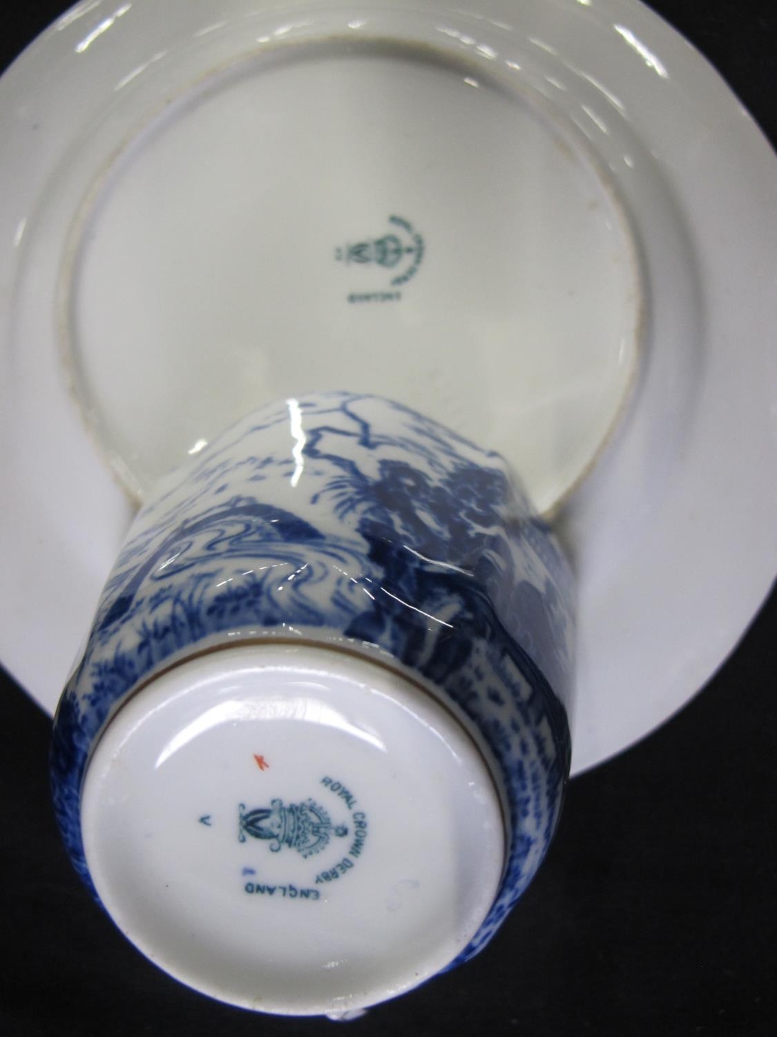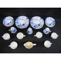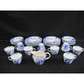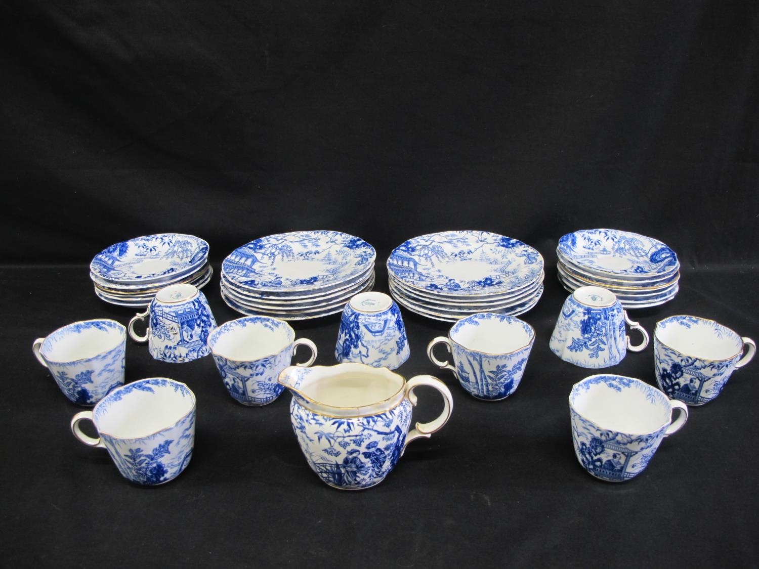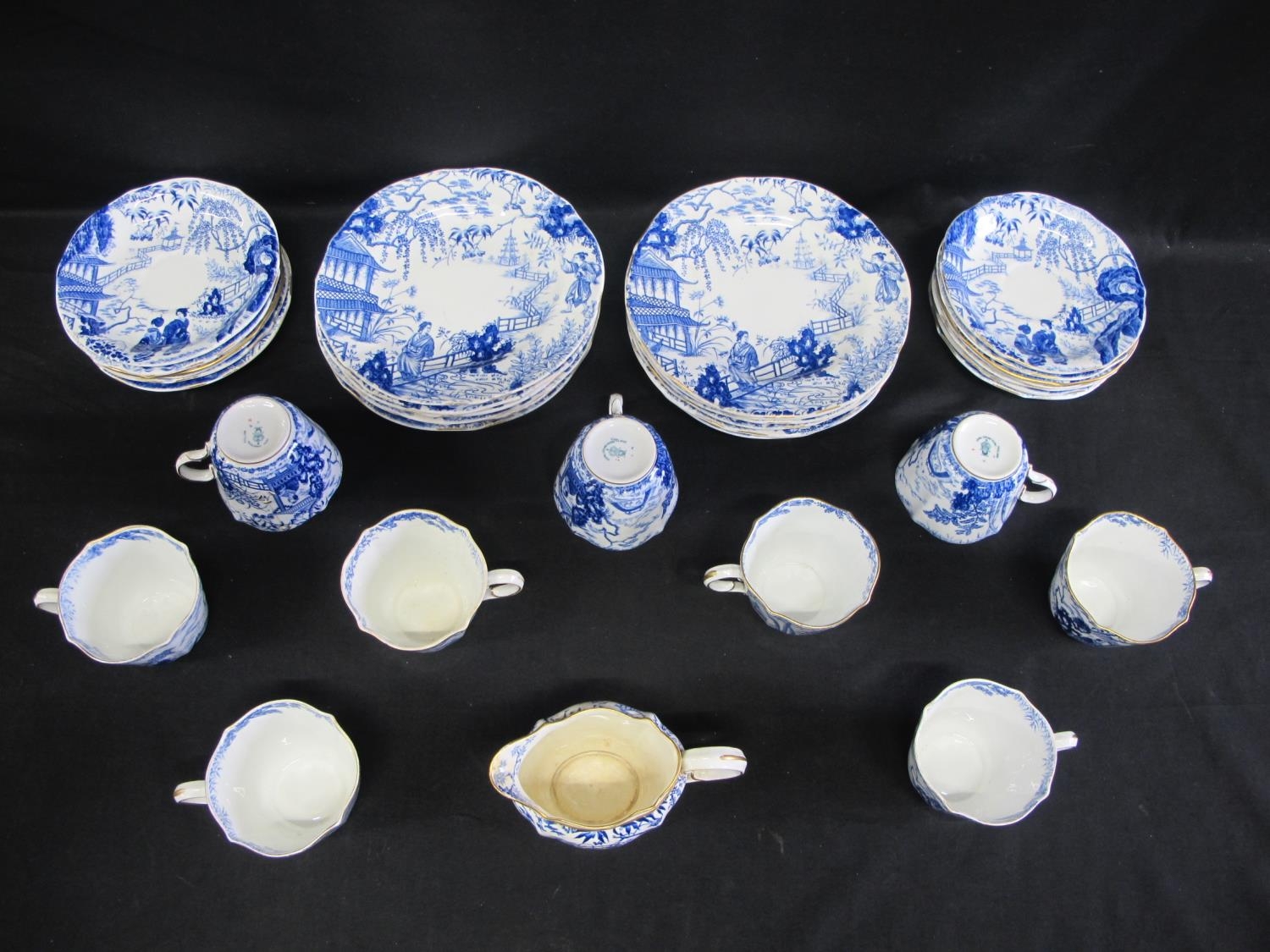 Royal Crown Derby teaset having blue decoration of Oriental figures in landscape settings on a white ground, to comprise: milk jug, nine tea cups, thirteen saucers and twelve 17.5cm side plates
