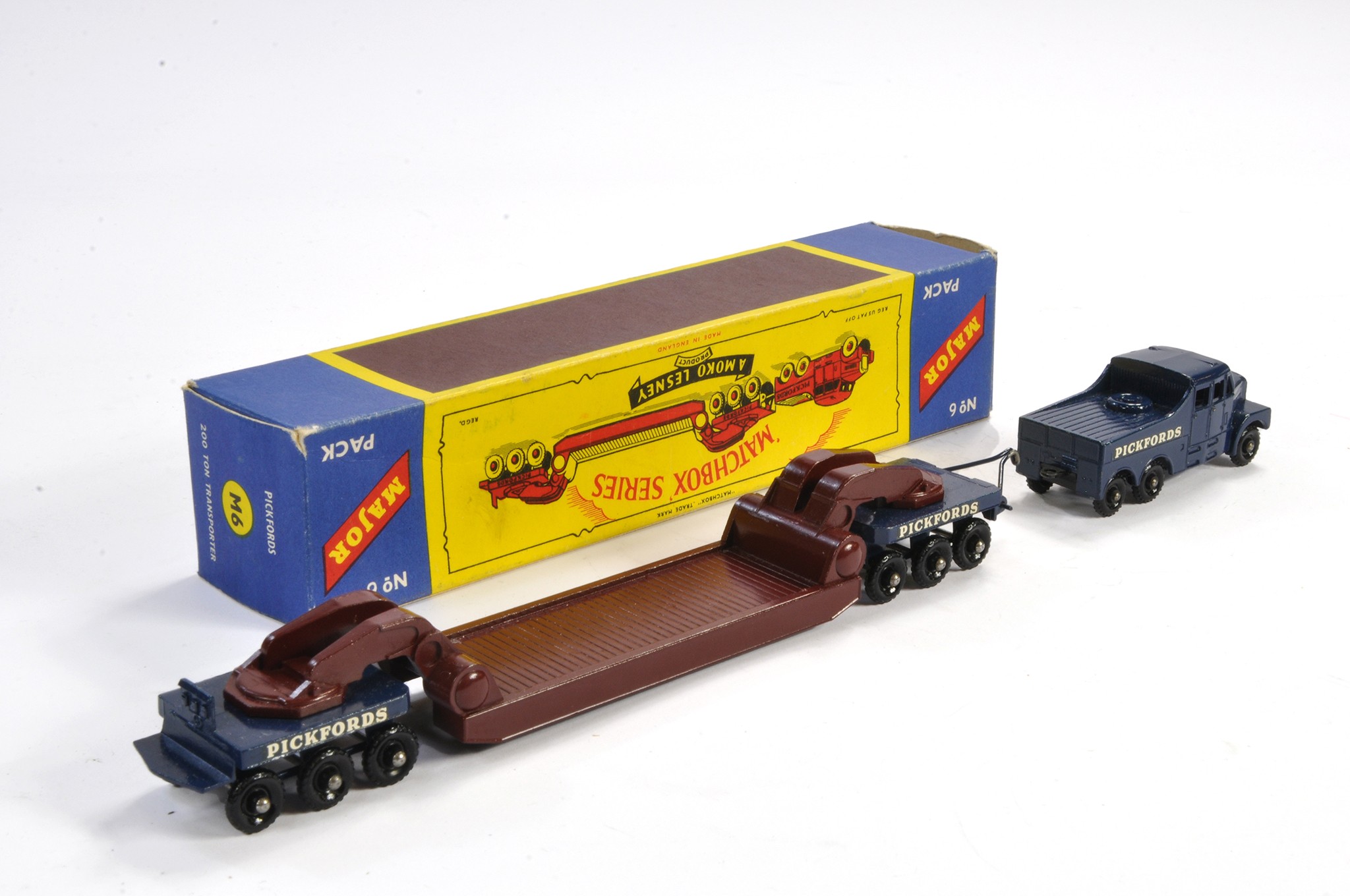 Matchbox Regular Wheels Major Pack No. M6. Scammell Low Loader in the livery of Pickfords. Dark Blue and Maroon. Generally very good to excellent, some minor chips to tractor unit mostly. Contained in generally excellent original box.