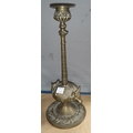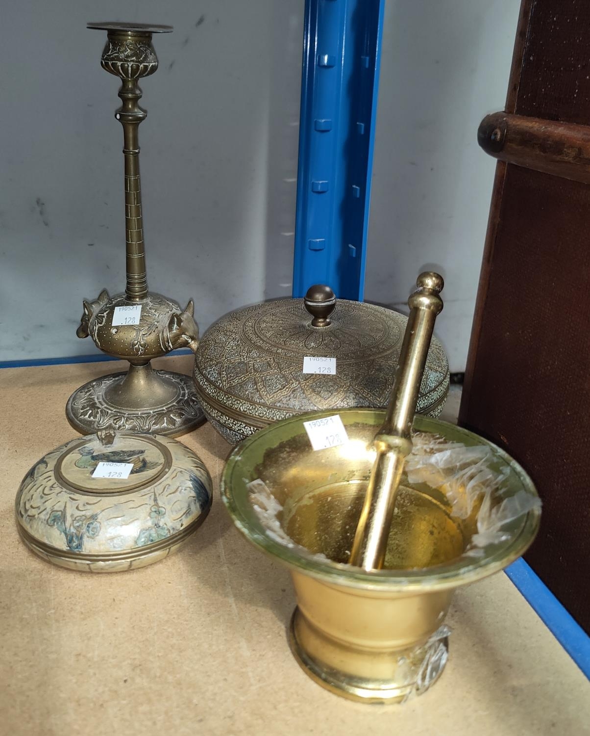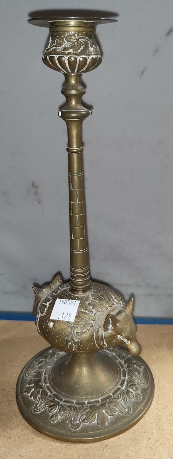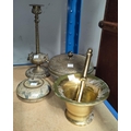 A brass pestle and mortar, brass candle sticks of fox heads, a Middle Eastern lidded pot and another