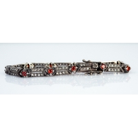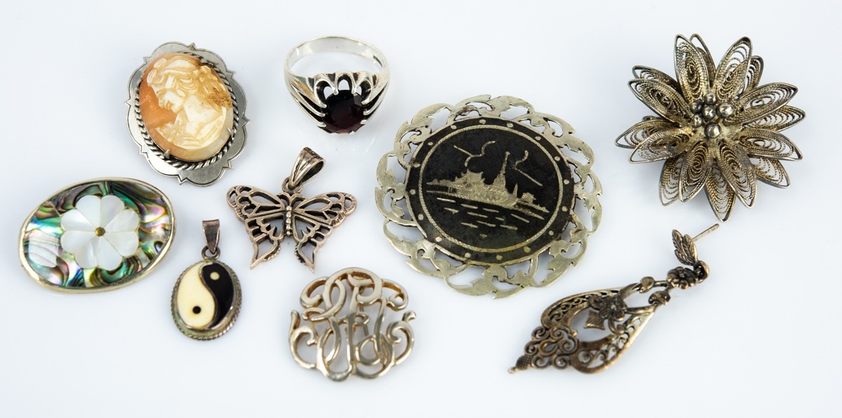 925 MARK SILVER OPENWORK BUTTERFLY PENDANT; indistinctly hallmarked GENT'S SILVER RING claw set with an oval cut red stone; and EIGHT OTHER SILVER COLOURED METAL PIECES including a filigree flowerhead brooch and a Siamese Sterling silver engraved black enamel circular brooch, ten items in total (10)