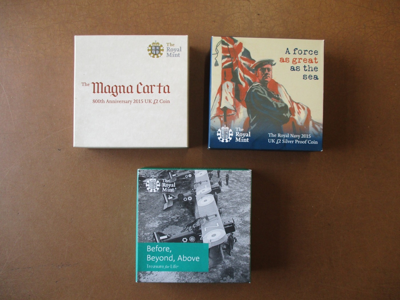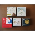 Boxed silver proofs FDC with £5 piedfort 2016 Birthday, £5 2017 Jubilee, 1977 crown re-issue, £2 piedfort 2017 WWI aviation, £2 2015 Navy, Magna Carta, £2 Queens Beasts 2017 Lion of England, 2018 Bull, 2019 Falcon, £1 2016, 2017, 50p piedfort 2016 Team GB, 50p coloured 2018 Beatrix Potter (4 different), 50p 2018 Snowman, 2019 Gruffalo. Qty 18 (B)