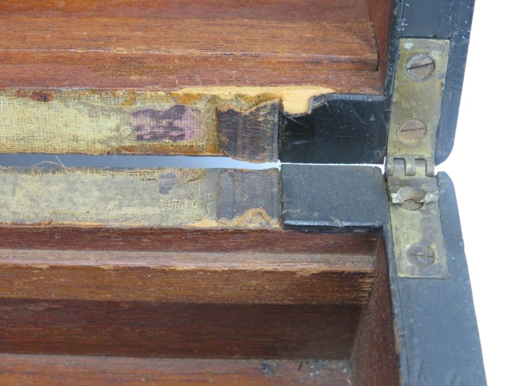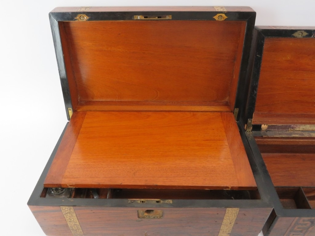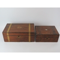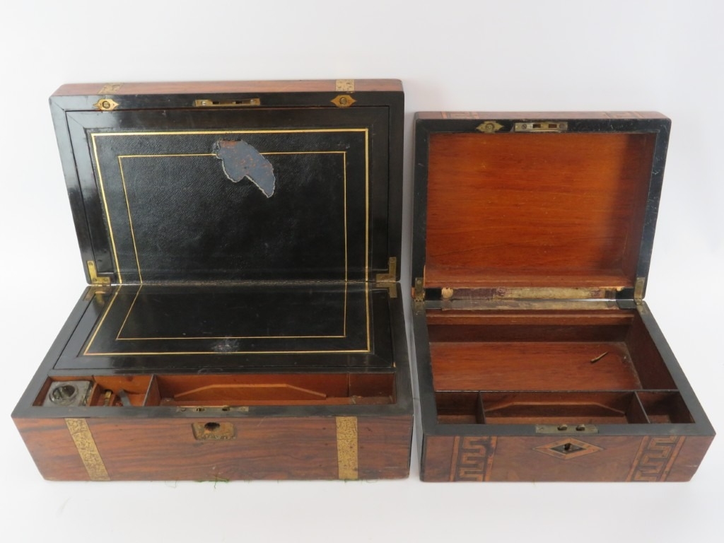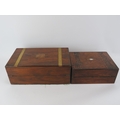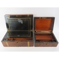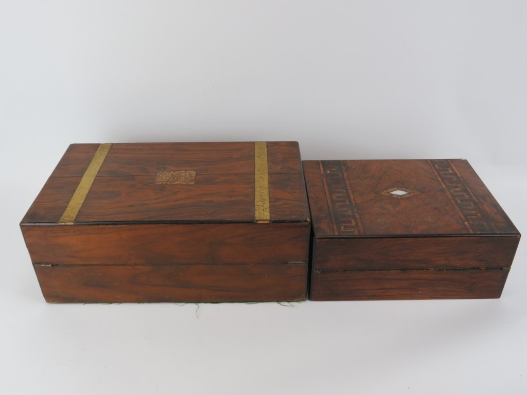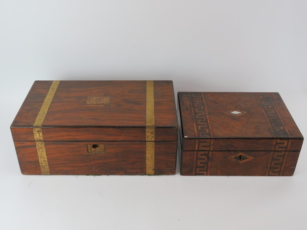 A rosewood brass reinforced writing slope and a parquetry inlaid walnut stationary box. (2 items) 40.5 cm length, 30 cm length.