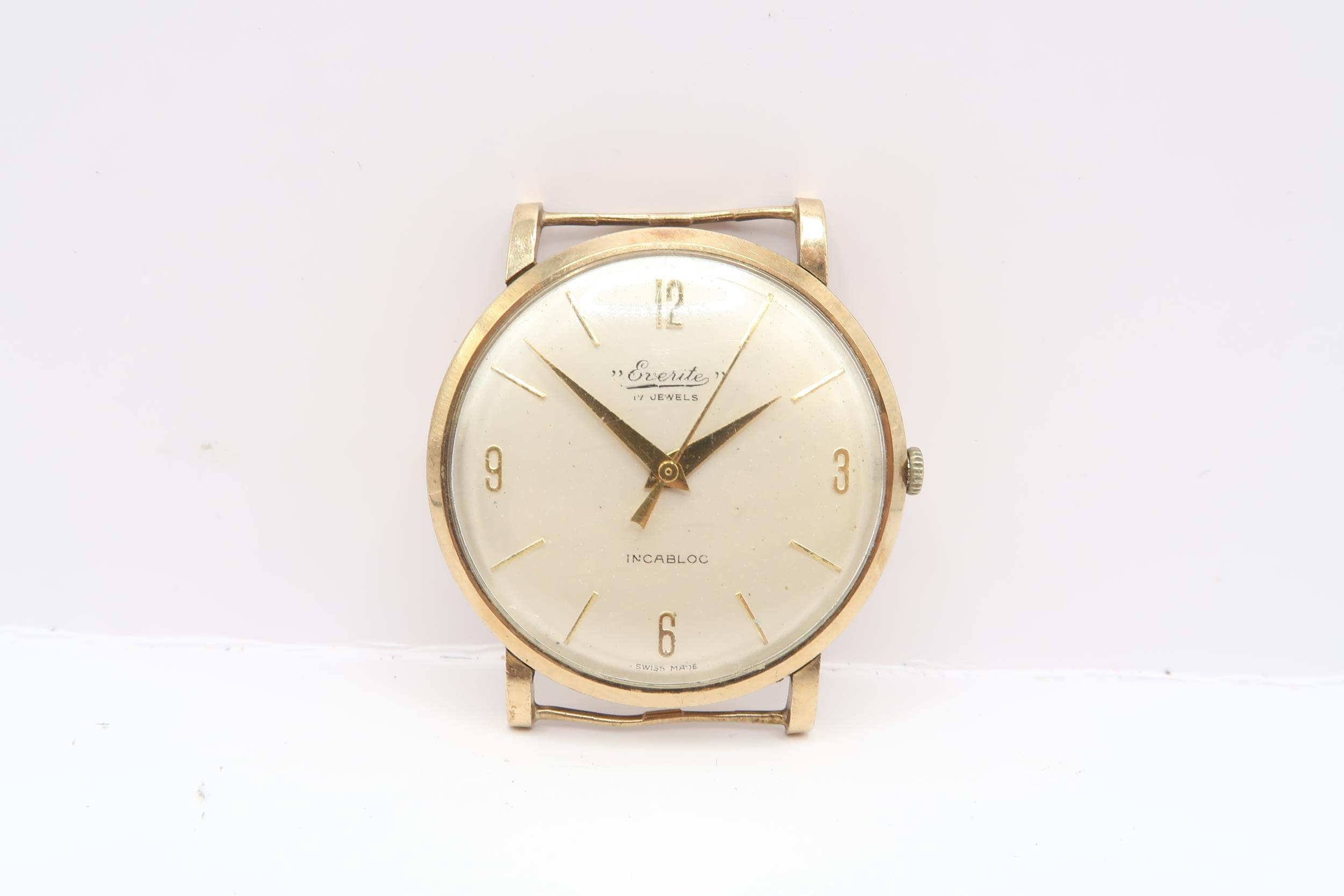 A 9ct Manual Wind Everite Watch, Featuring a Cream Dial with Gold Applied Indices and Arabic numerals.