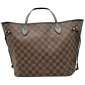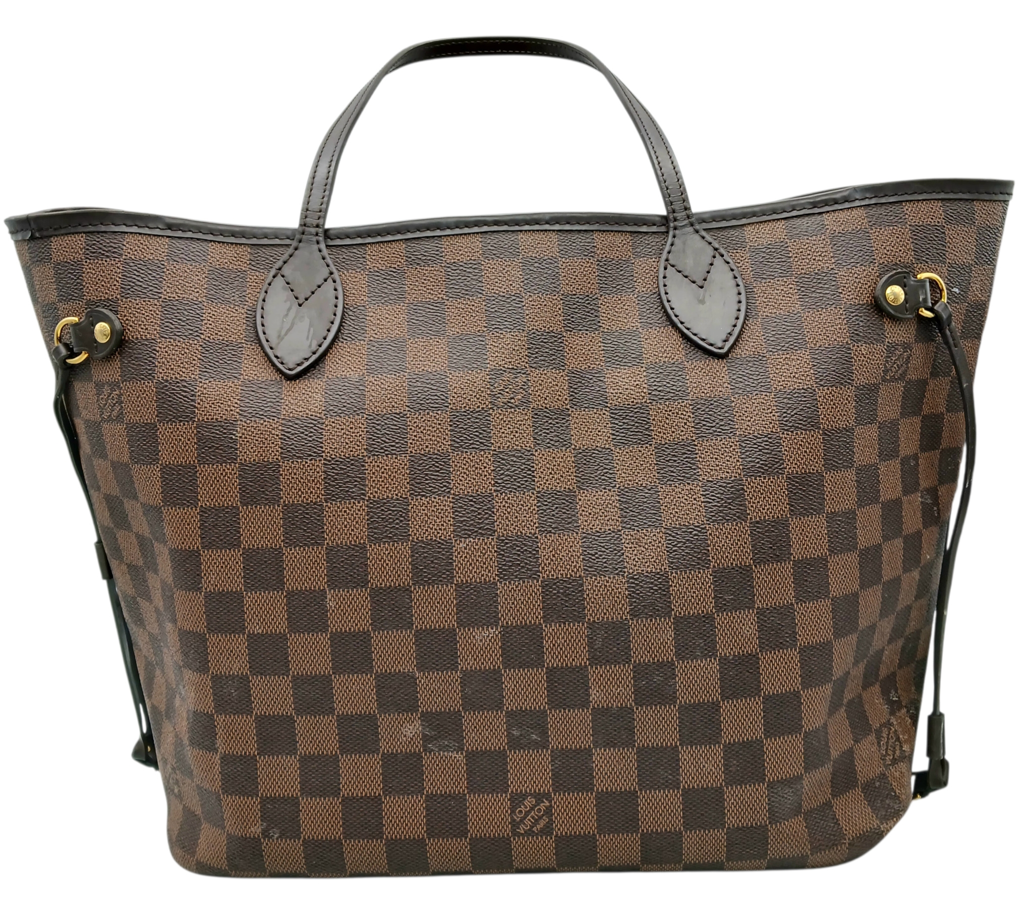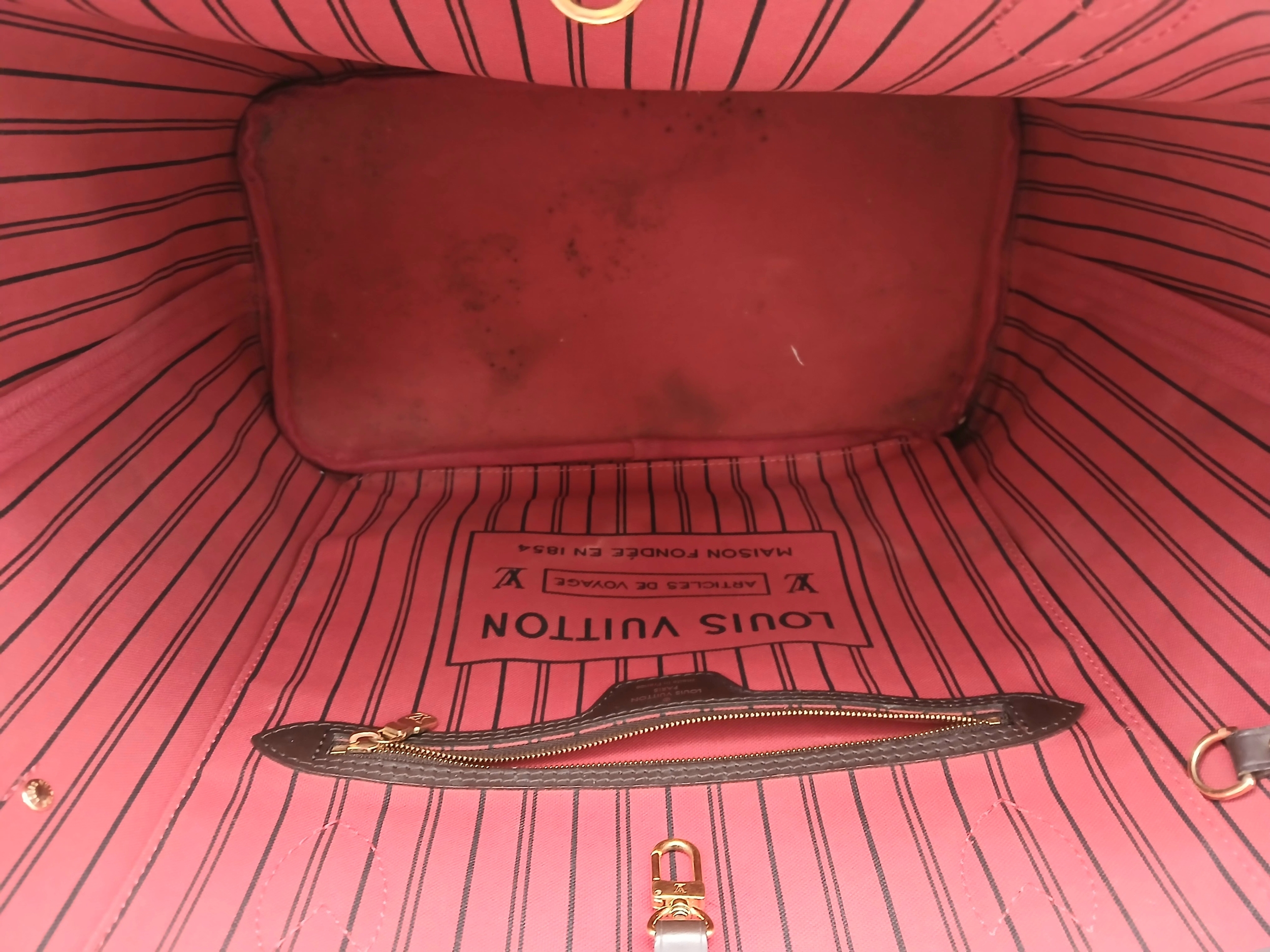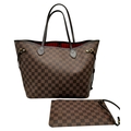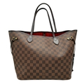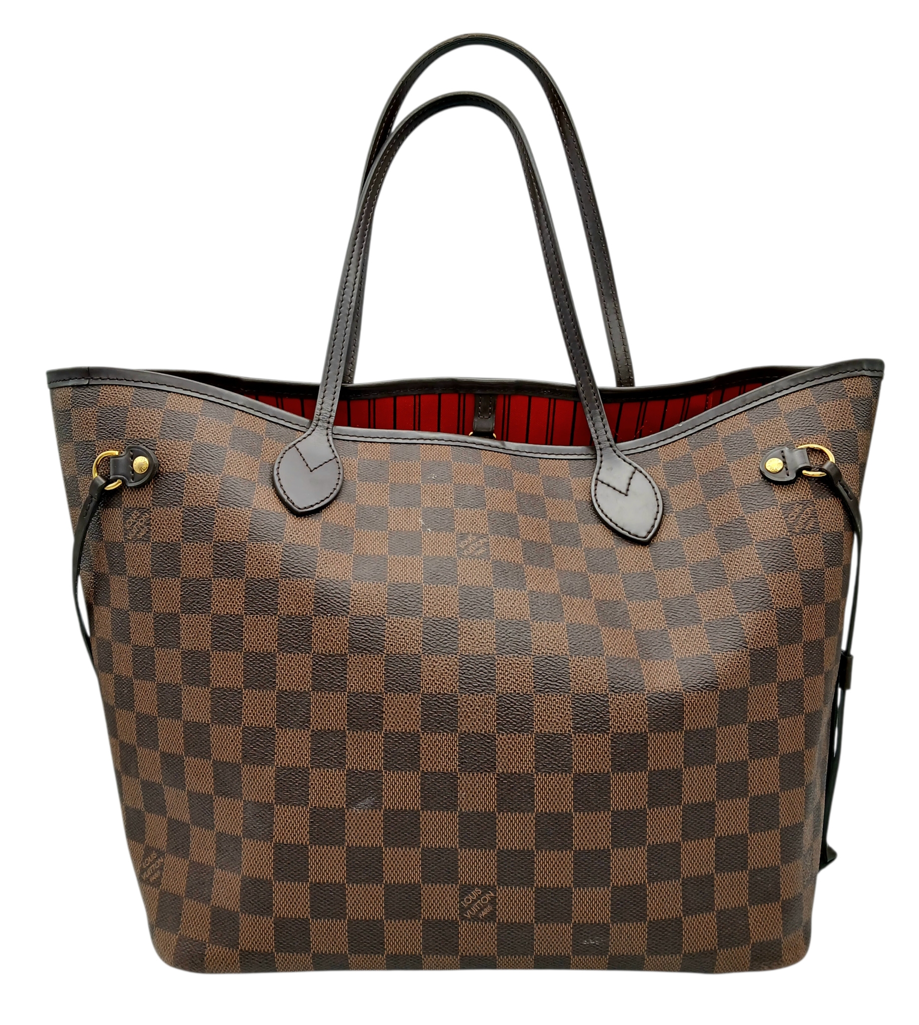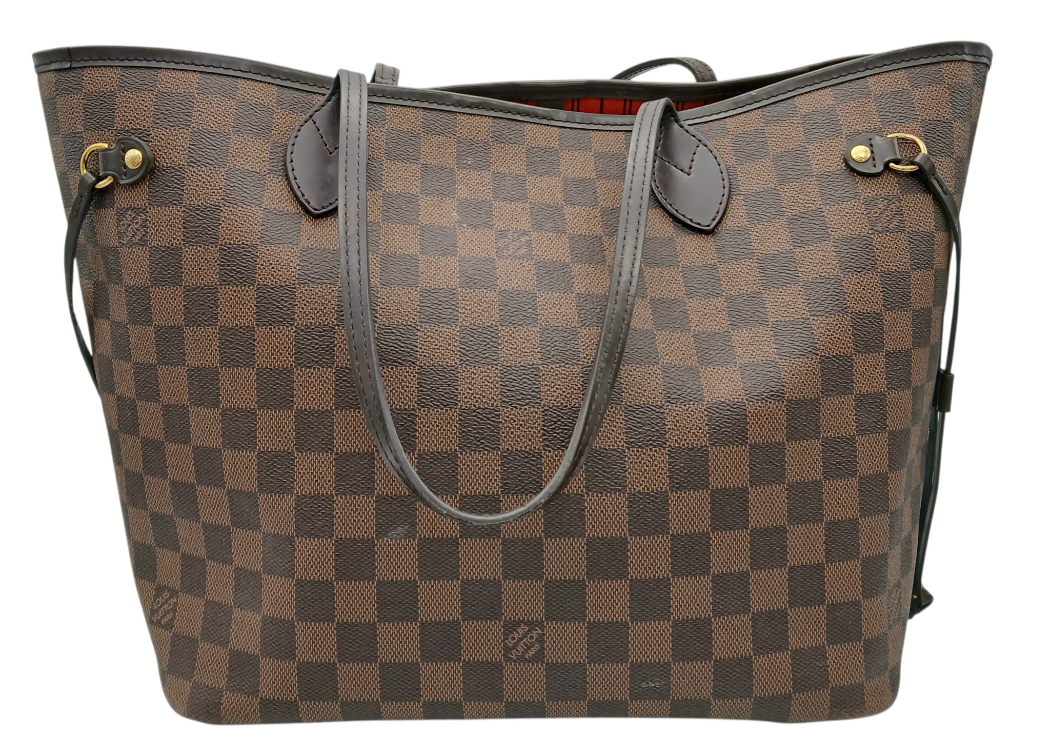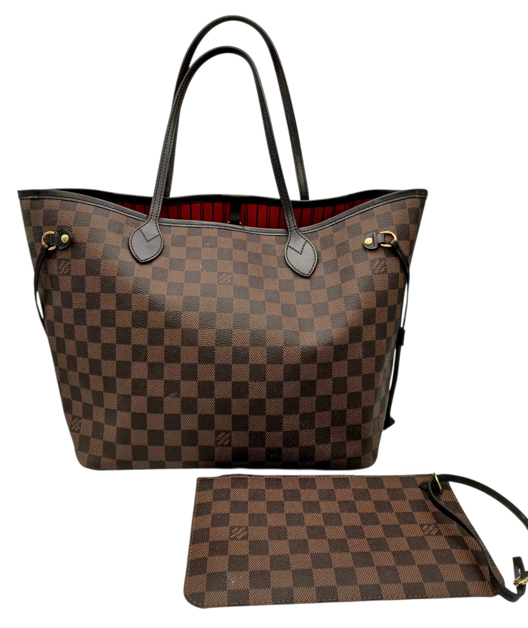A Louis Vuitton Neverfull Damier Ebene Bag. Coated canvas exterior with leather trim, gold-toned hardware, two thin leather handles and a clasp closure. Red textile interior with a large zipped inner flap compartment. Comes with matching Louis Vuitton damier ebene pouch and certificate of authenticity. Approximately 46.5cm length x 29cm height bag, 25cm length x 15.5cm height pouch. Stains to the interior and minor white marks to the exterior - please see photos or request a condition report. Ref: 27427