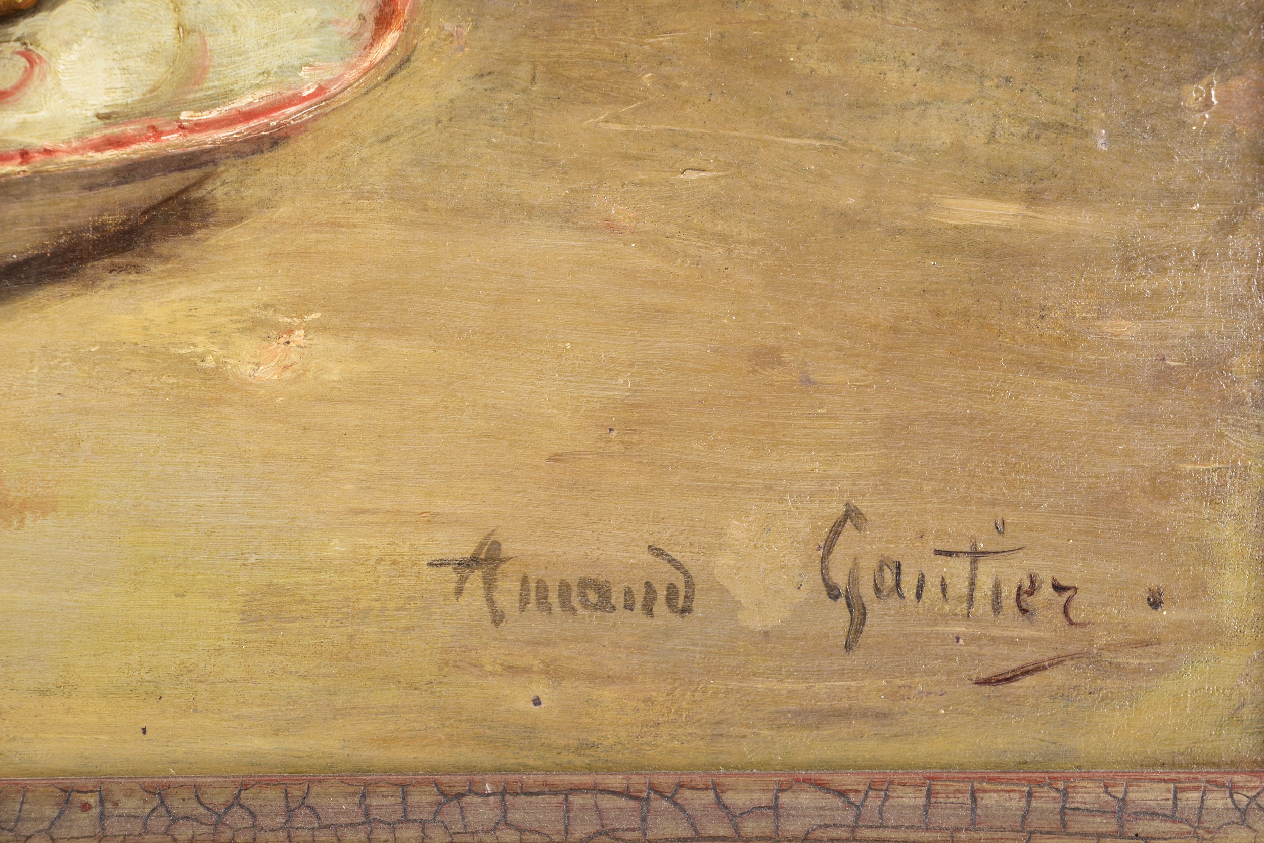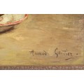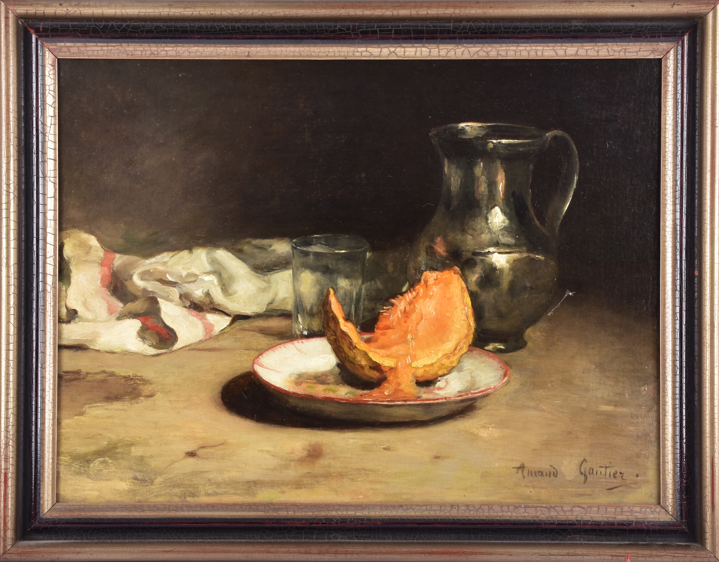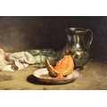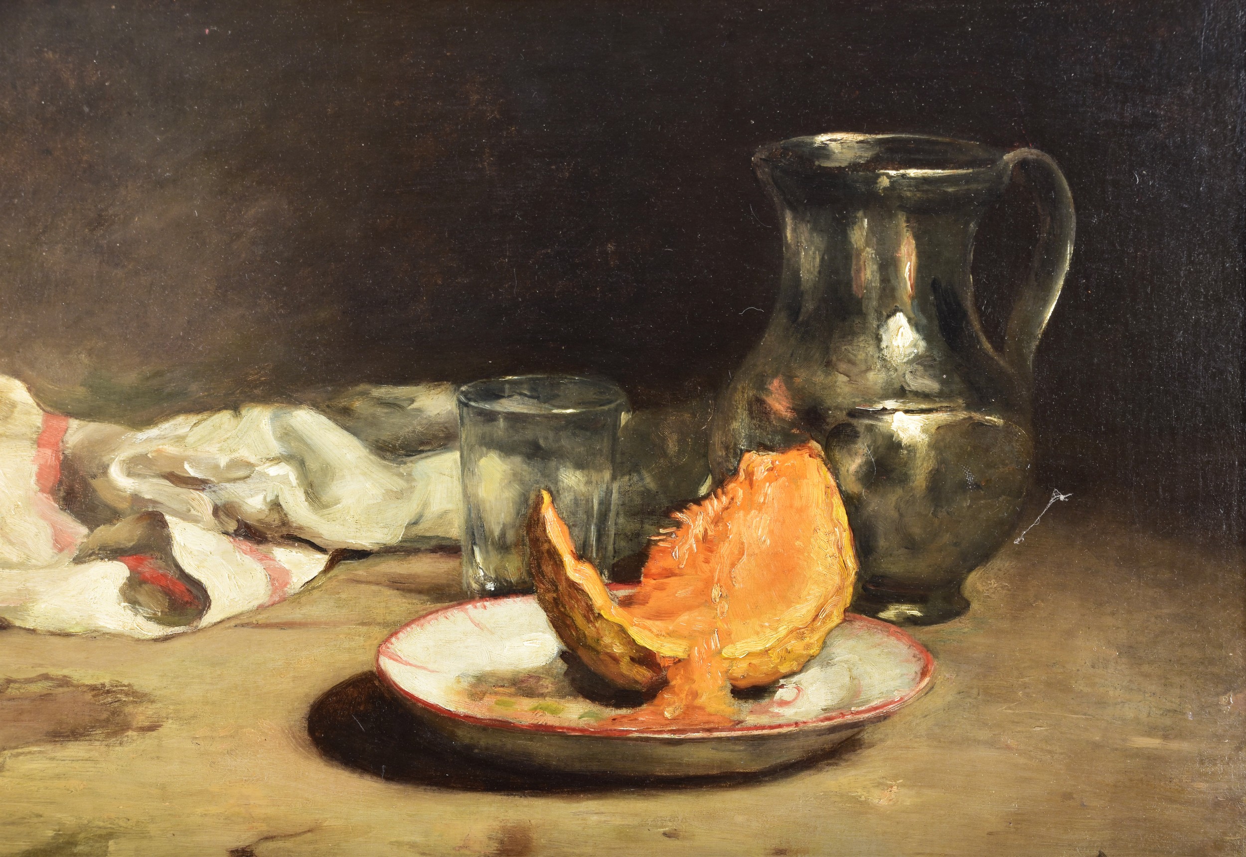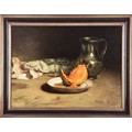 a still life of food and drink, all on board, signed lower right, in later black and gilded frame, 54 x 39cm.