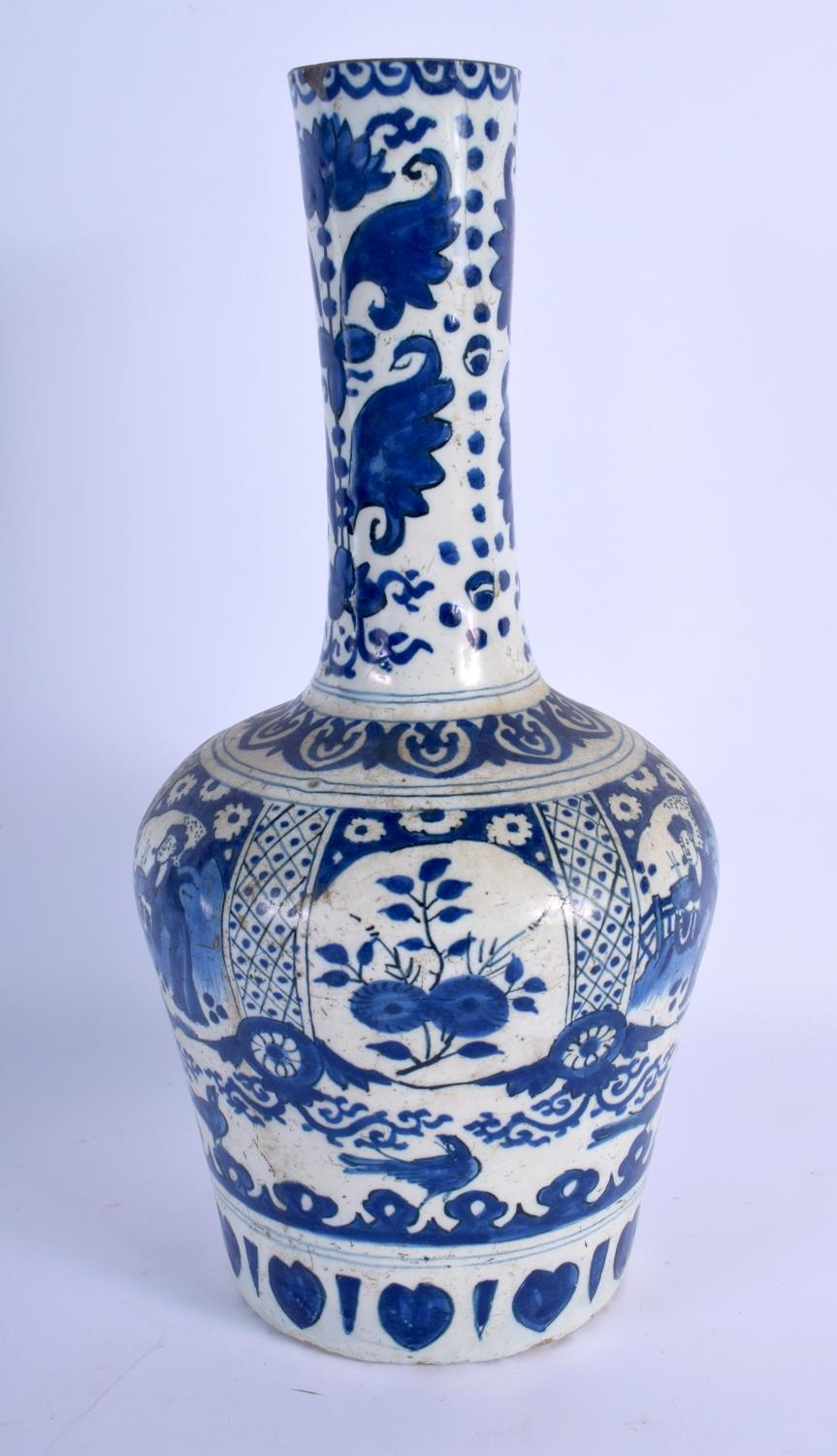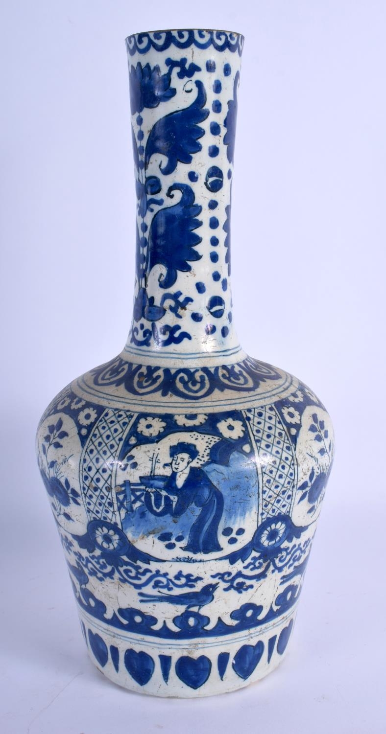 AN 18TH CENTURY DUTCH TIN GLAZED DELFT BLUE AND WHITE BOTTLE VASE painted with figures. 29 cm high.