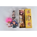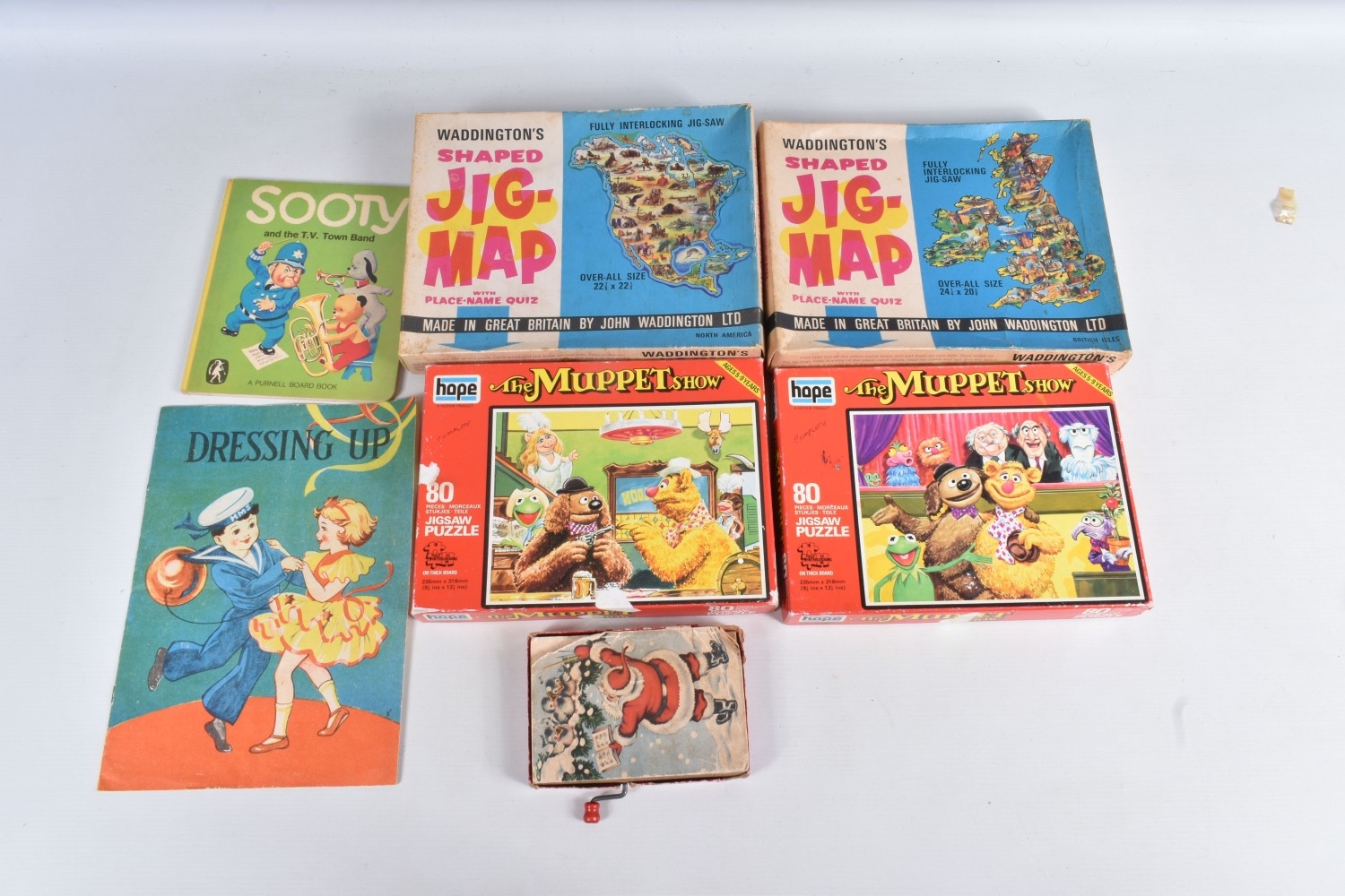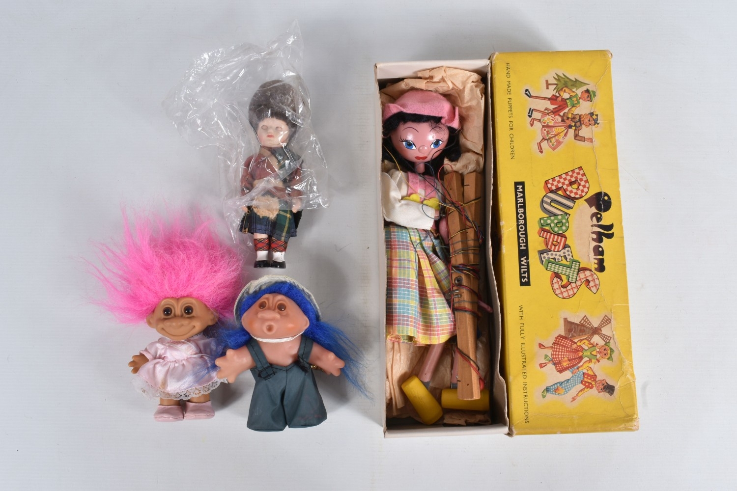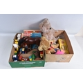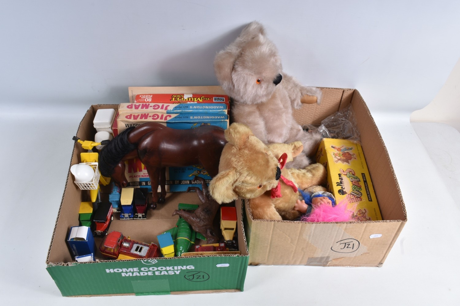 A QUANTITY OF ASSORTED TOYS AND PUZZLES ETC., to include two Merrythought for Harrods plush teddy bears, golden plush bear, approx. 40cm tall and Champagne plush bear, approx. 45cm, both in good condition, boxed Pelham SS Tyrolean Girl puppet, in good condition, yellow lidded box with damage and wear, two modern Troll figures, one by Damm, Scottish collectors souvenir doll, some fading to costume, Pedigree Sindy Horse, similar style dog and moped, quantity of assorted playworn diecast vehicles including Corgi Toys Volkswagen Beetle 1200 German Police car, No.373, Matchbox Models of Yesteryear, Lledo Days Gone etc., two boxed Hope 'The Muppet Show' jigsaws and two boxed Waddington Shaped Jig-Map jigsaws, contents not checked, minor damage and wear to boxes (2 boxes)