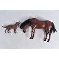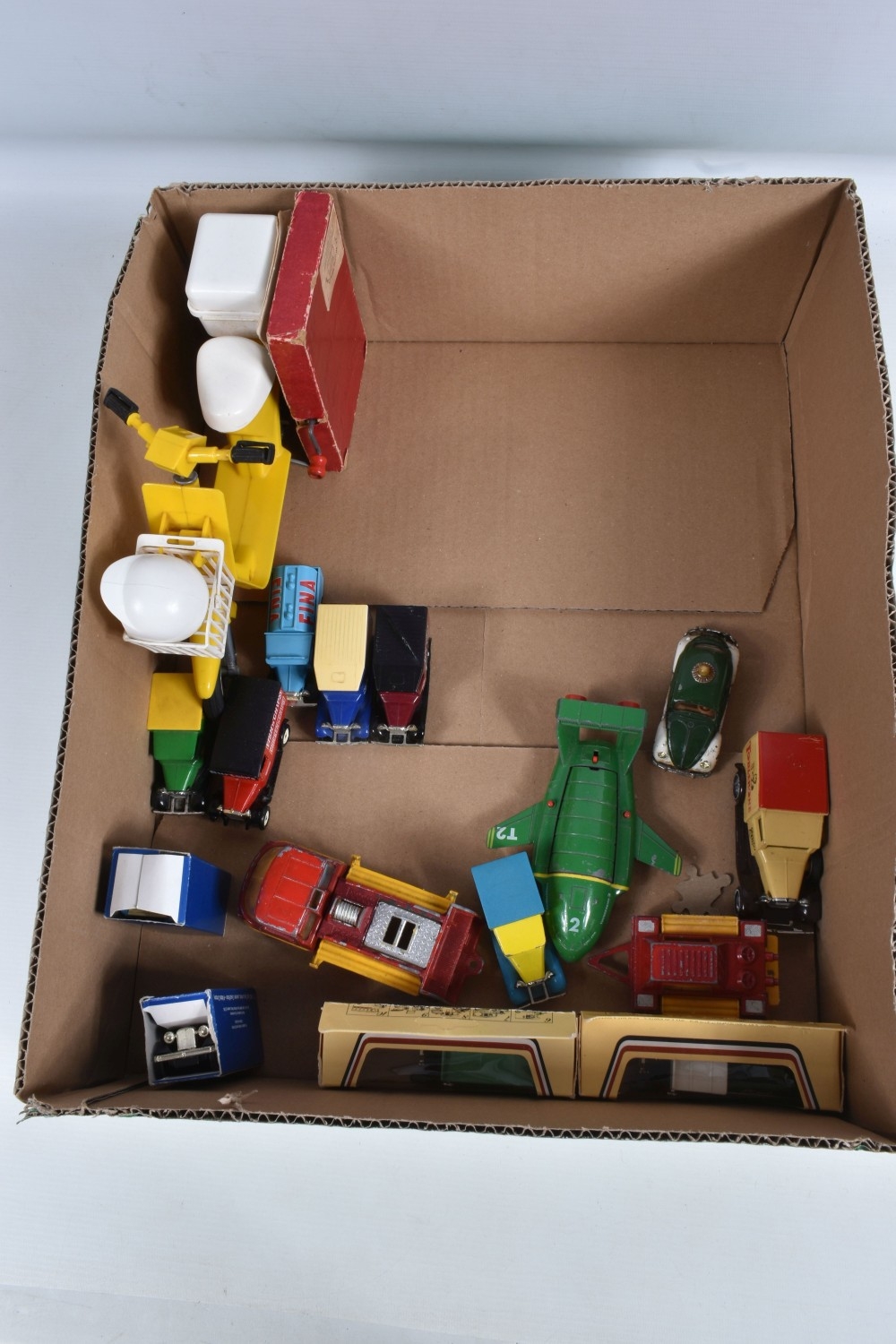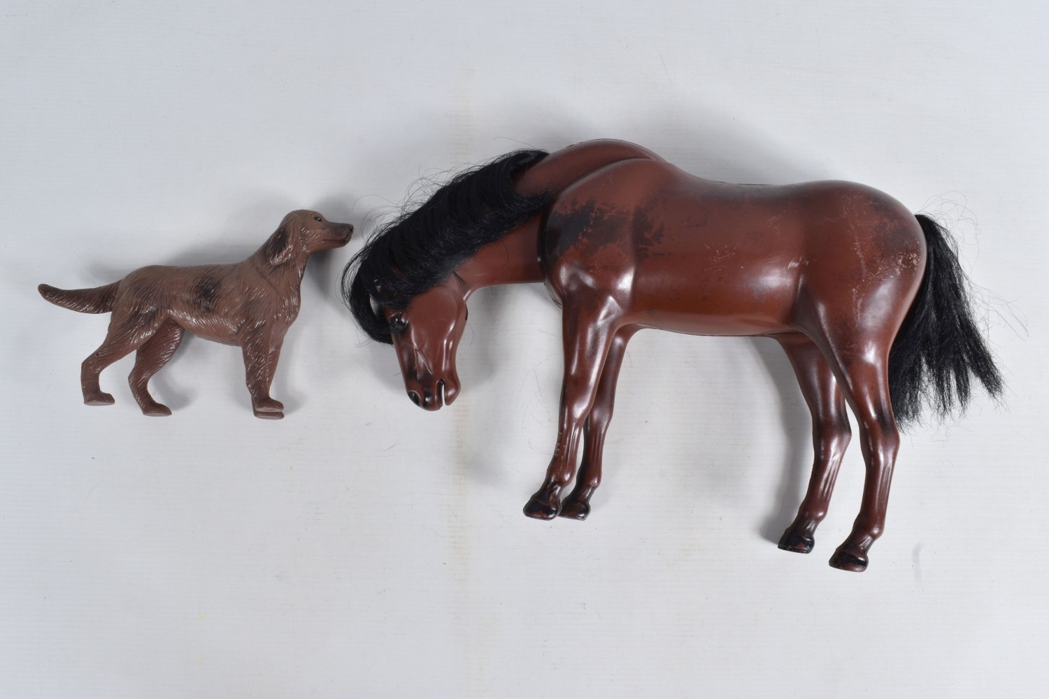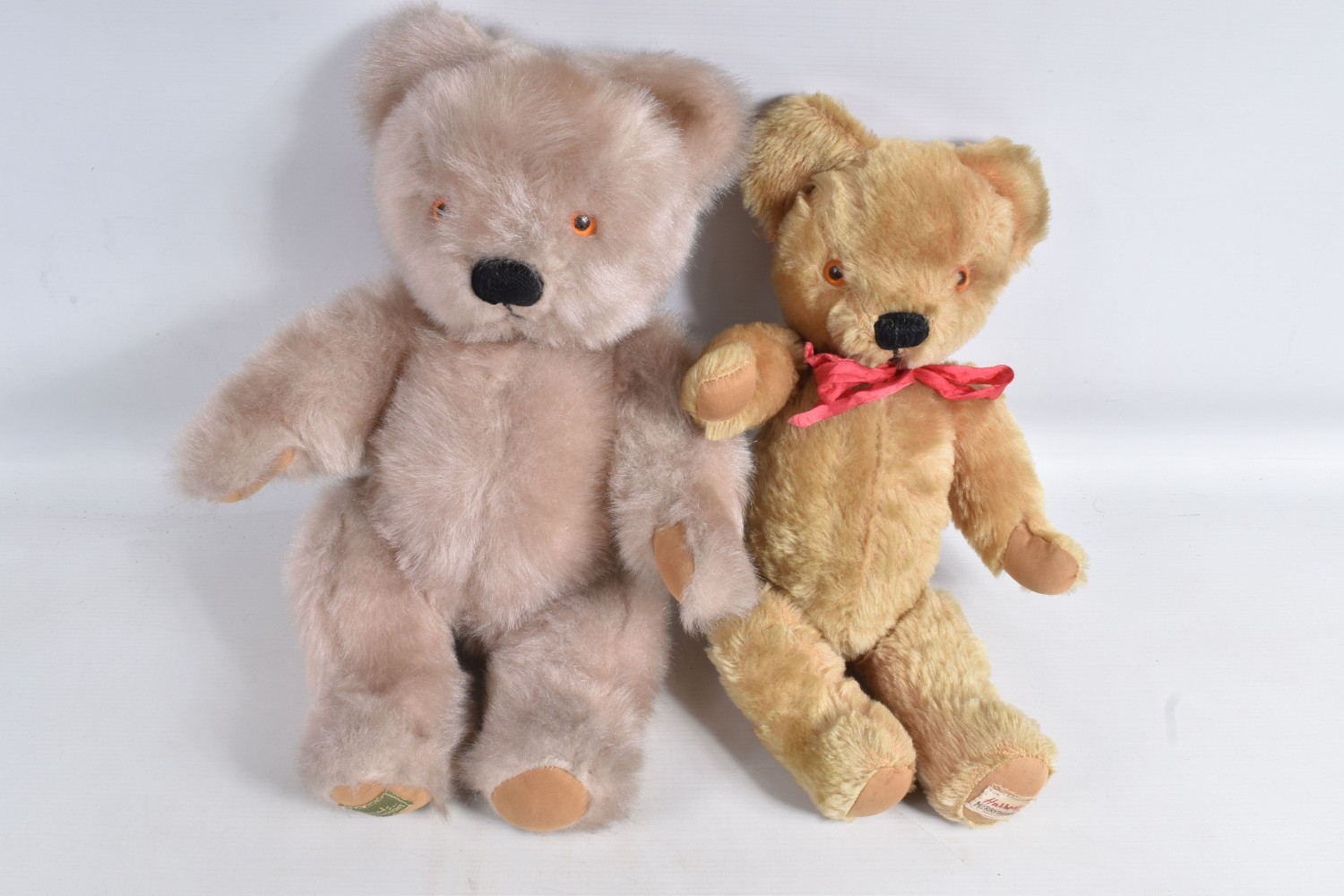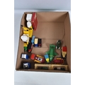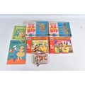 A QUANTITY OF ASSORTED TOYS AND PUZZLES ETC., to include two Merrythought for Harrods plush teddy bears, golden plush bear, approx. 40cm tall and Champagne plush bear, approx. 45cm, both in good condition, boxed Pelham SS Tyrolean Girl puppet, in good condition, yellow lidded box with damage and wear, two modern Troll figures, one by Damm, Scottish collectors souvenir doll, some fading to costume, Pedigree Sindy Horse, similar style dog and moped, quantity of assorted playworn diecast vehicles including Corgi Toys Volkswagen Beetle 1200 German Police car, No.373, Matchbox Models of Yesteryear, Lledo Days Gone etc., two boxed Hope 'The Muppet Show' jigsaws and two boxed Waddington Shaped Jig-Map jigsaws, contents not checked, minor damage and wear to boxes (2 boxes)