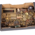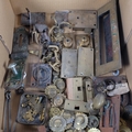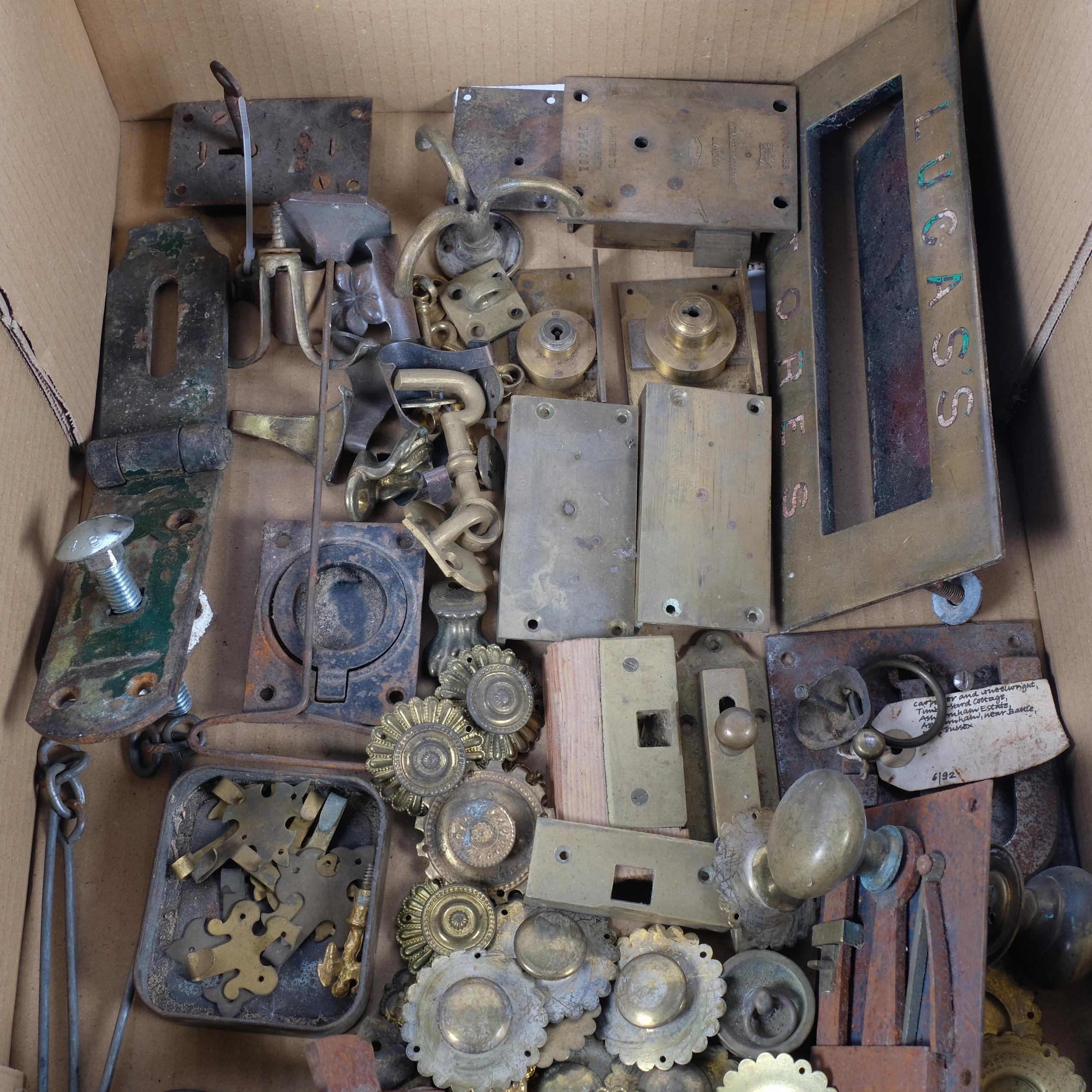 A box of various brassware, including door lock and handles, letterbox, hasp, various brass furniture mounts, etc