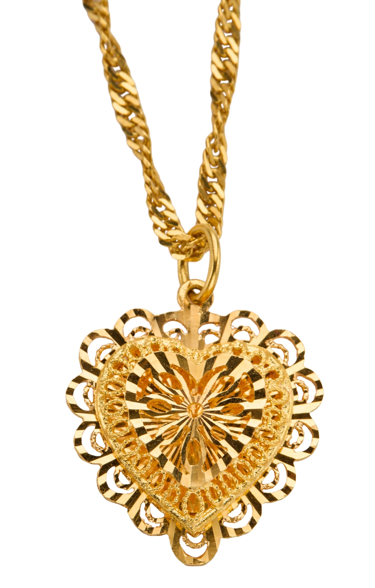 the pierced heart pendant approximately 30mm drop, on a diamond cut curb link chain, approximately 46cm long with bolt ring clasp, surface testing as 18ct, approximately 11.86 grams