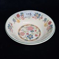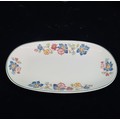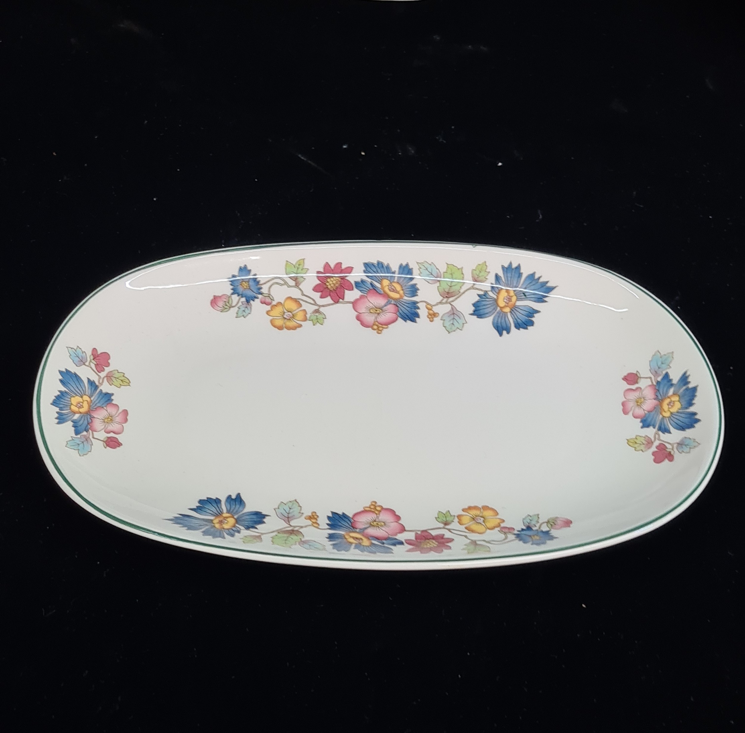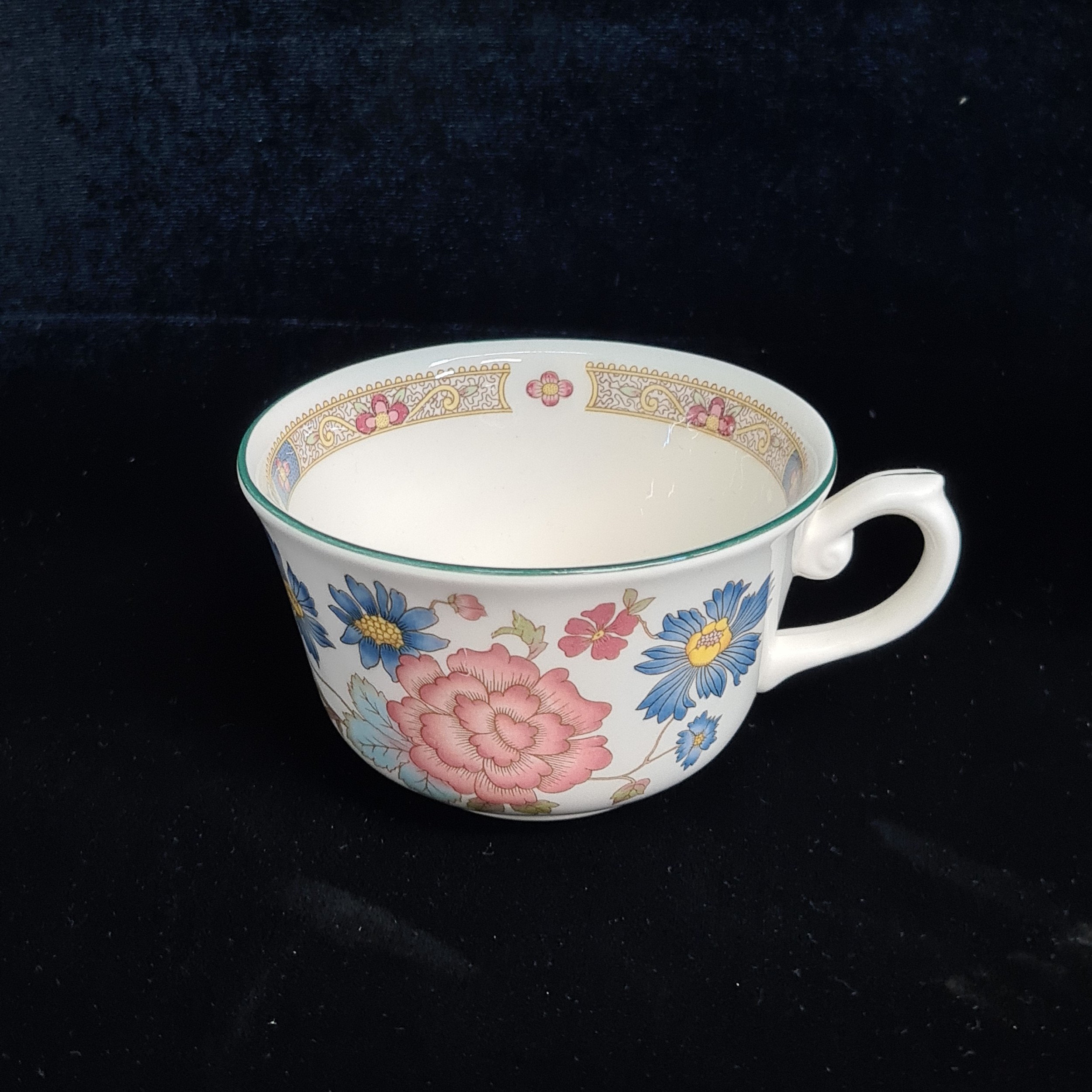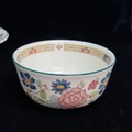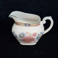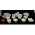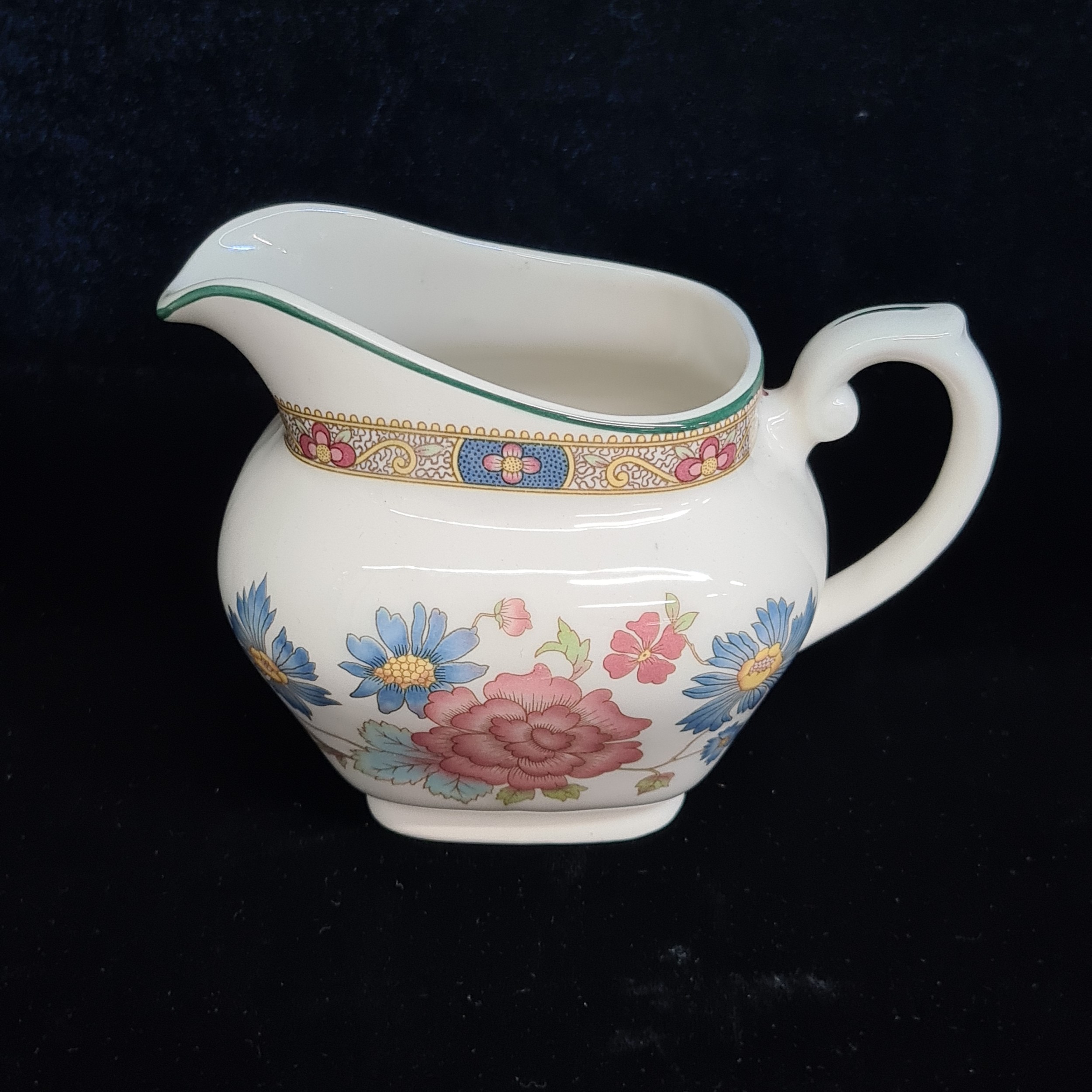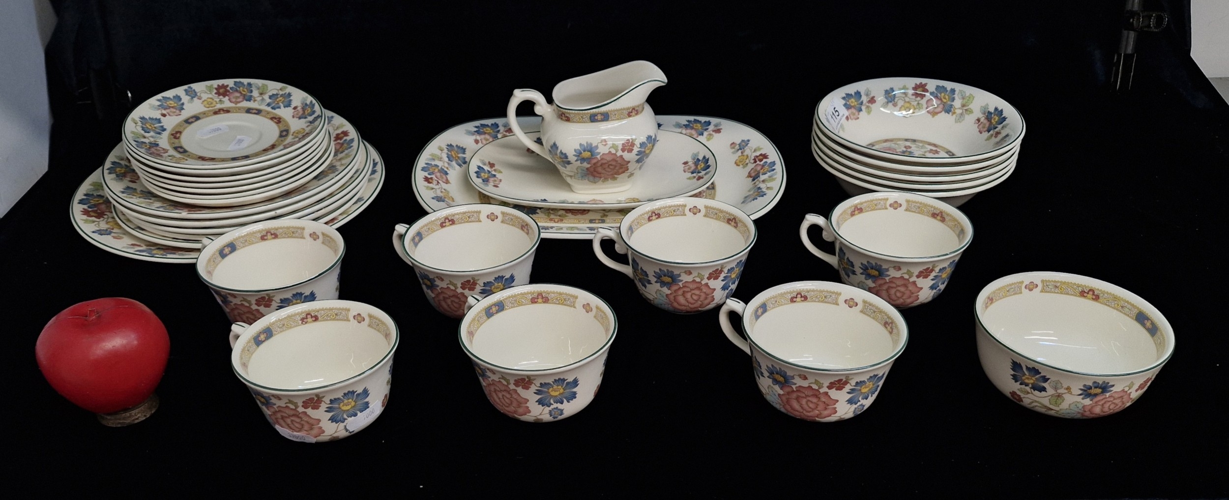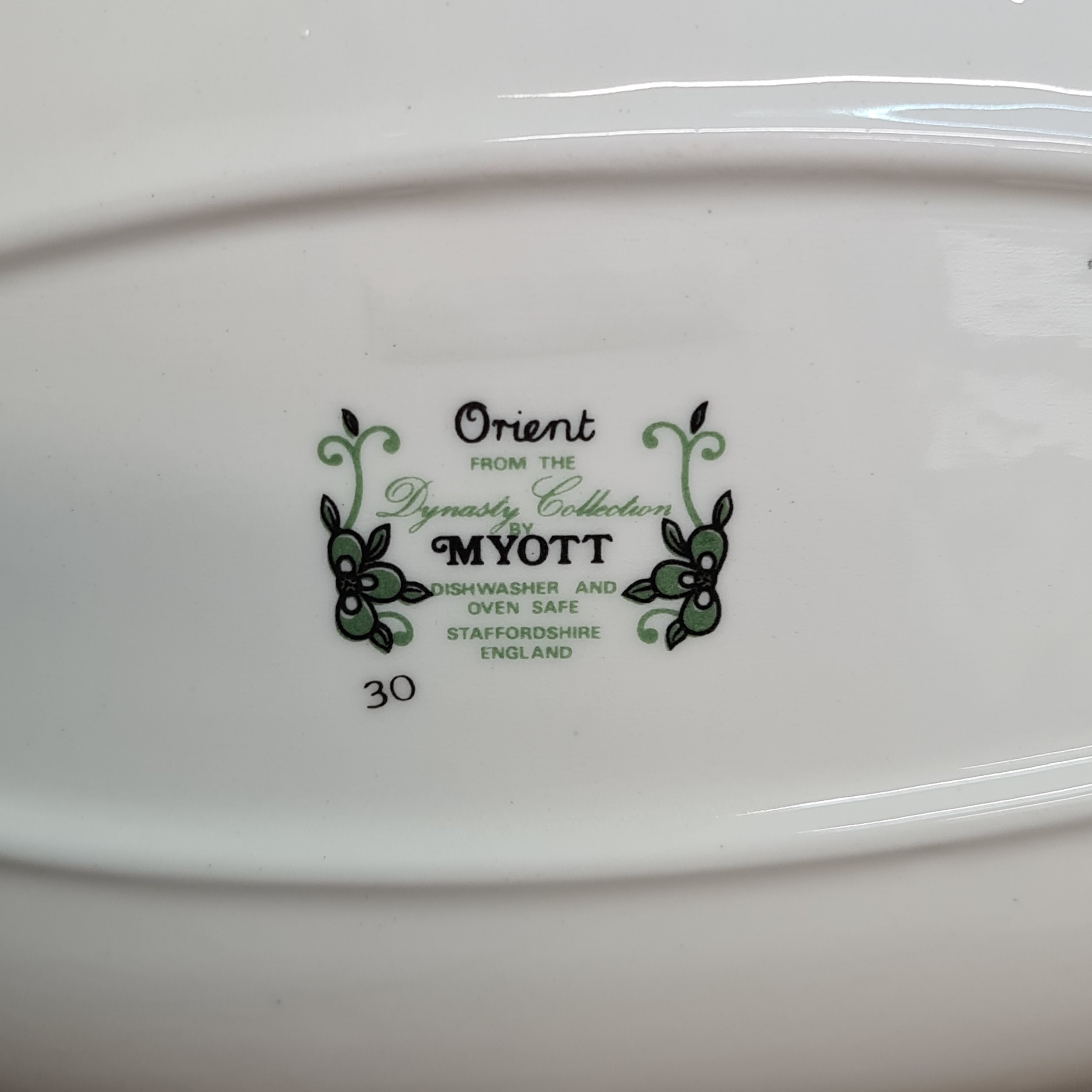 A Myott Staffordshire England part dinner service set in the "Orient" pattern from the Dynasty Collection. Features Blue, Pink, and Yellow floral pattern work throughout. Lot includes dinnerplates, sideplates, bowls, cups, serving platters and a jug. All in good condition with makers marks to base.