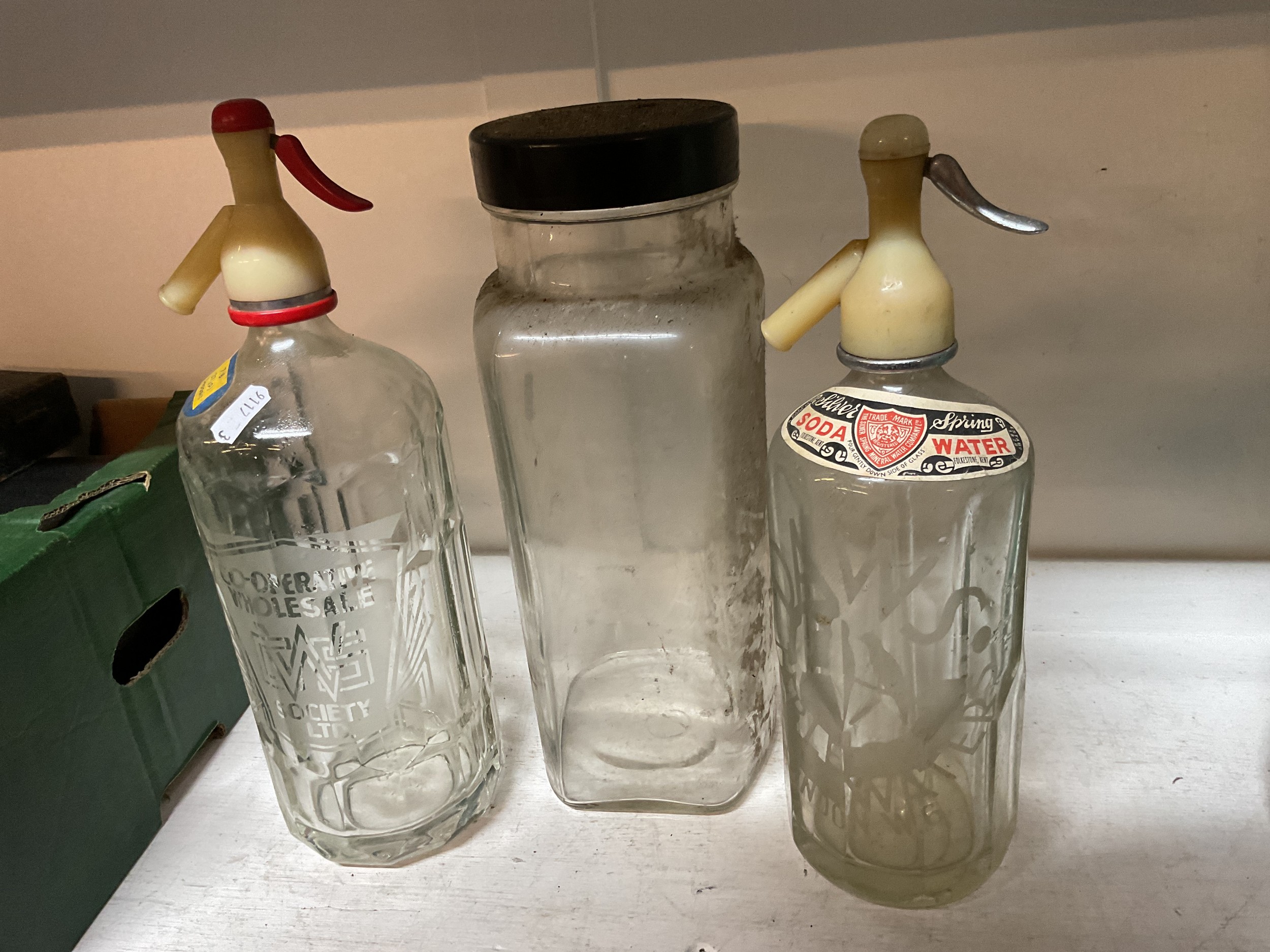 Two vintage soda syphons and a sweet jar