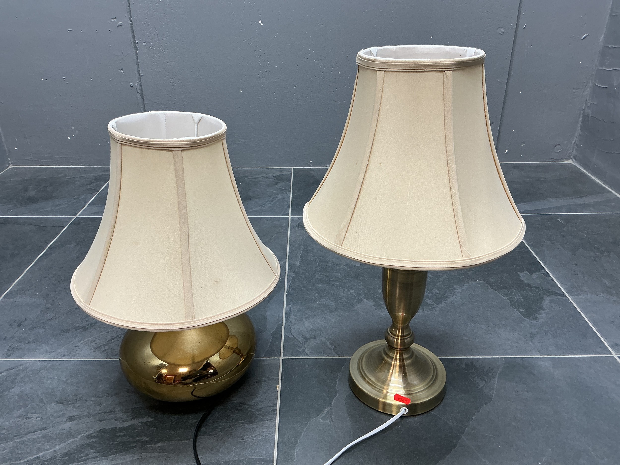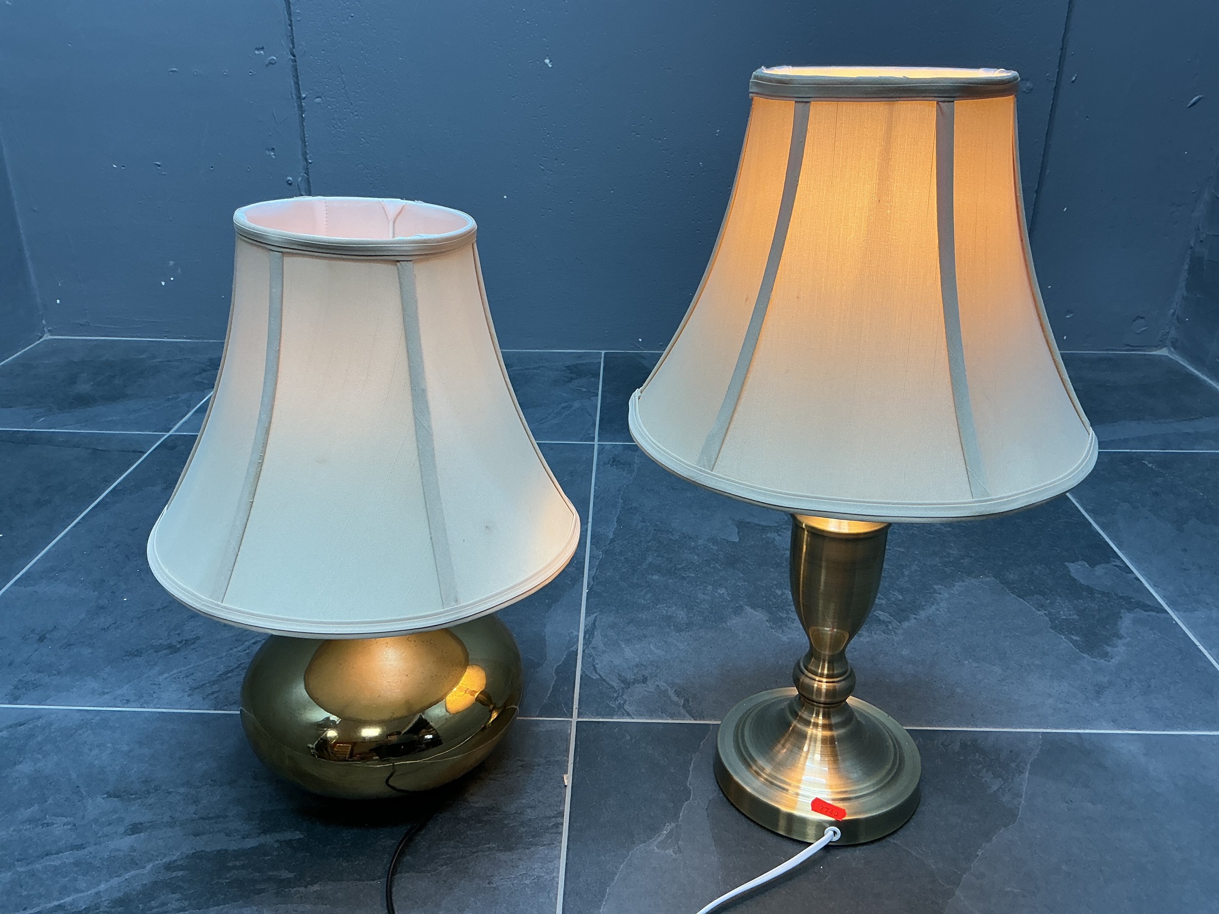 Pair of Contemporary Side Lamps to include a Brushed Brass Effect and a Gold Tone both with matching shades