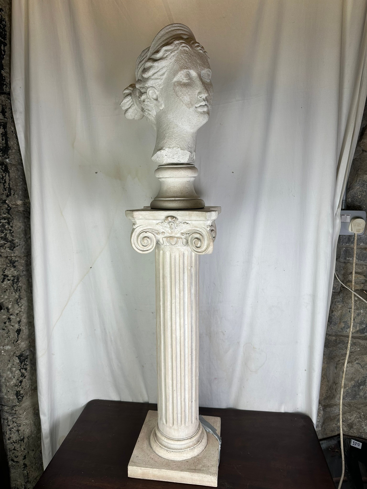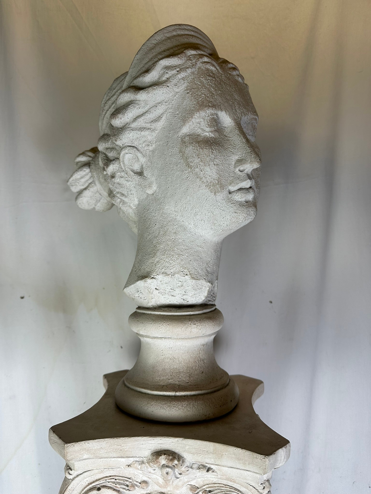 Bust of Diana, the Roman Goddess of the Hunt, wilderness and the moon. ona roman style column, 48'' overall
