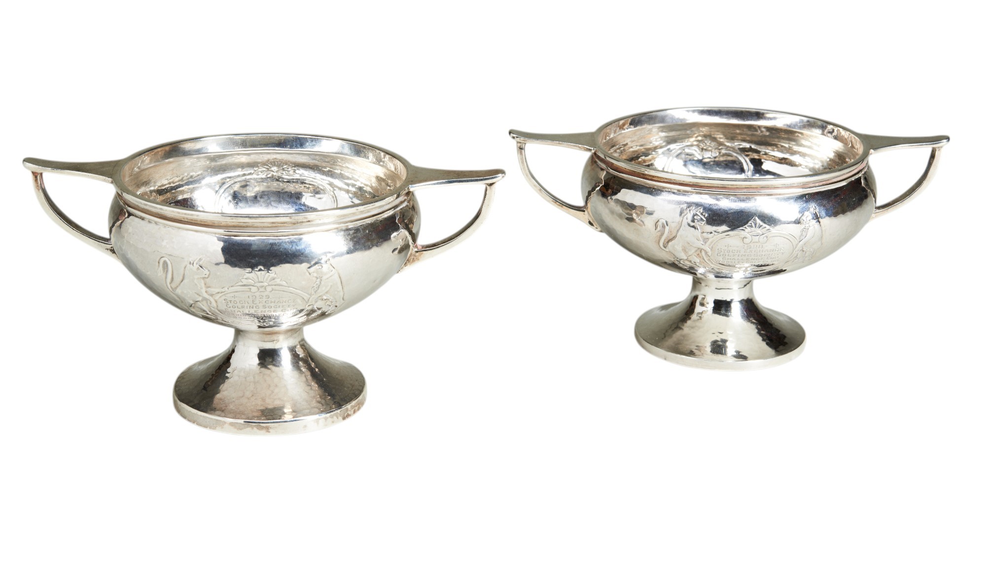 pair of hand planished two handled bowls with embossed and engraved inscription for the Stock Exchange Golf Society