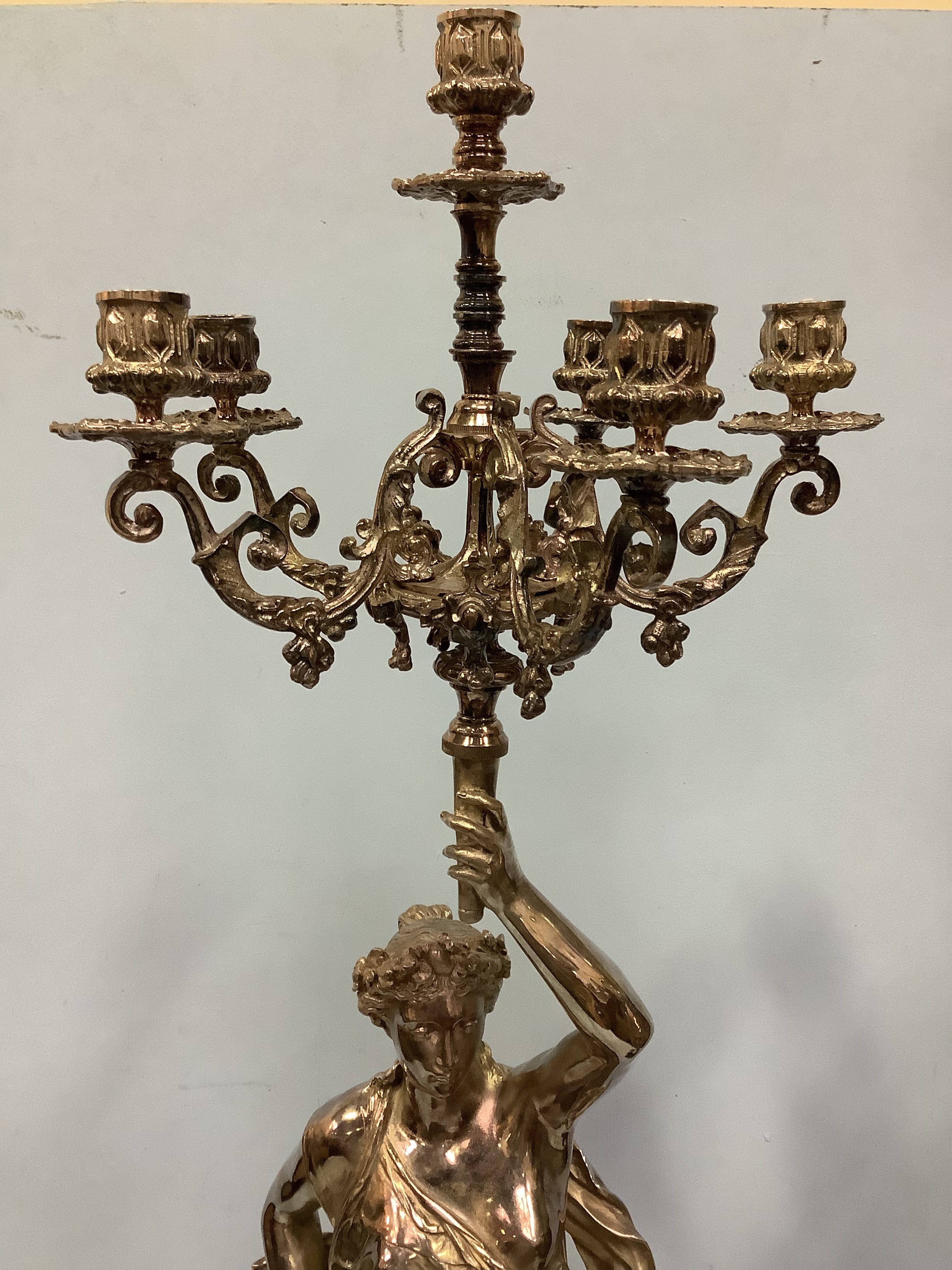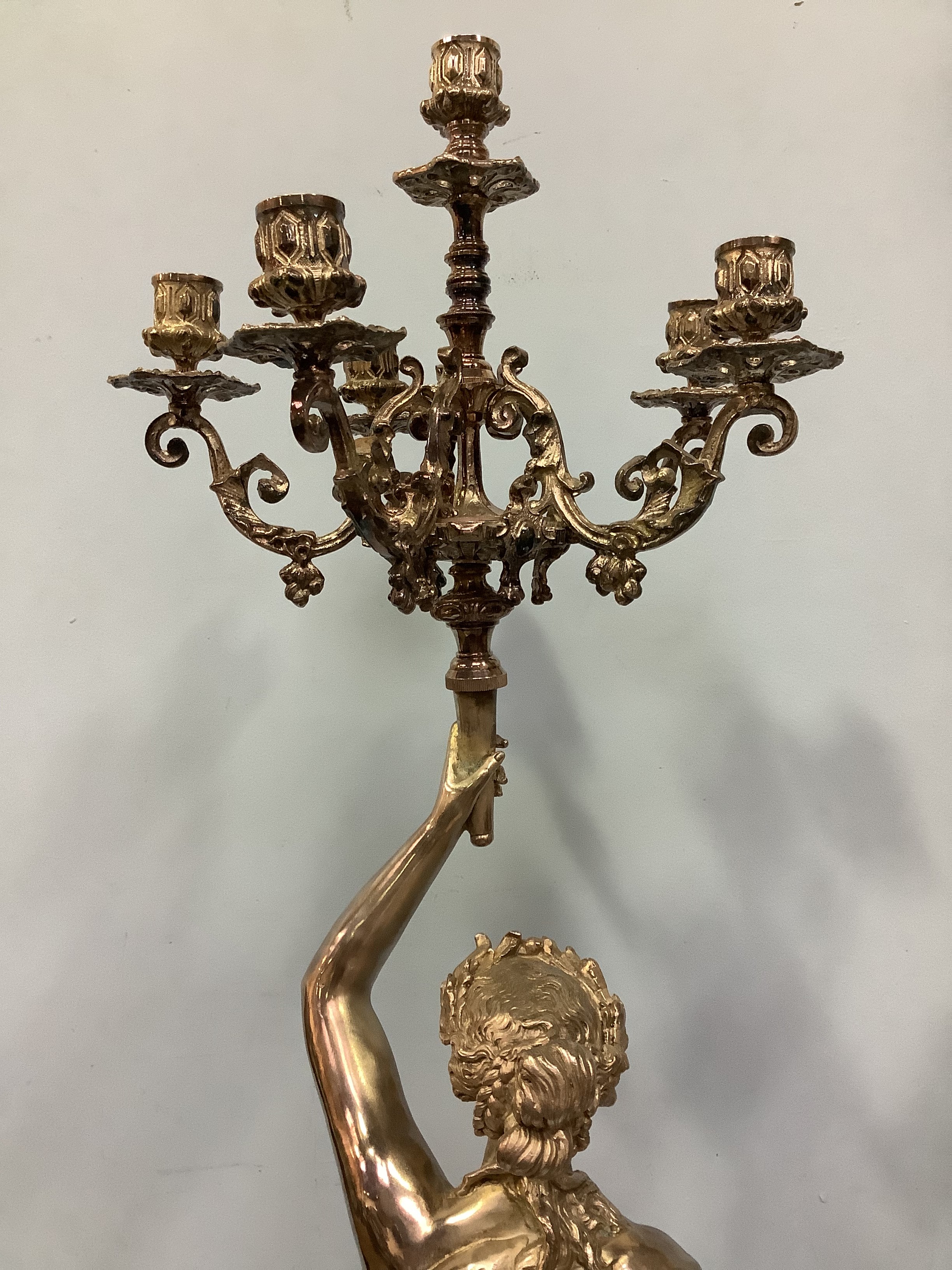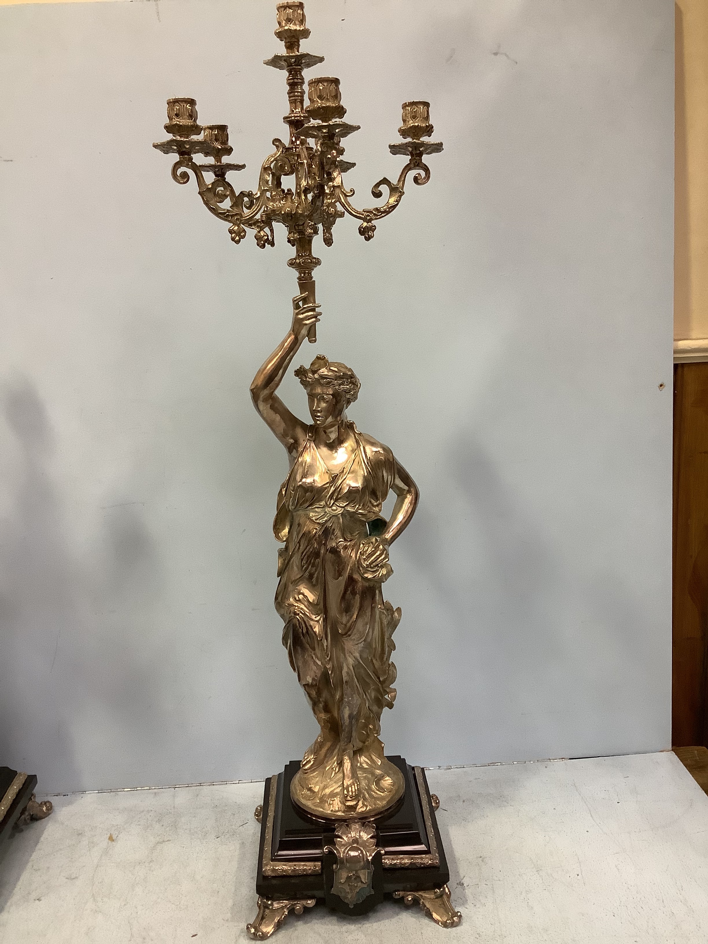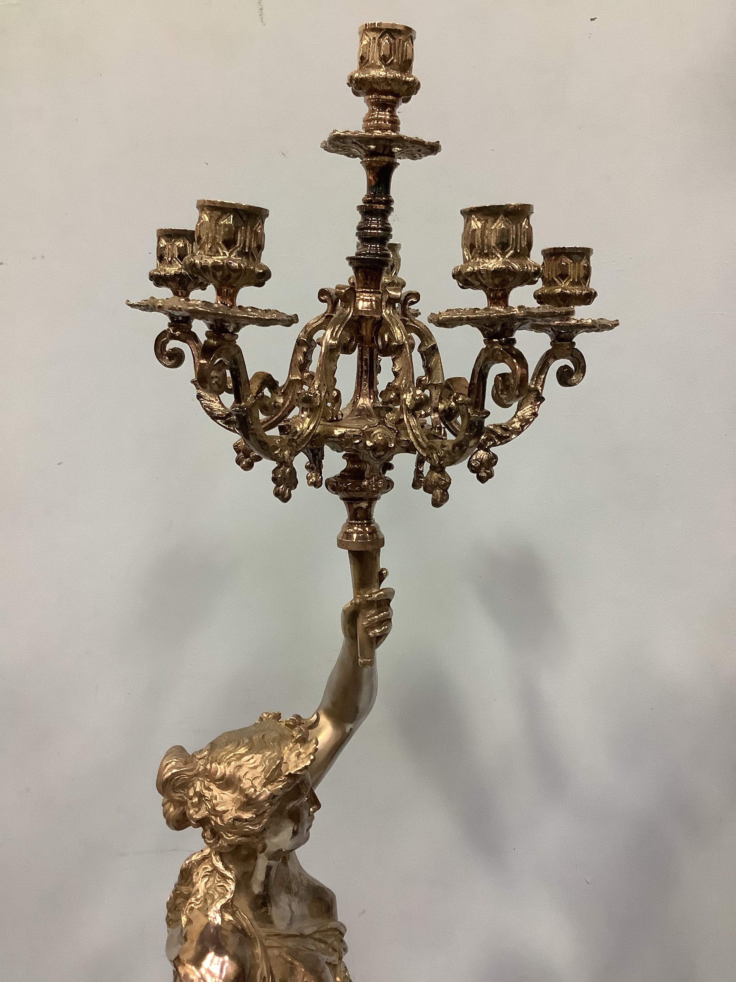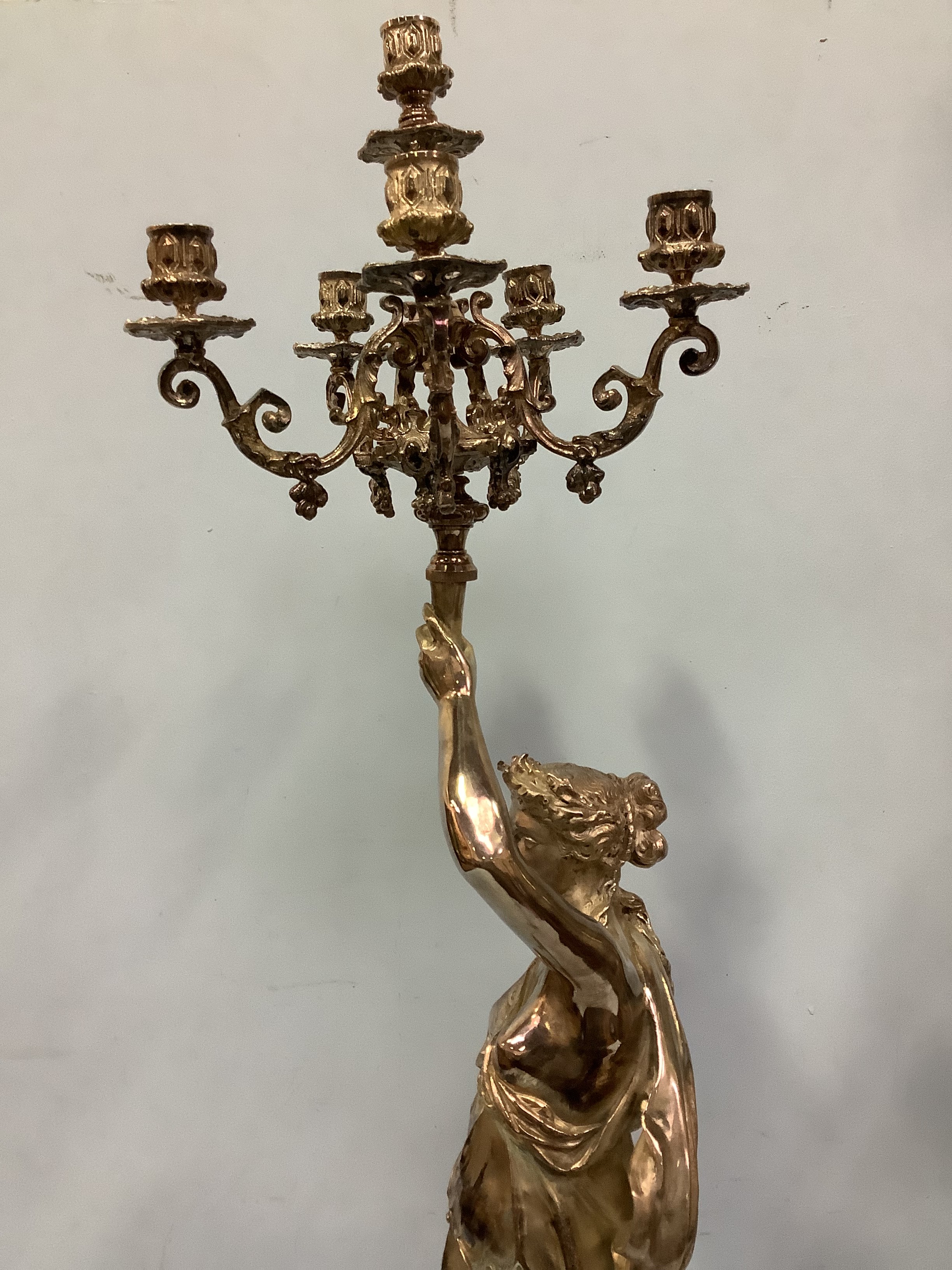 An imposing pair of silvered metal six-light candelabra after Jean-Louis Gregoire, modelled as Venus with a dolphin, the other without dolphin, both holding aloft torches with five branches and central light, raised on black marble bases with white metal mounts, 100cm tall
