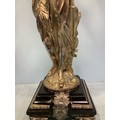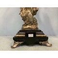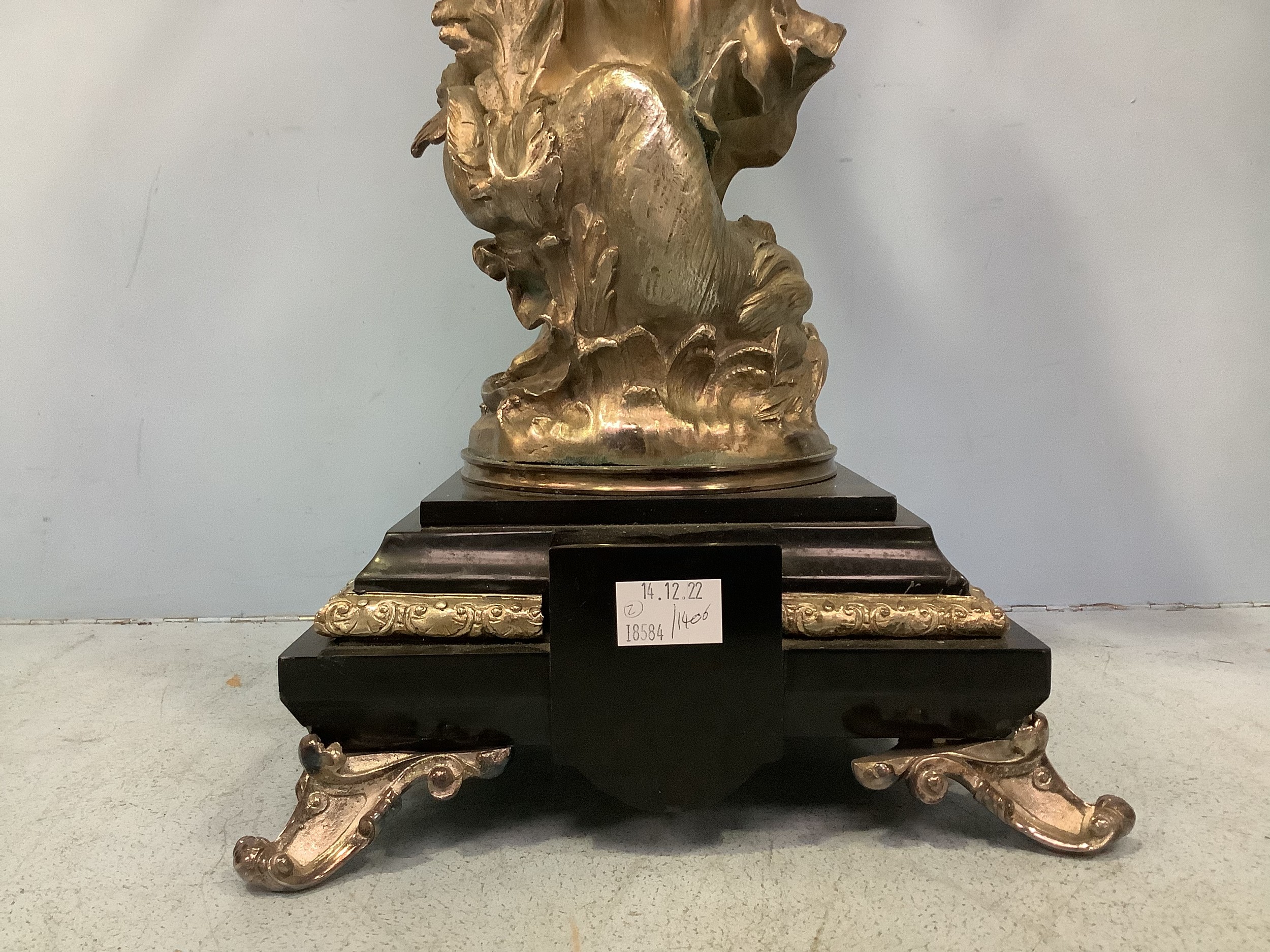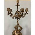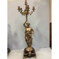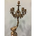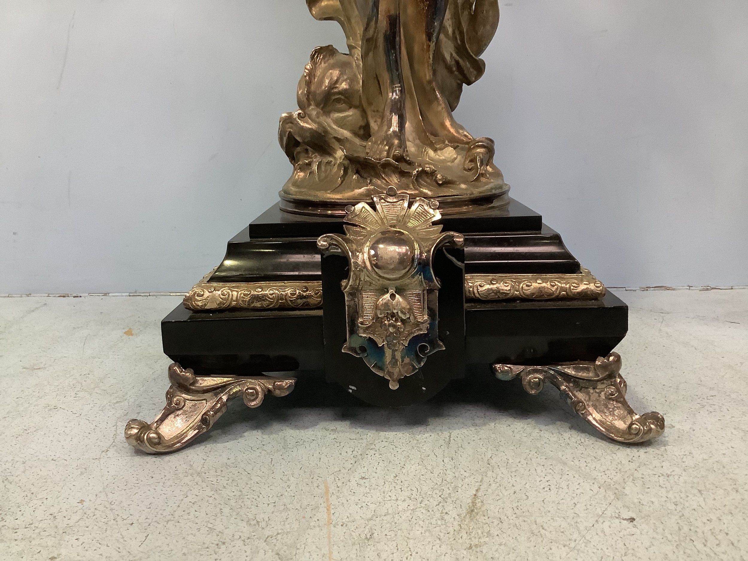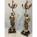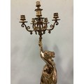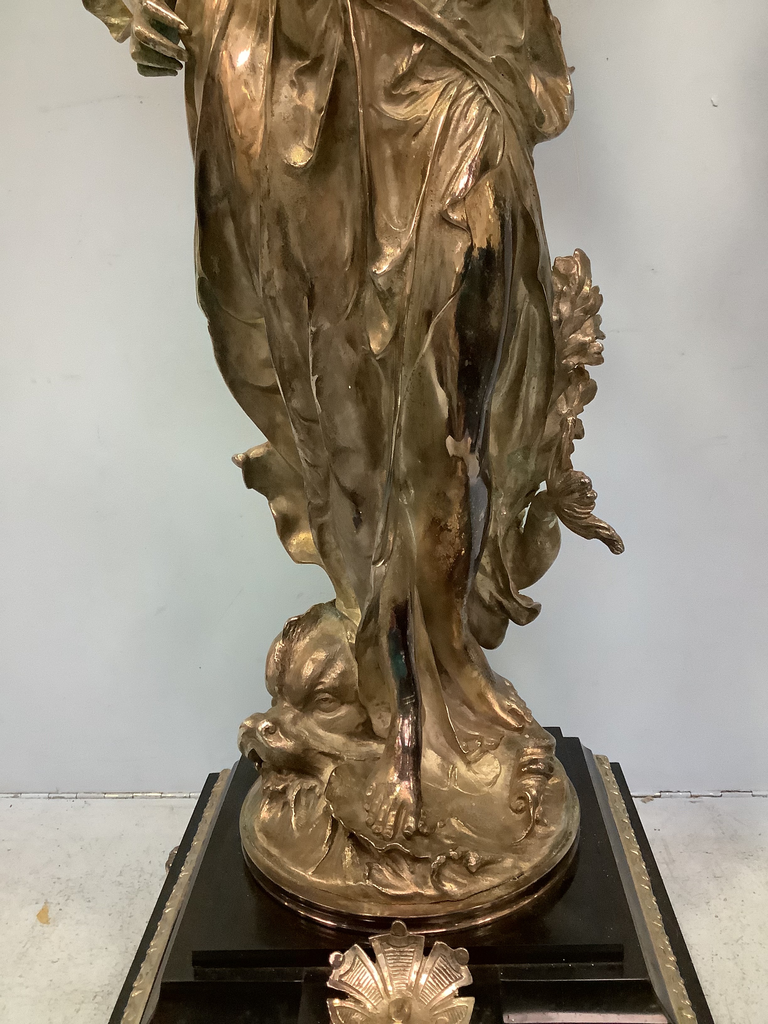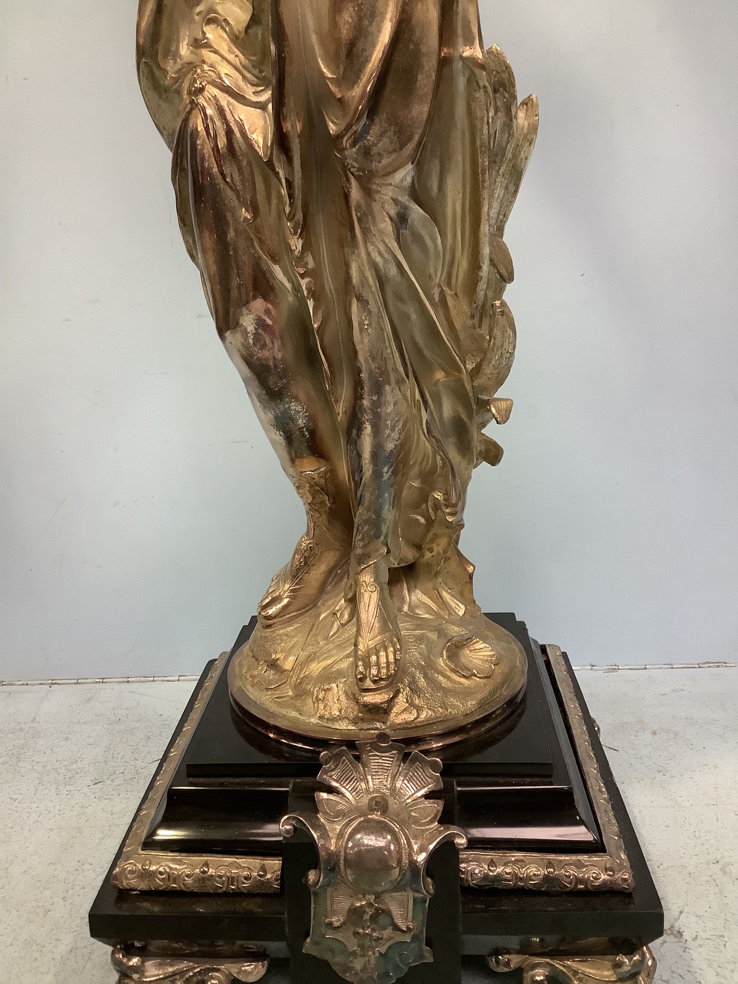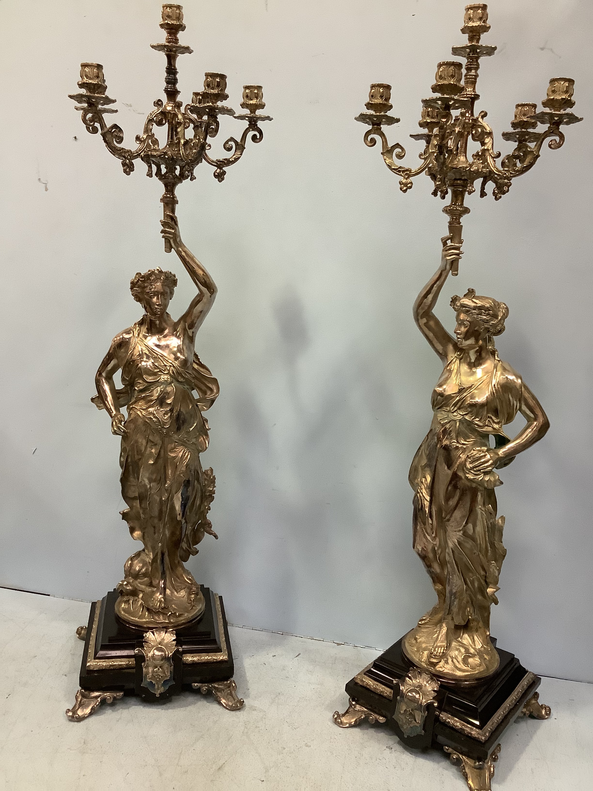 An imposing pair of silvered metal six-light candelabra after Jean-Louis Gregoire, modelled as Venus with a dolphin, the other without dolphin, both holding aloft torches with five branches and central light, raised on black marble bases with white metal mounts, 100cm tall