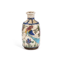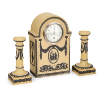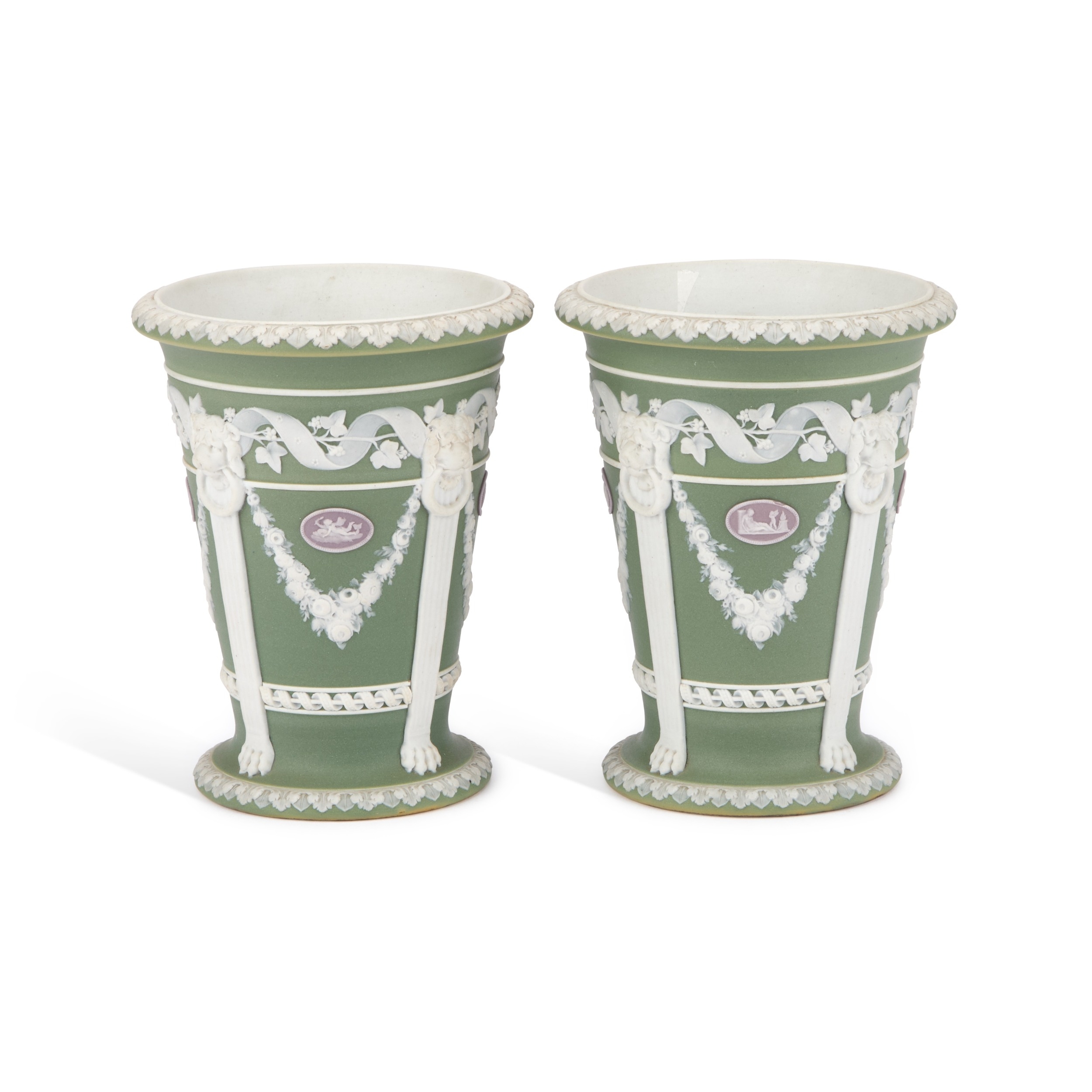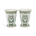 of tapering form, decorated in white with the 'Trophy' pattern on a green jasper ground, with small lilac oval vignettes sprigged in white, impressed marks. (2) 13cm high