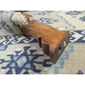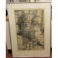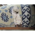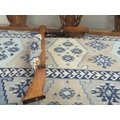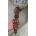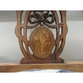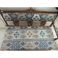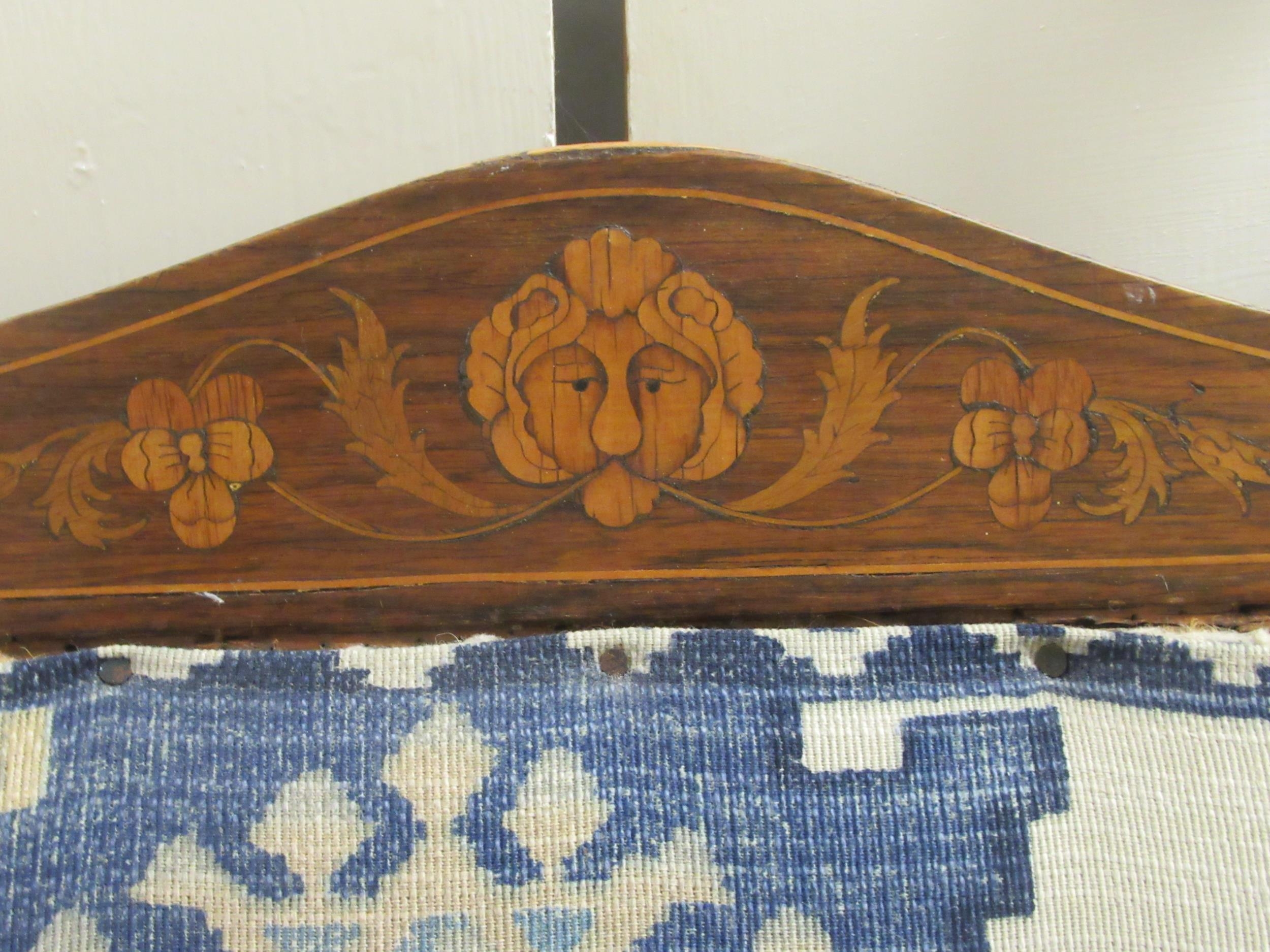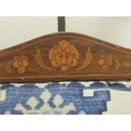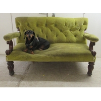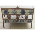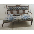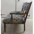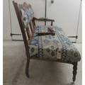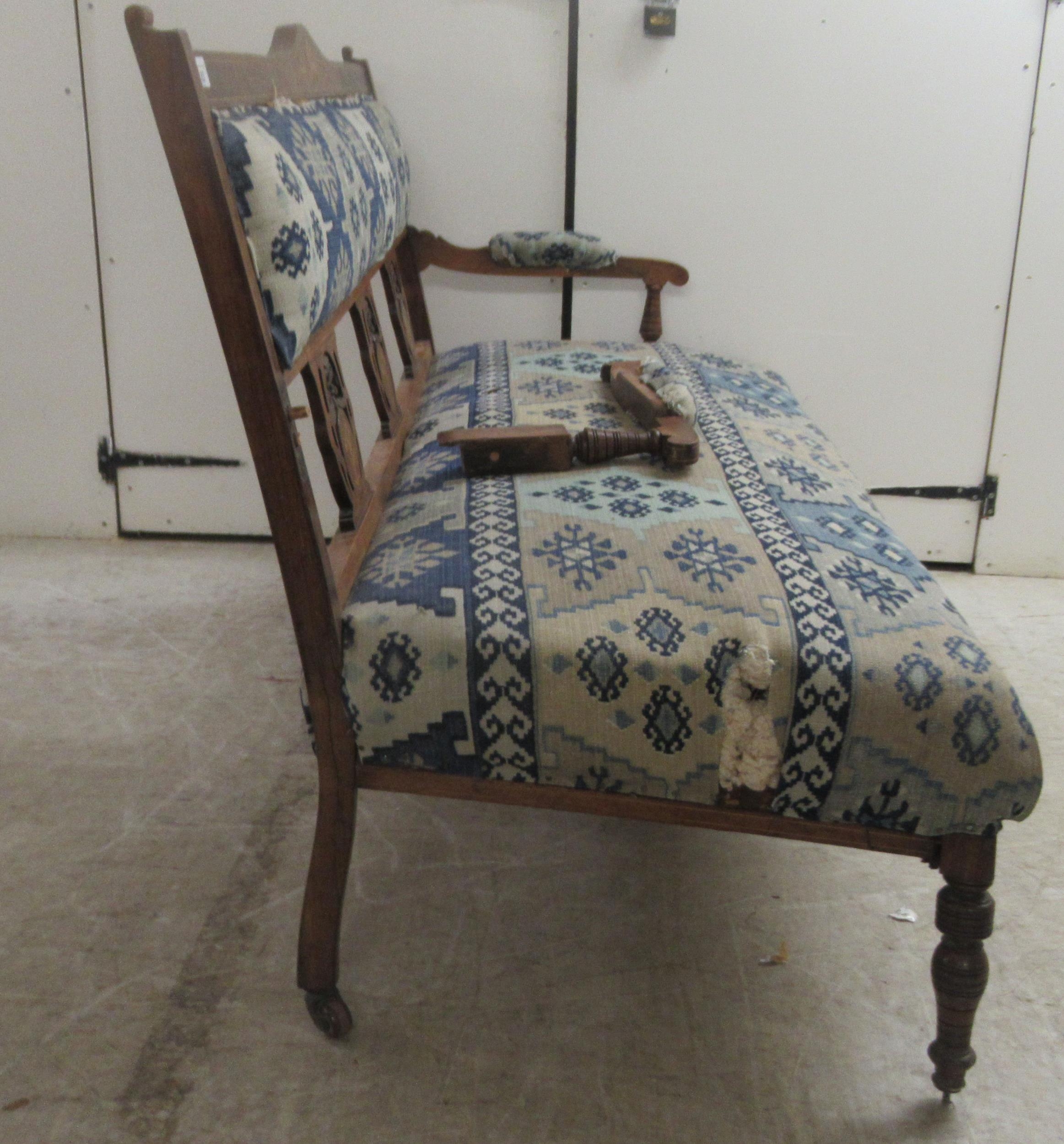 An Edwardian mahogany showwood framed three person settee, the later stylised patterned fabric upholstered back, arms and seats raised on turned forelegs and casters 54"w