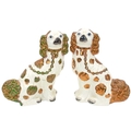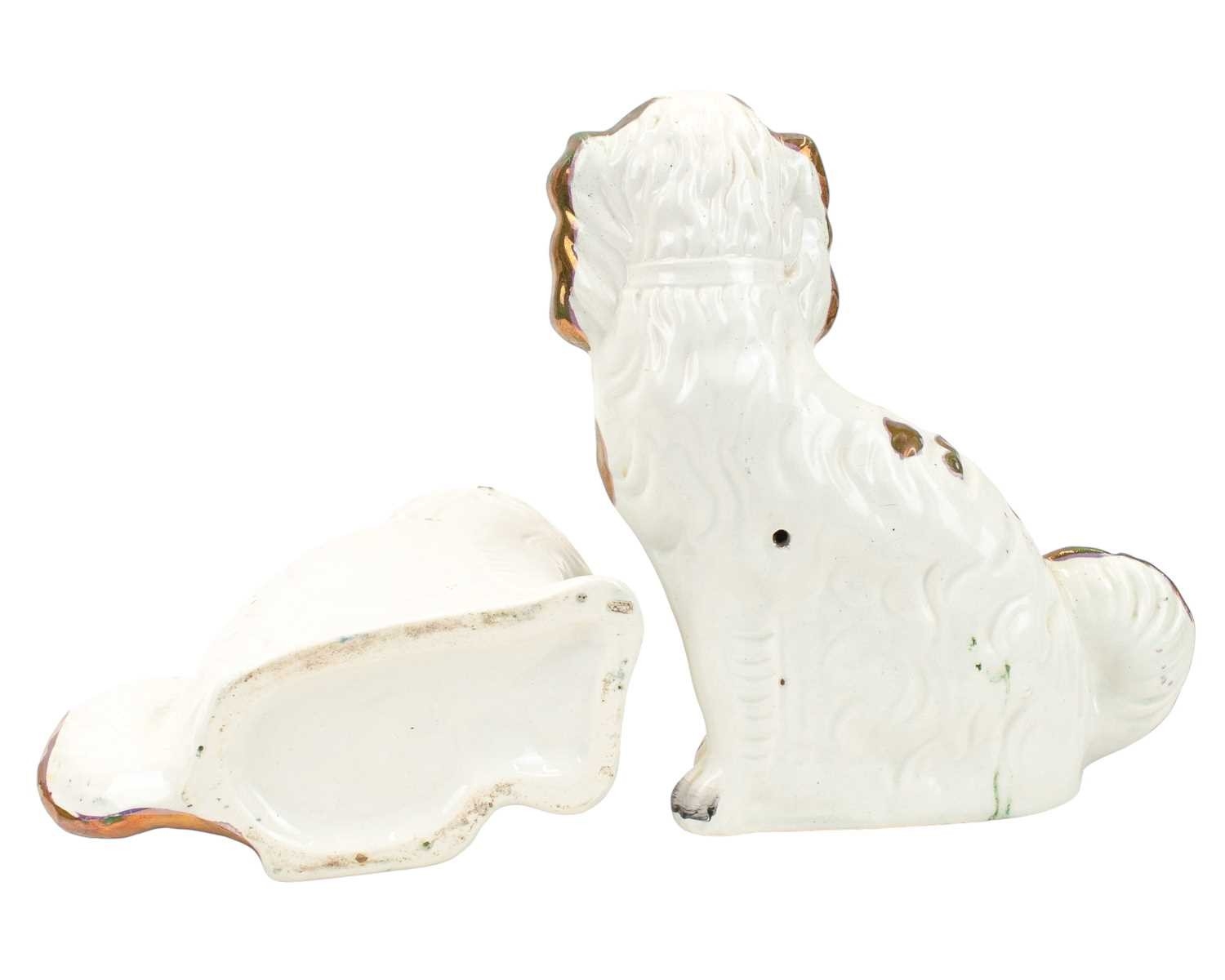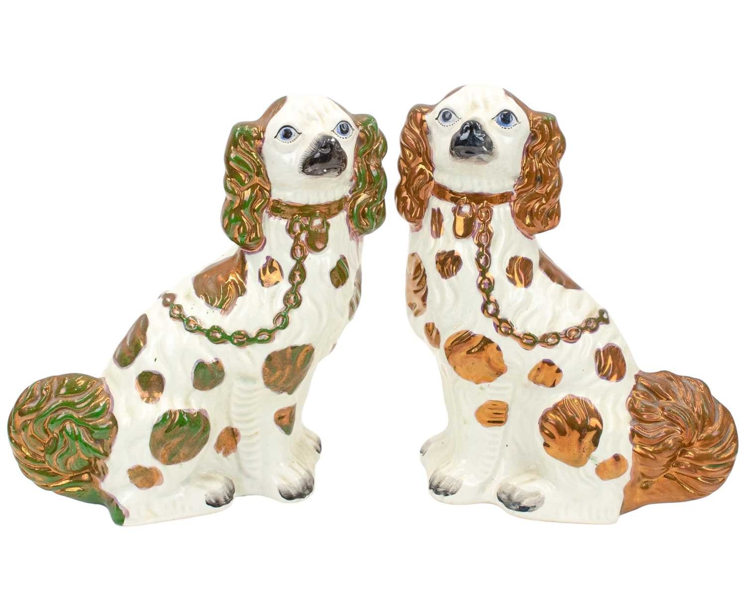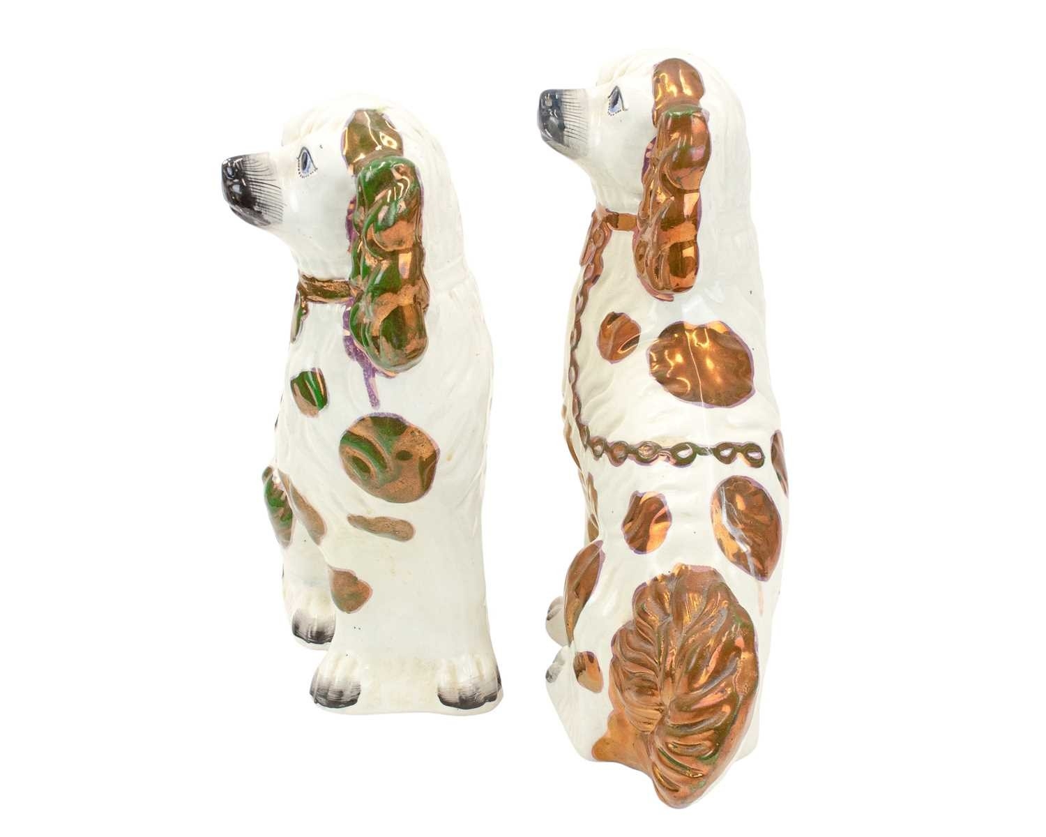 A pair of large Victorian Staffordshire lustre spaniels. With copper, pink and green markings, height 31.5cm.
