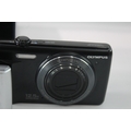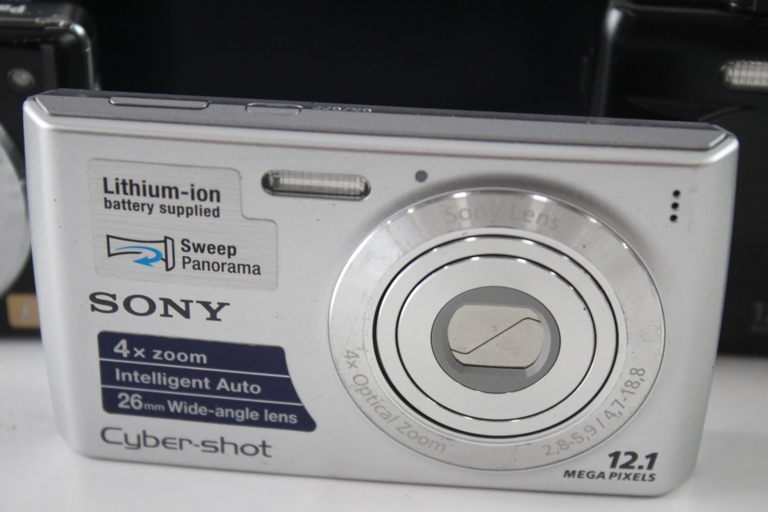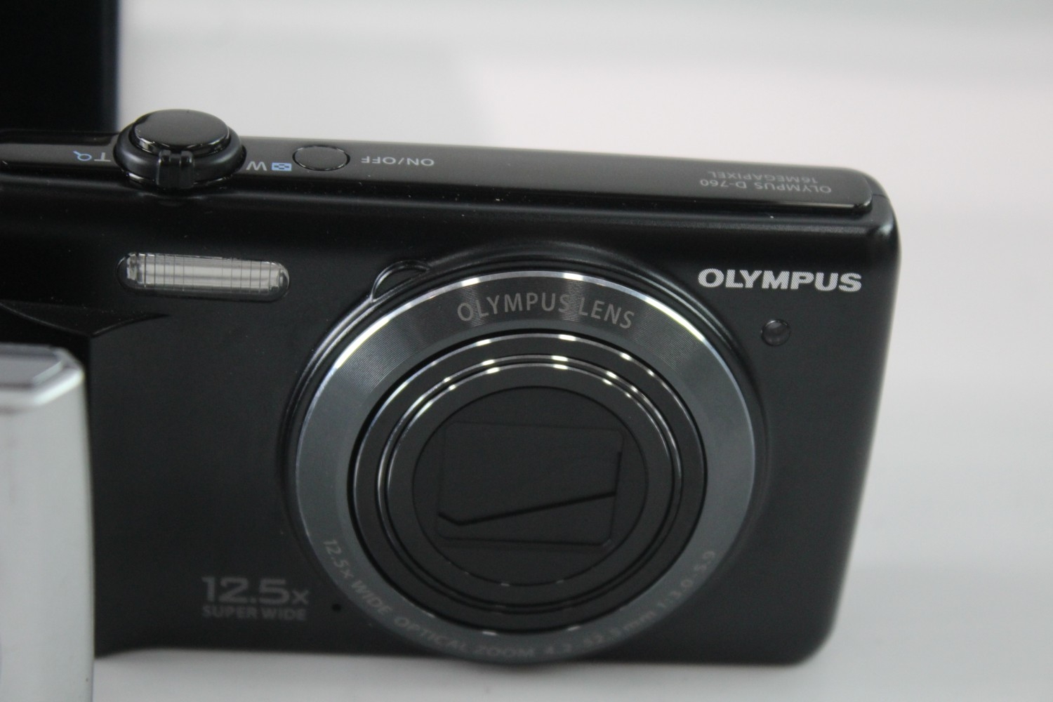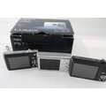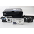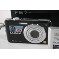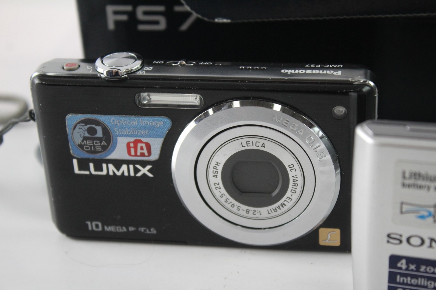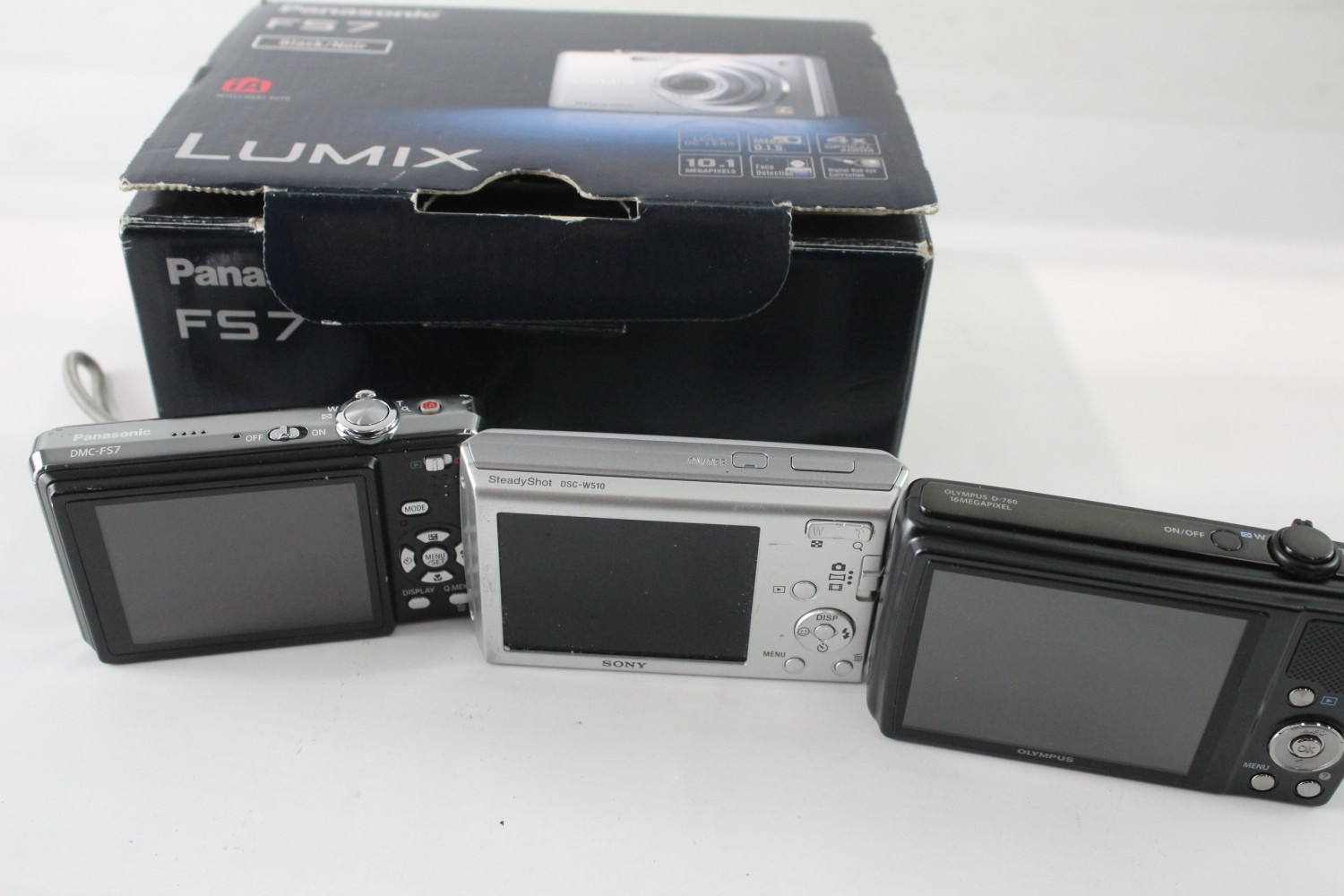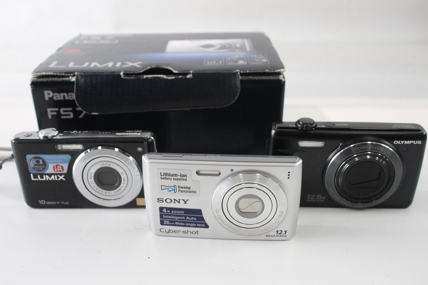 Three compact digital cameras, one boxed Panasonic Lumix DMC-FS7 10.1mp with charger, cables, software disc and instruction manual, one cased Olympus D-760 16mp and one Sony Cyber-shot DSC-W510 12.1mp