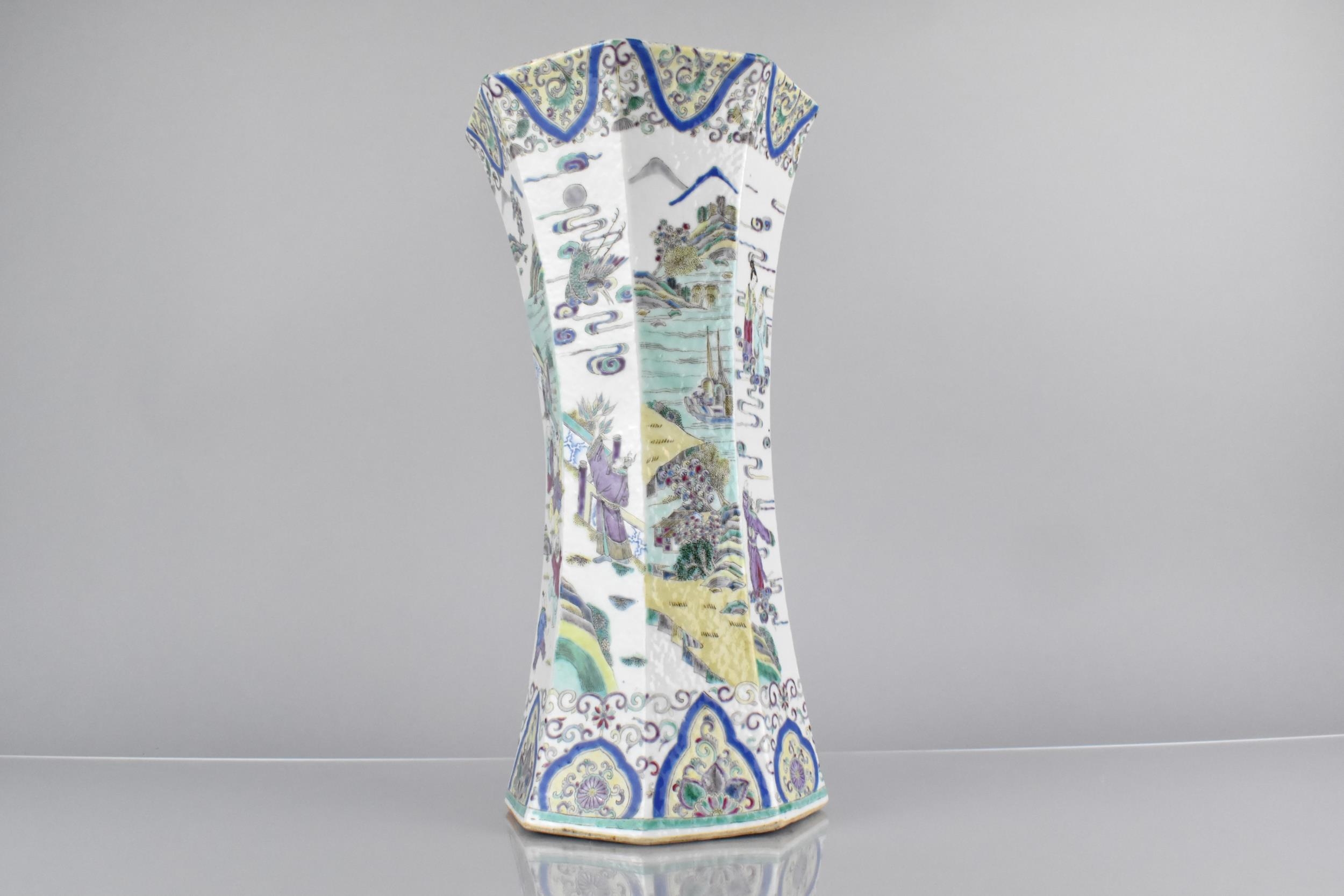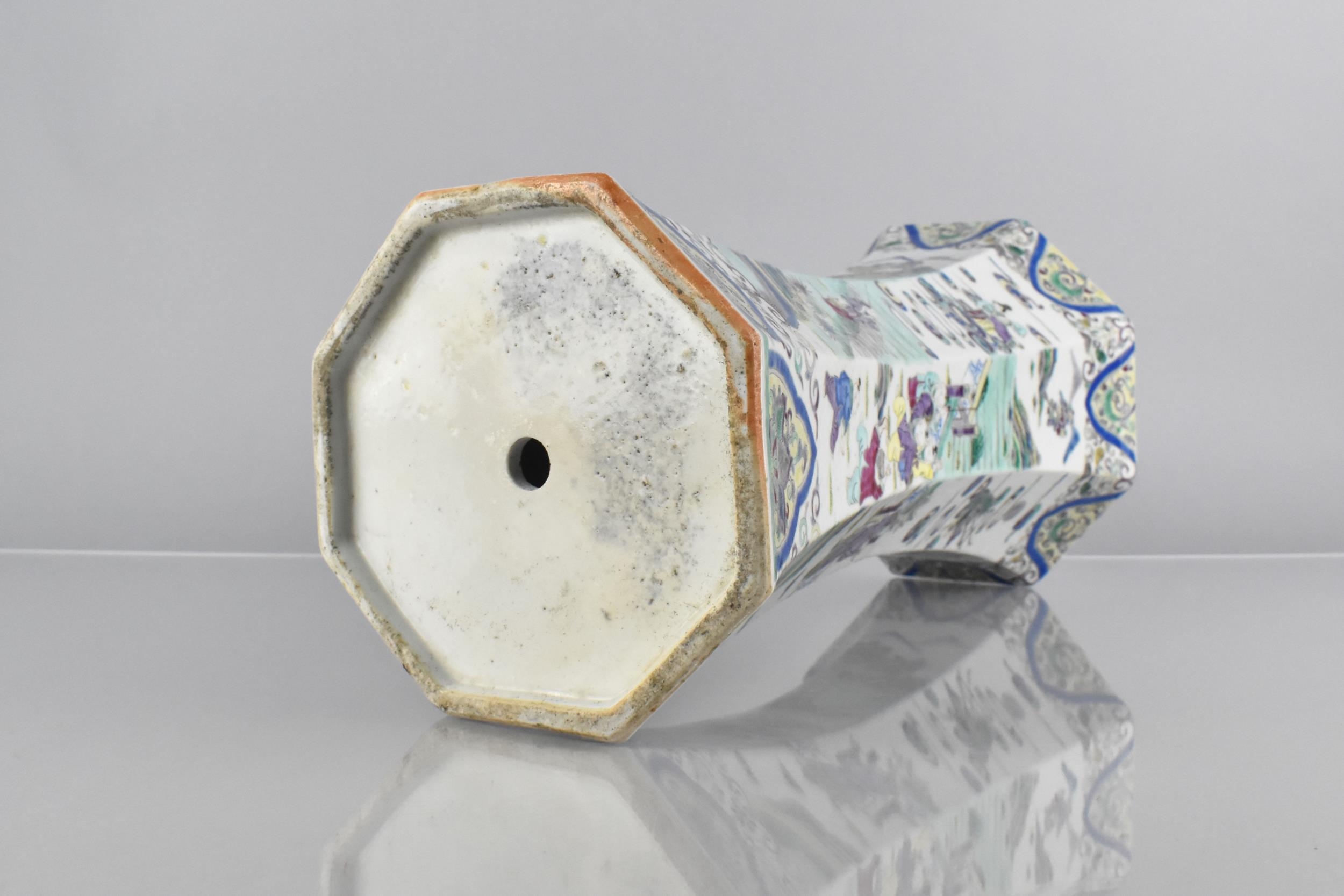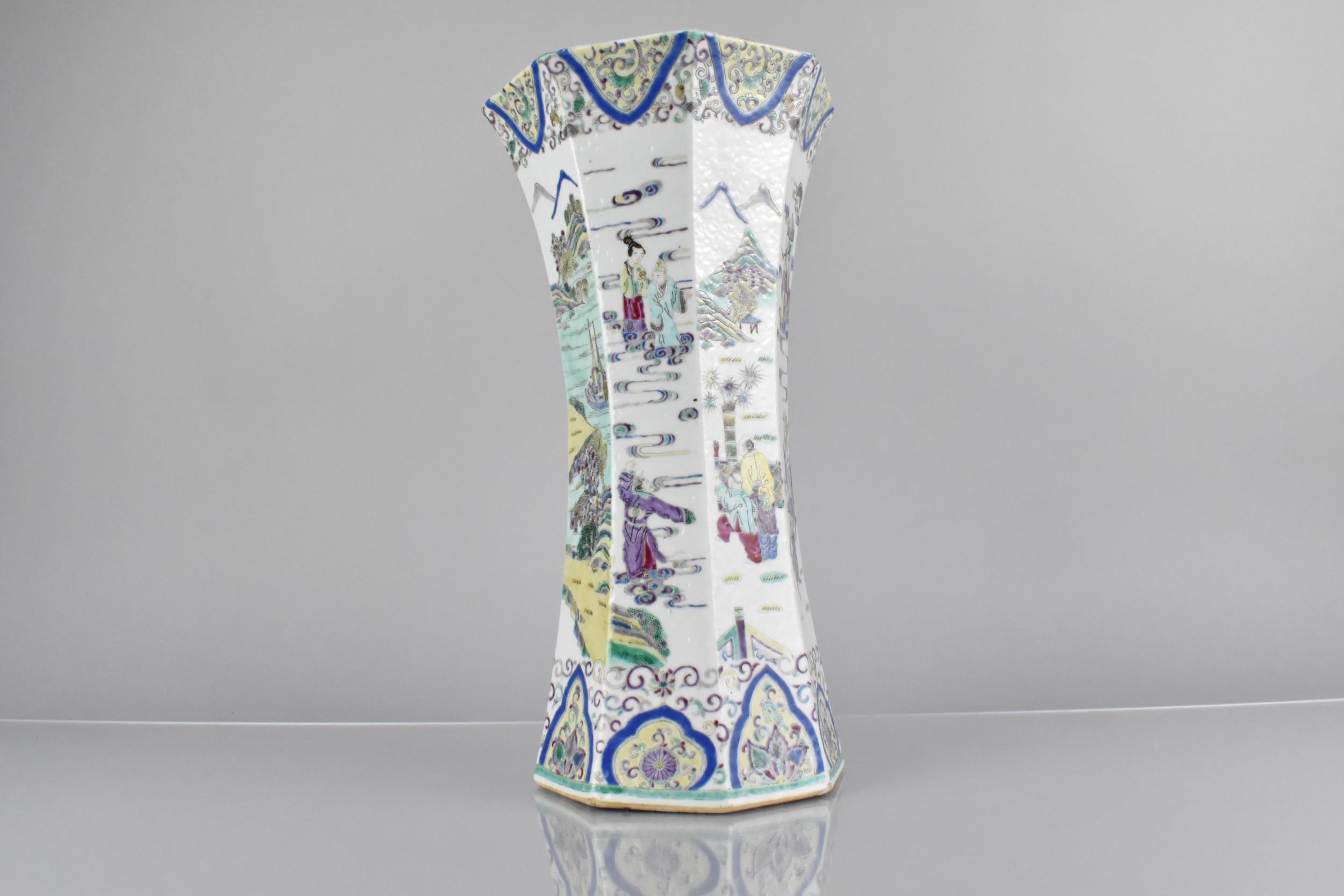 A Chinese Qing Dynasty Porcelain Vase of Flared Octagonal Form Decorated in the Famille Palette Detailing Figures in Exterior Setting with Dignitaries, Maidens, Buffaloes with Riders in River, Crane and Scrolls etc, 31cm High Condition Not Perfect with Drill to Base