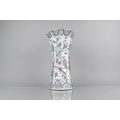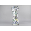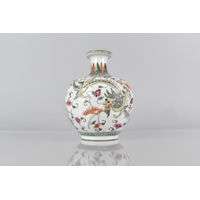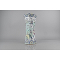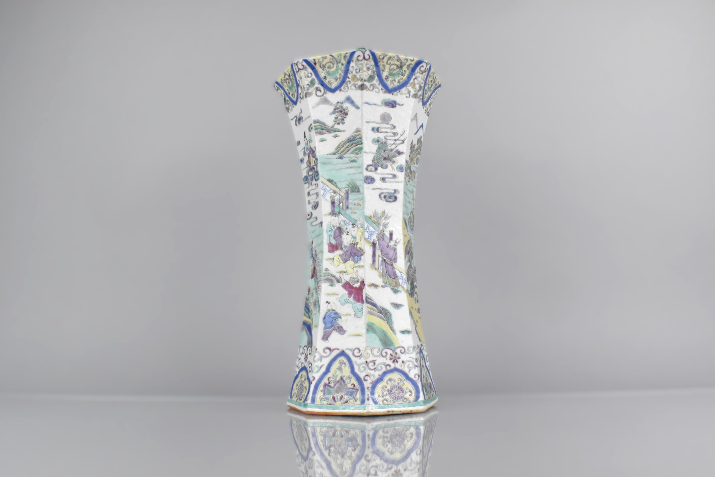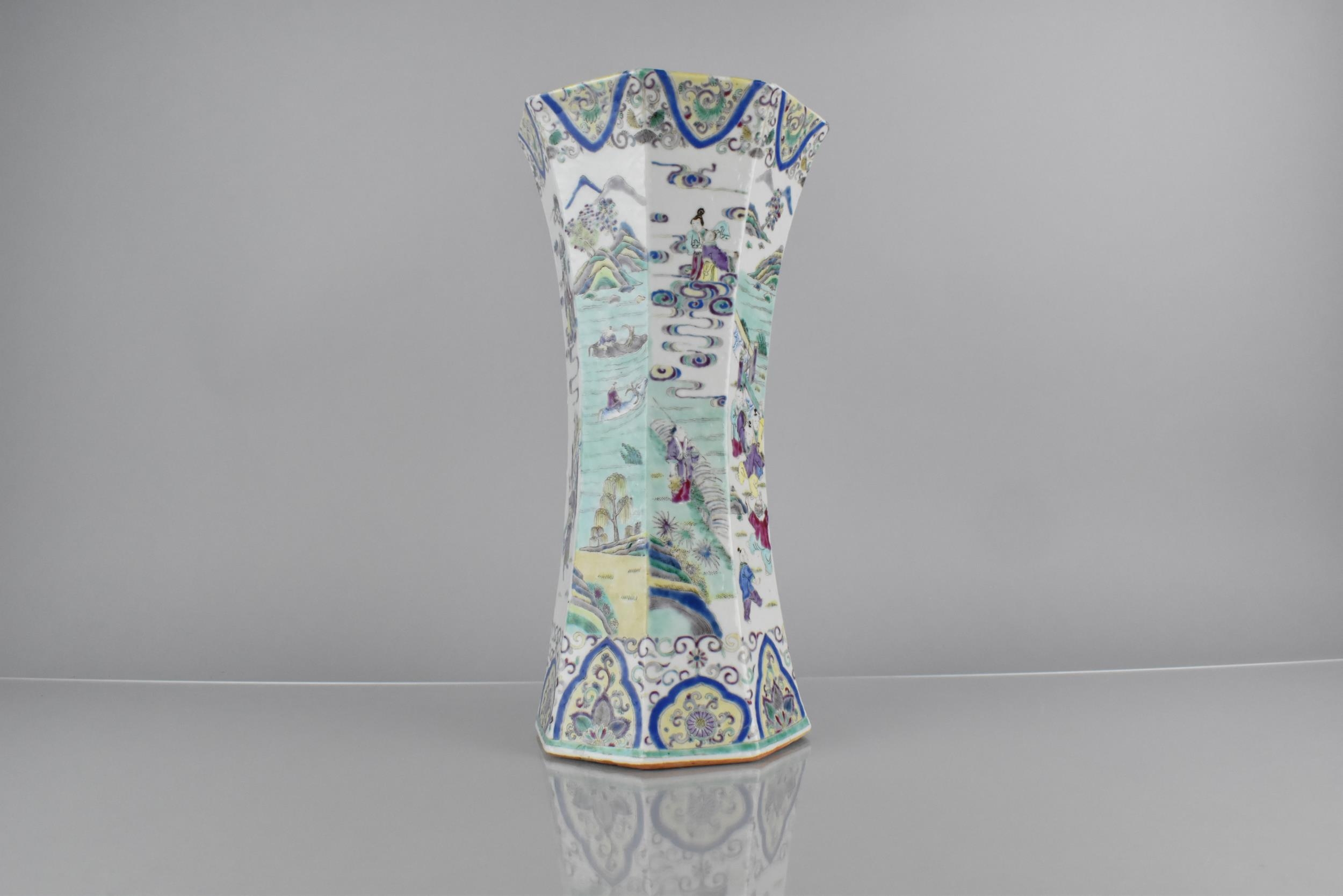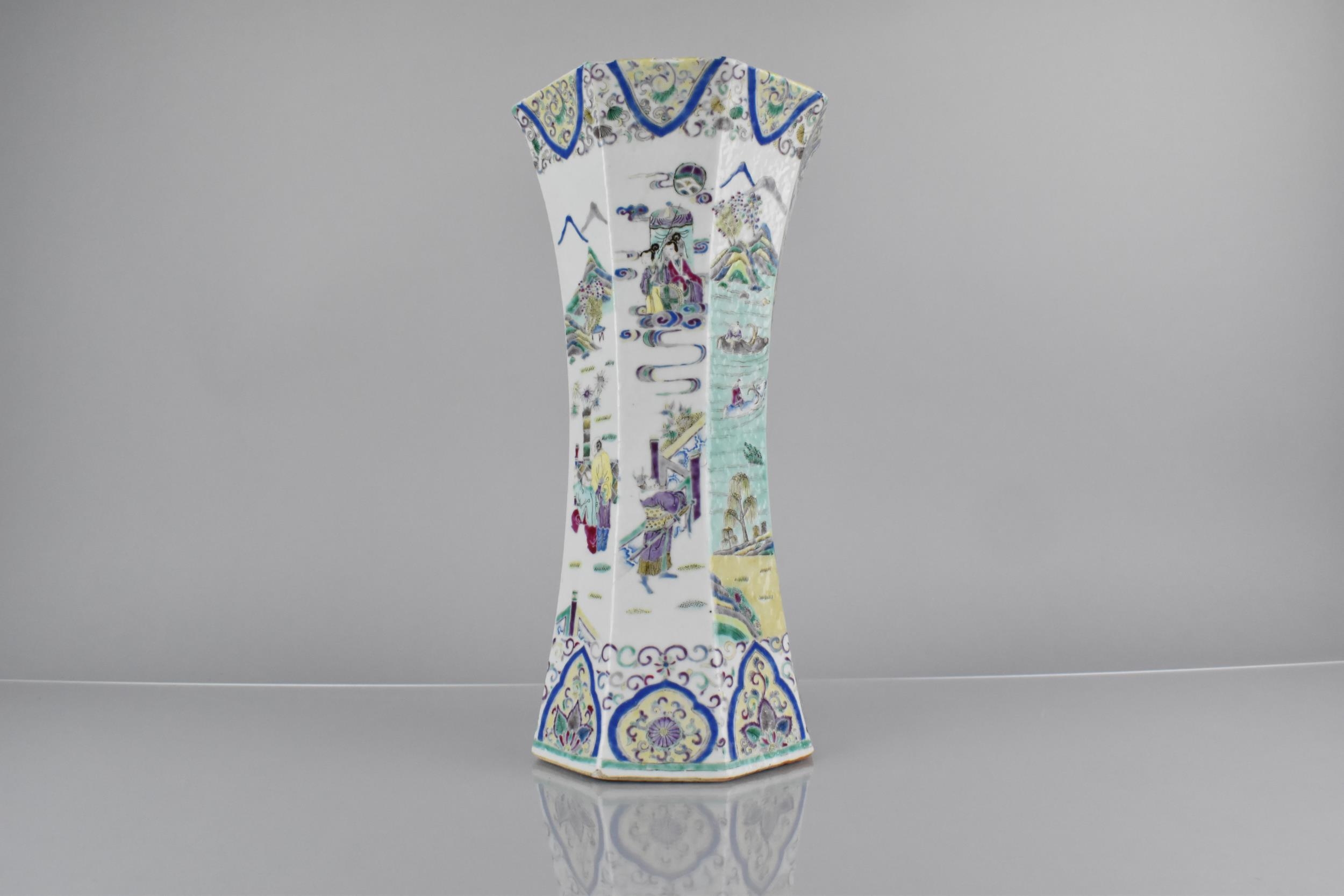 A Chinese Qing Dynasty Porcelain Vase of Flared Octagonal Form Decorated in the Famille Palette Detailing Figures in Exterior Setting with Dignitaries, Maidens, Buffaloes with Riders in River, Crane and Scrolls etc, 31cm High Condition Not Perfect with Drill to Base