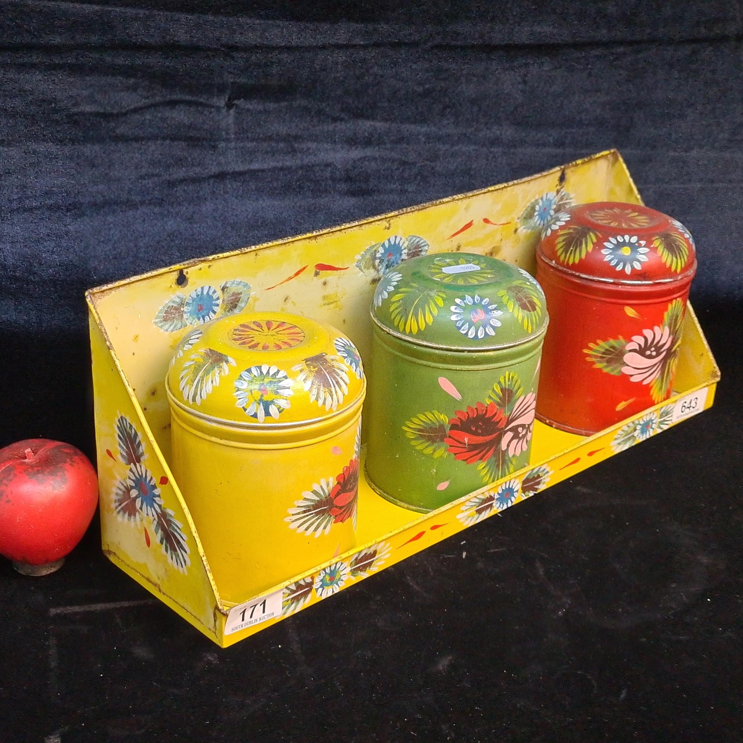 A charming set with three hand painted mid century metal tea caddies and shelf. Boasting a floral design. Super cute.