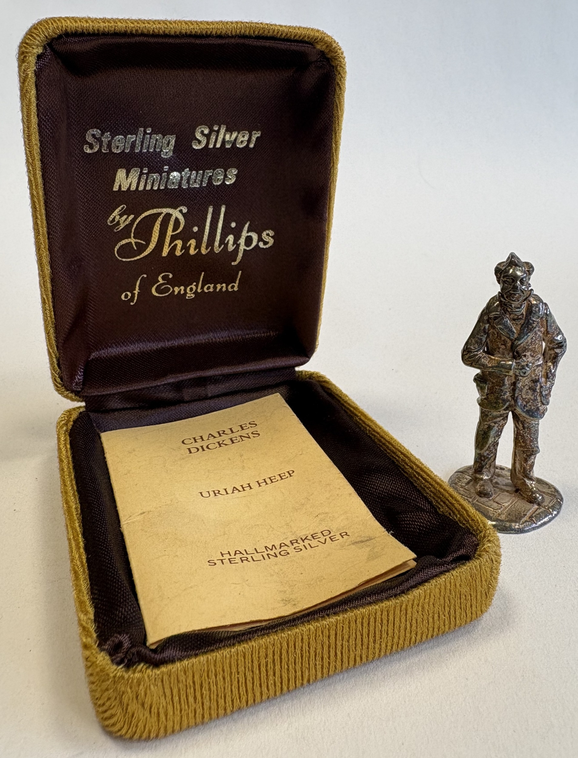 A Sterling silver miniature figure of the Charles Dickens character 'Uriah Heep' contained within original box. Approx. 39 grams. Est. £60 - £80.