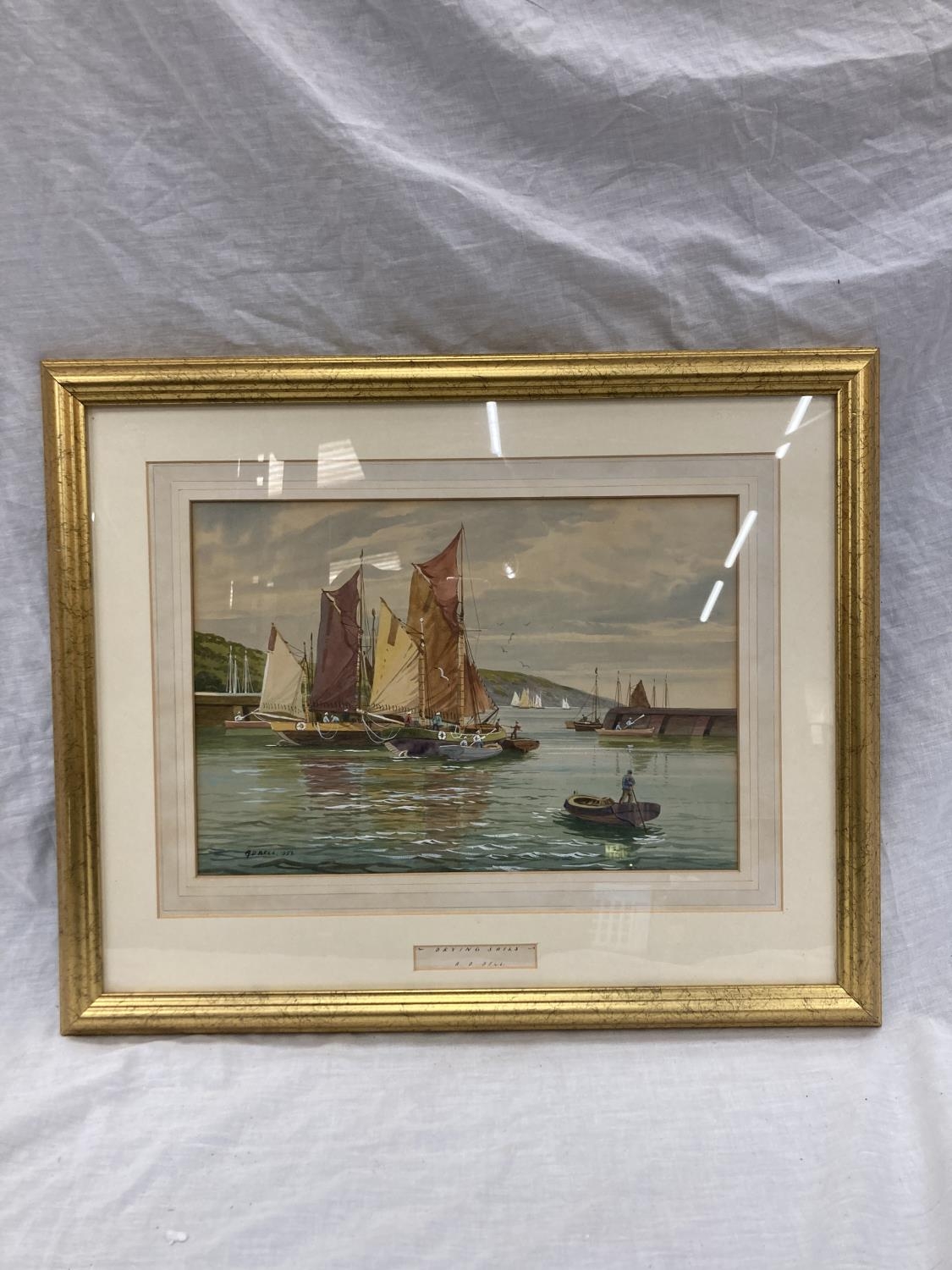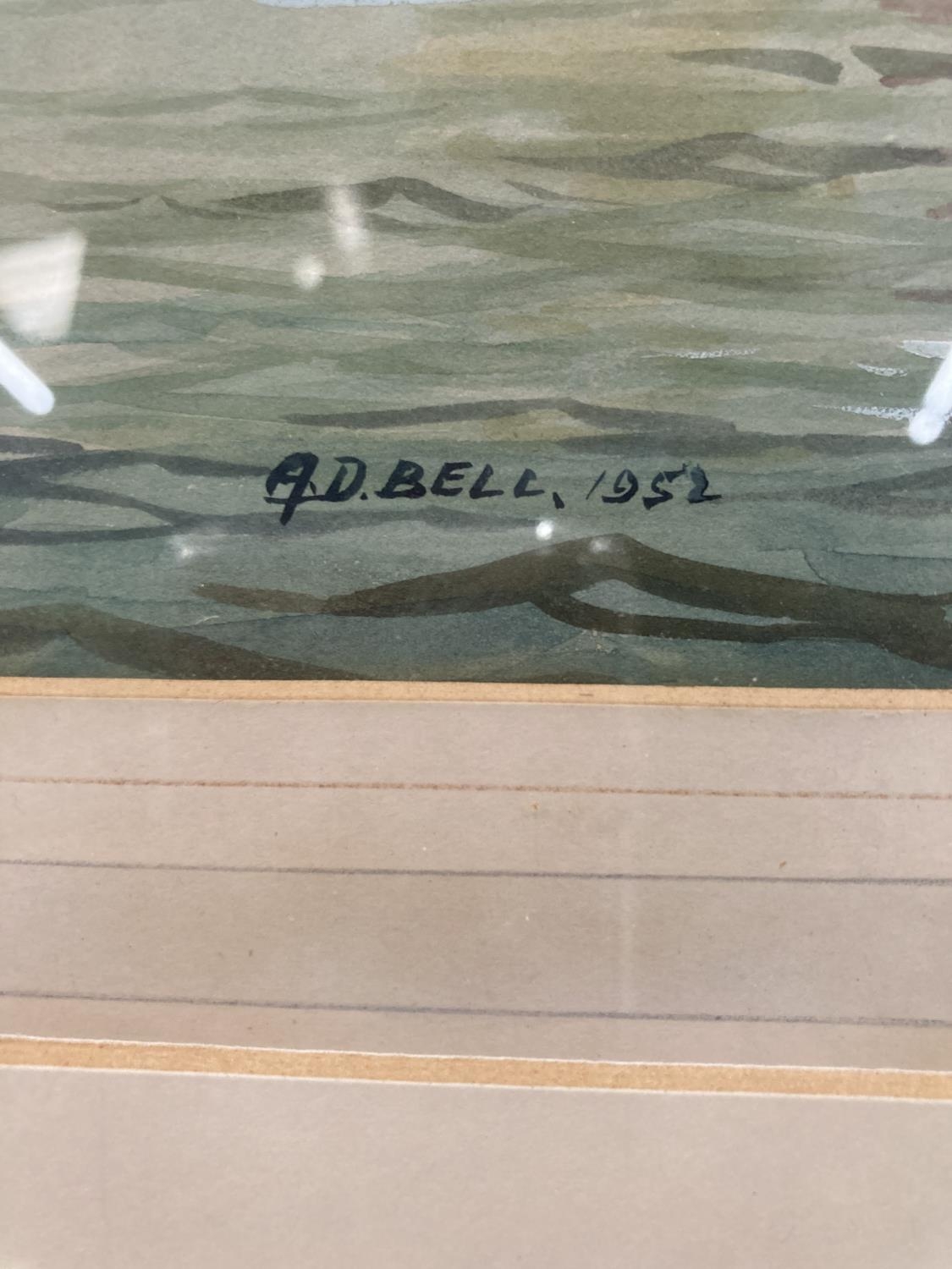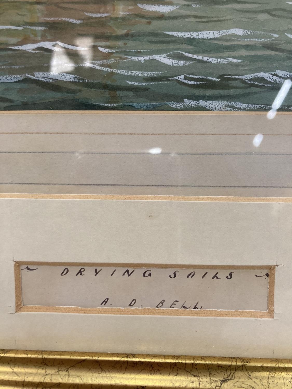 A 1952 FRAMED WATERCOLOUR SIGNED A. D. BELL ENTITLED 'DRYING SAILS' - 54CM X 45CM