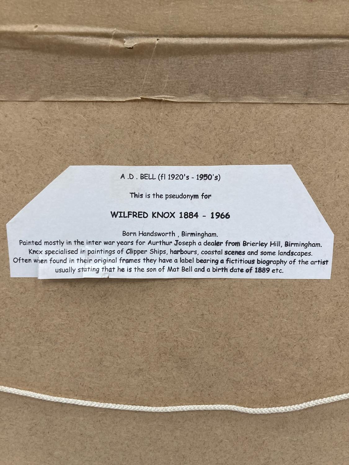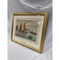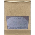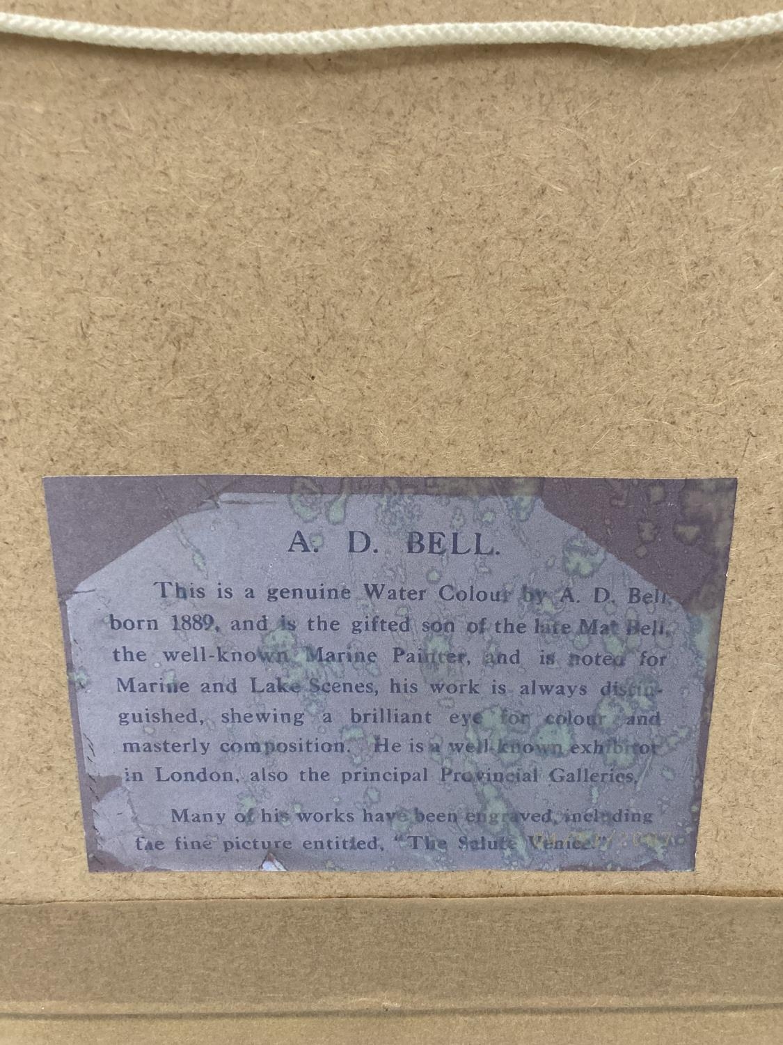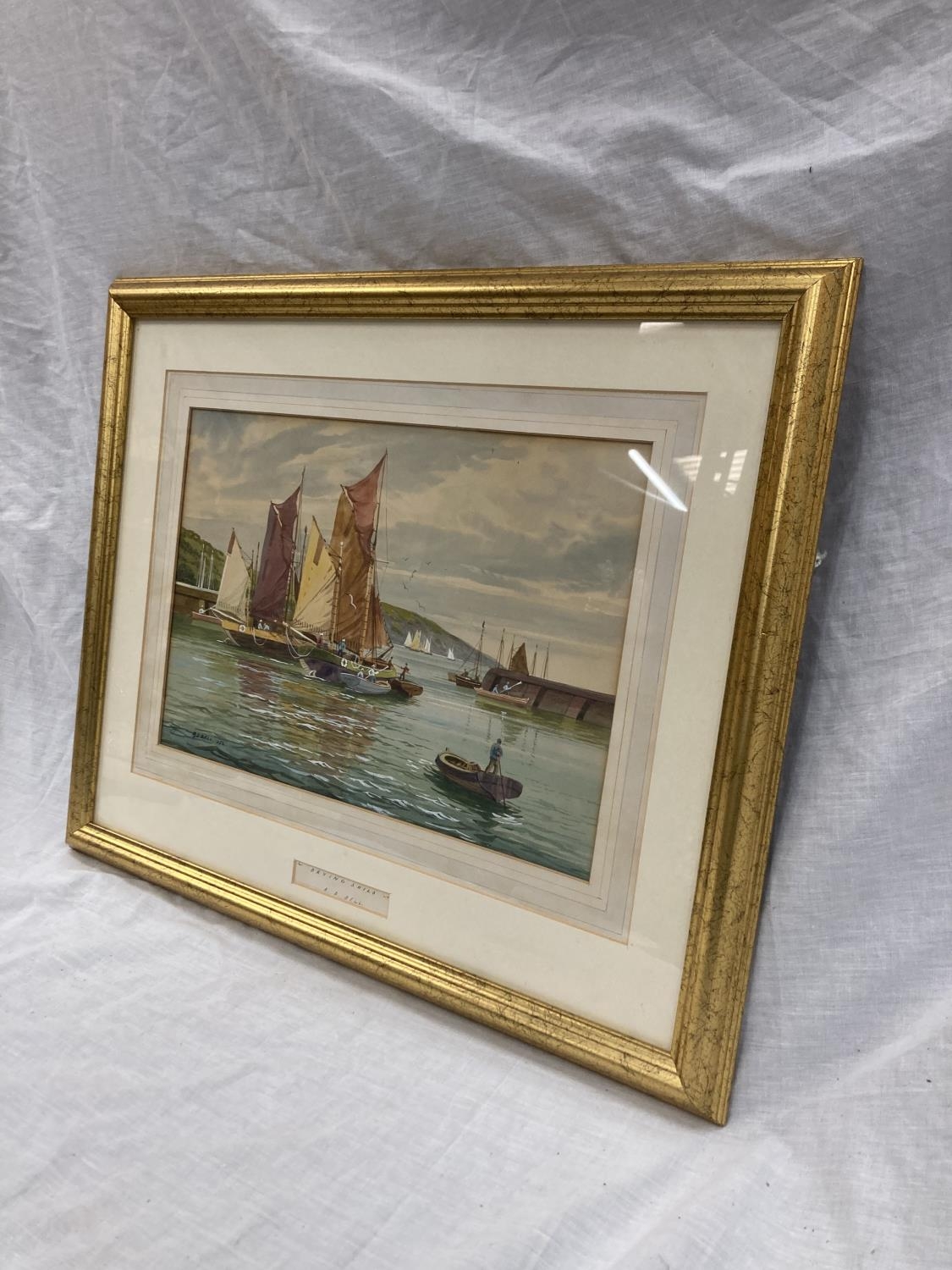 A 1952 FRAMED WATERCOLOUR SIGNED A. D. BELL ENTITLED 'DRYING SAILS' - 54CM X 45CM