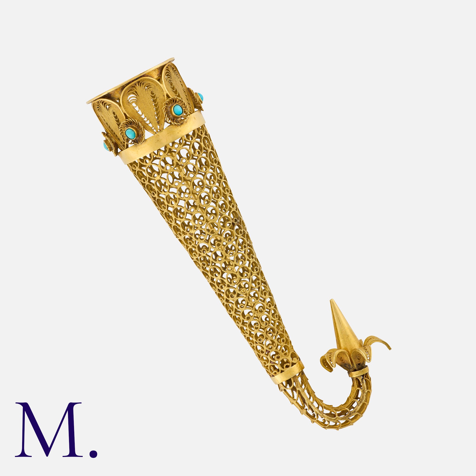 An Antique Filigree Bouquet Holder Brooch in yellow gold, the intricate filigree cornucopia form accented by cabochon turquoise. Unmarked, tests indicate 18 carat gold.