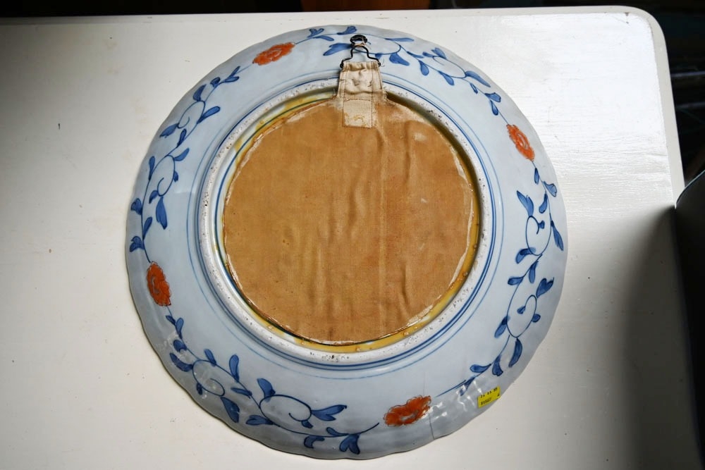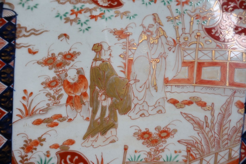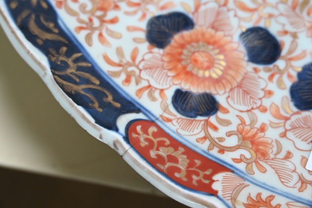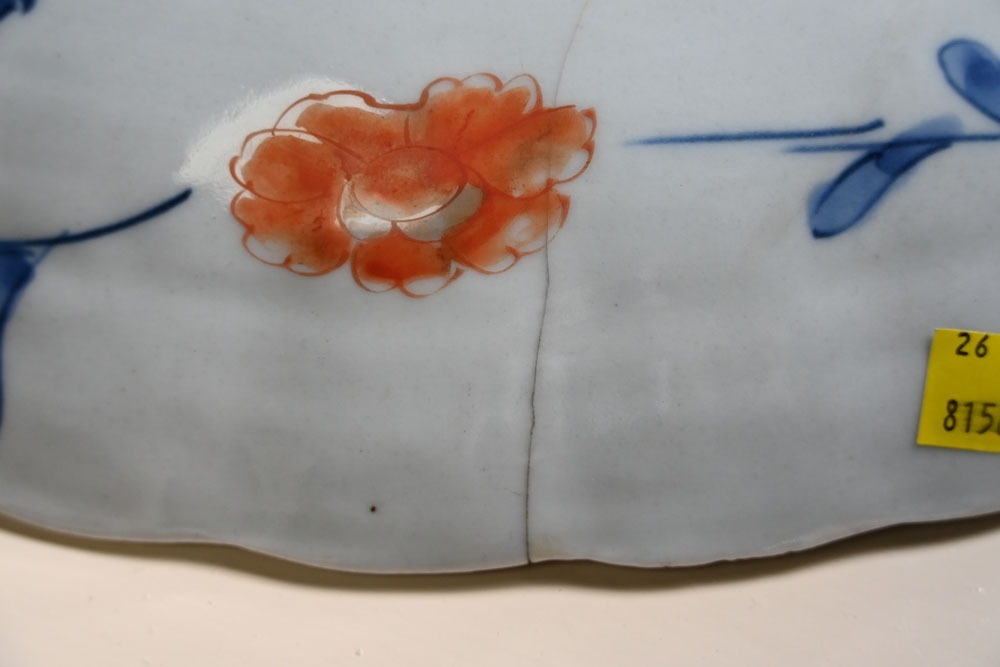Underneath the rim of one of the vases is a repaired chip and a rough patch in the decoration, possibly a manufacturing flaw, the gilding on the rims of both vases is worn, the bodies of both vases look to be in good condition.