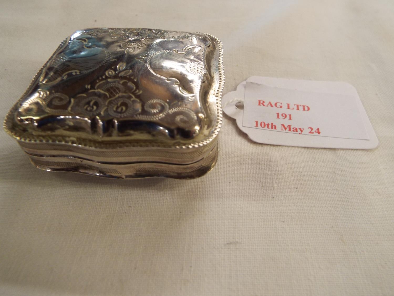 A continental silver pill box with engraved decoration