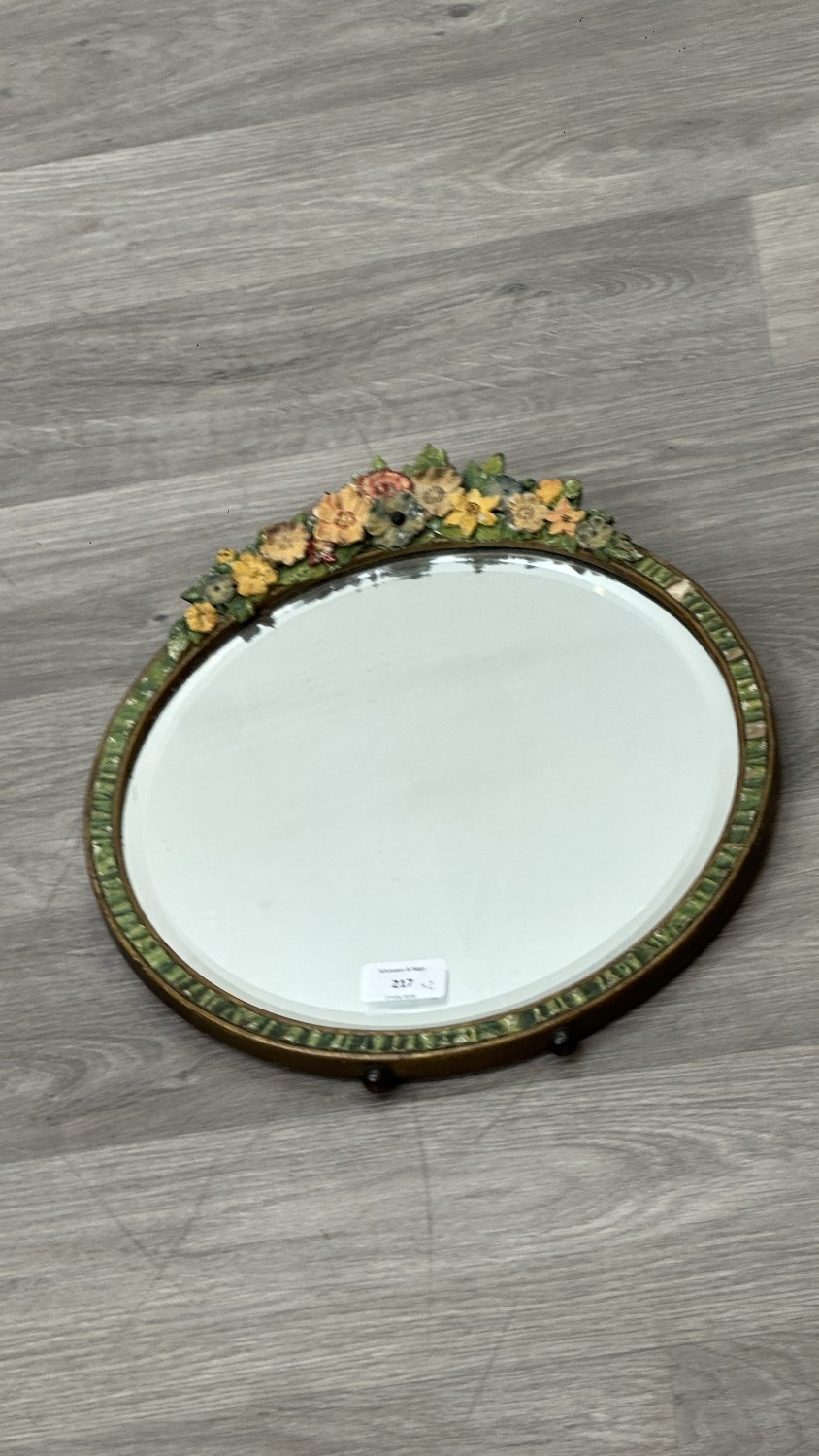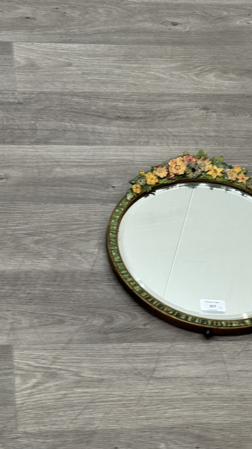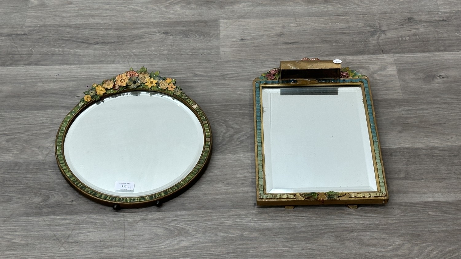 Two early/mid 20th century Barbola hand painted floral decorated framed bevelled edge mirrors, one circular wall hanging - approx. 33cm high and one easel back with fitted light - approx. 40cm high x 26cm wide