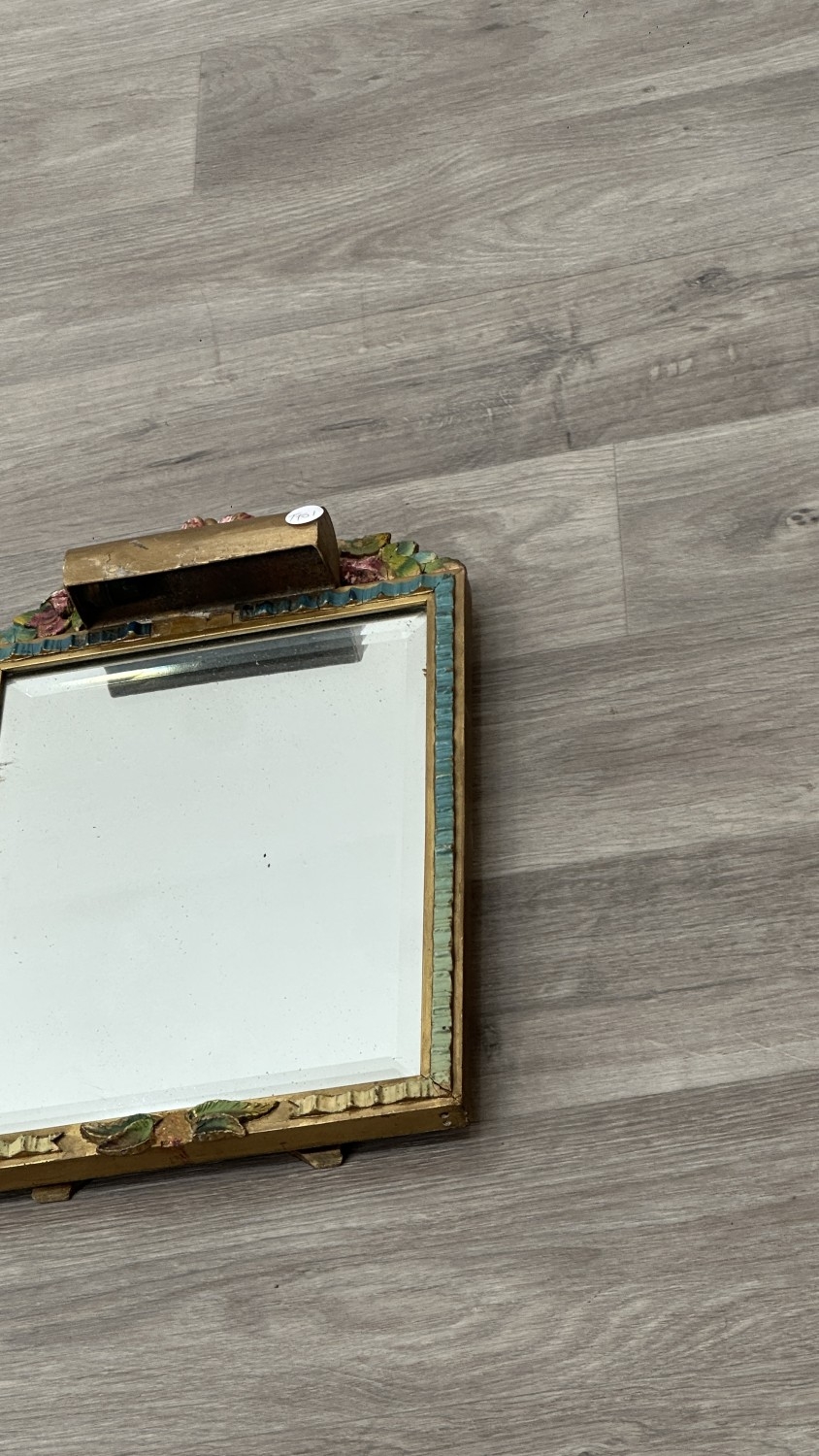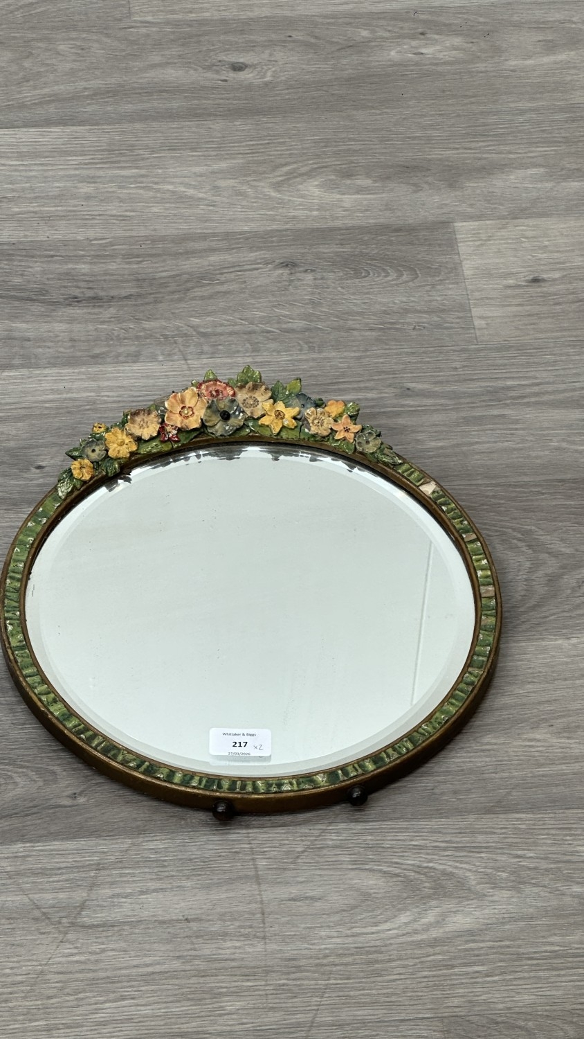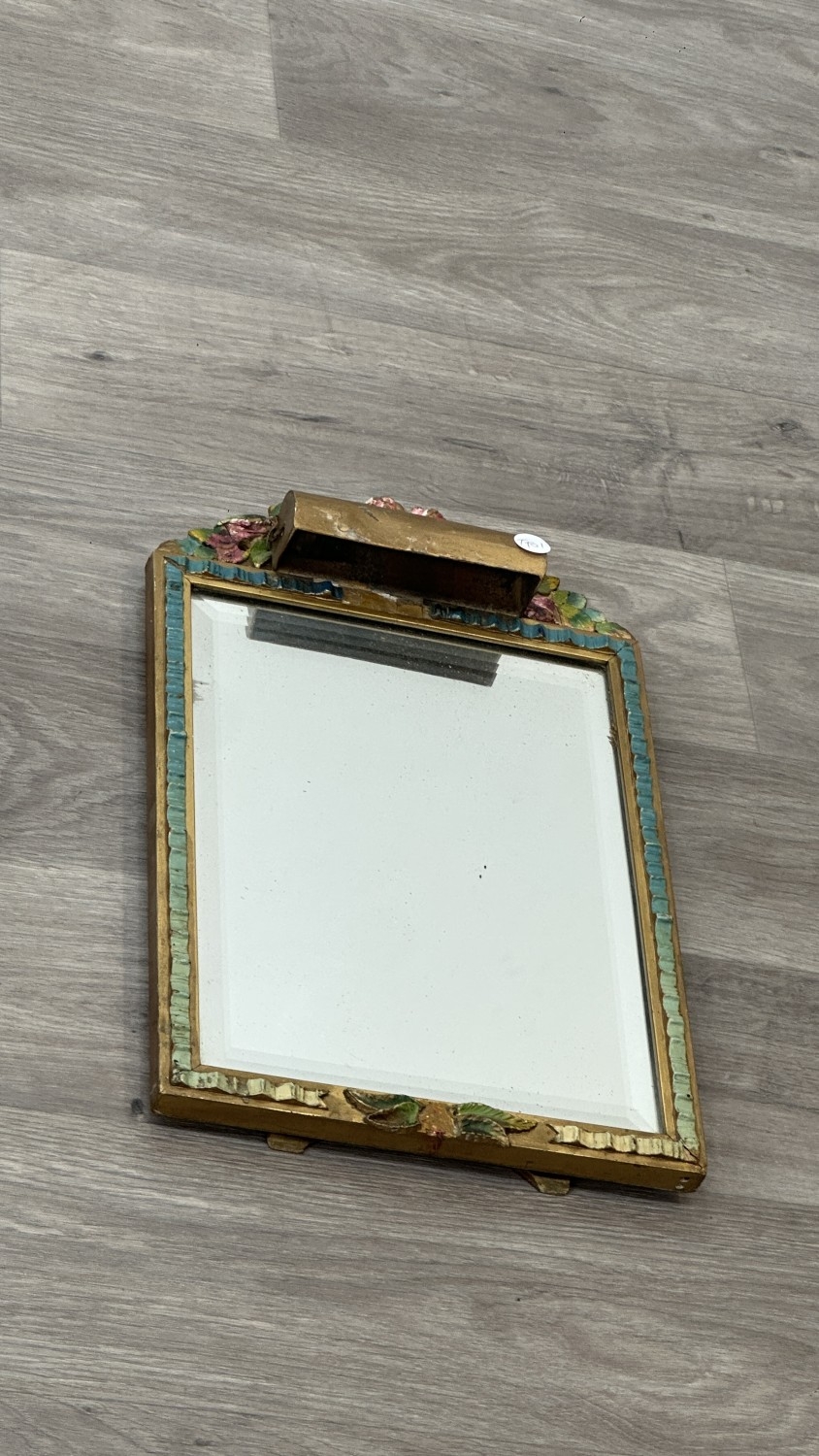 Two early/mid 20th century Barbola hand painted floral decorated framed bevelled edge mirrors, one circular wall hanging - approx. 33cm high and one easel back with fitted light - approx. 40cm high x 26cm wide