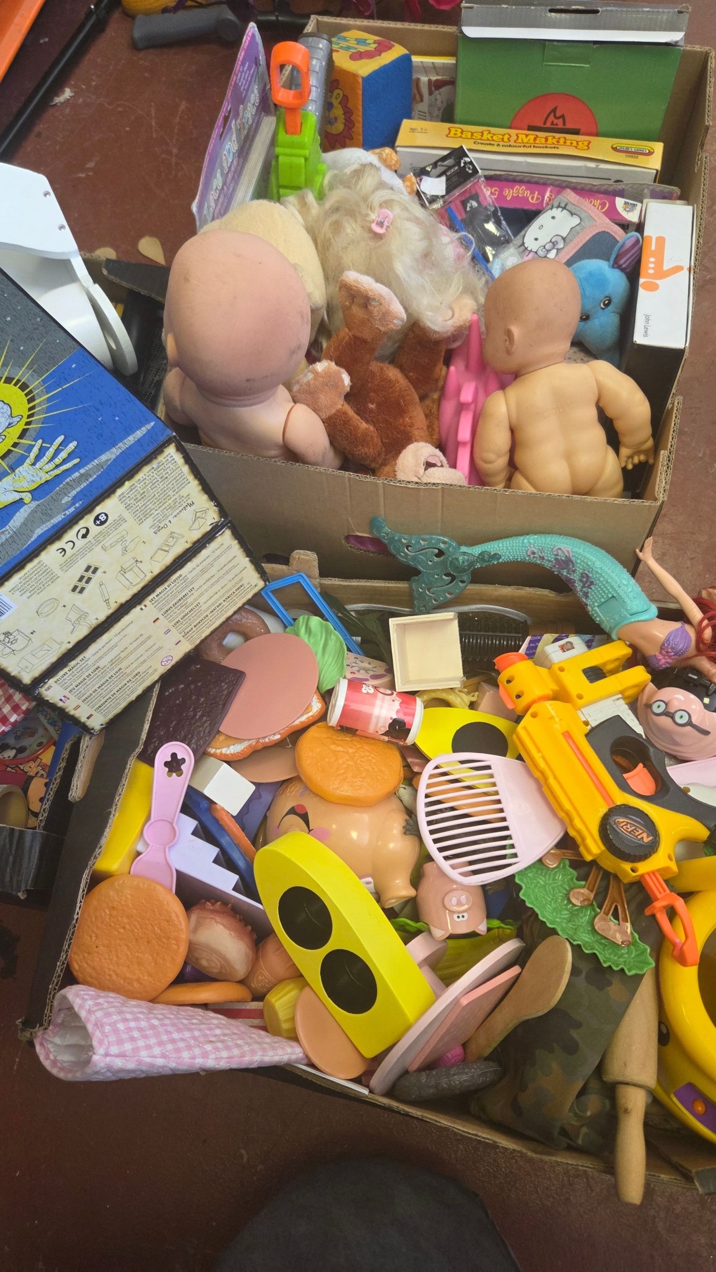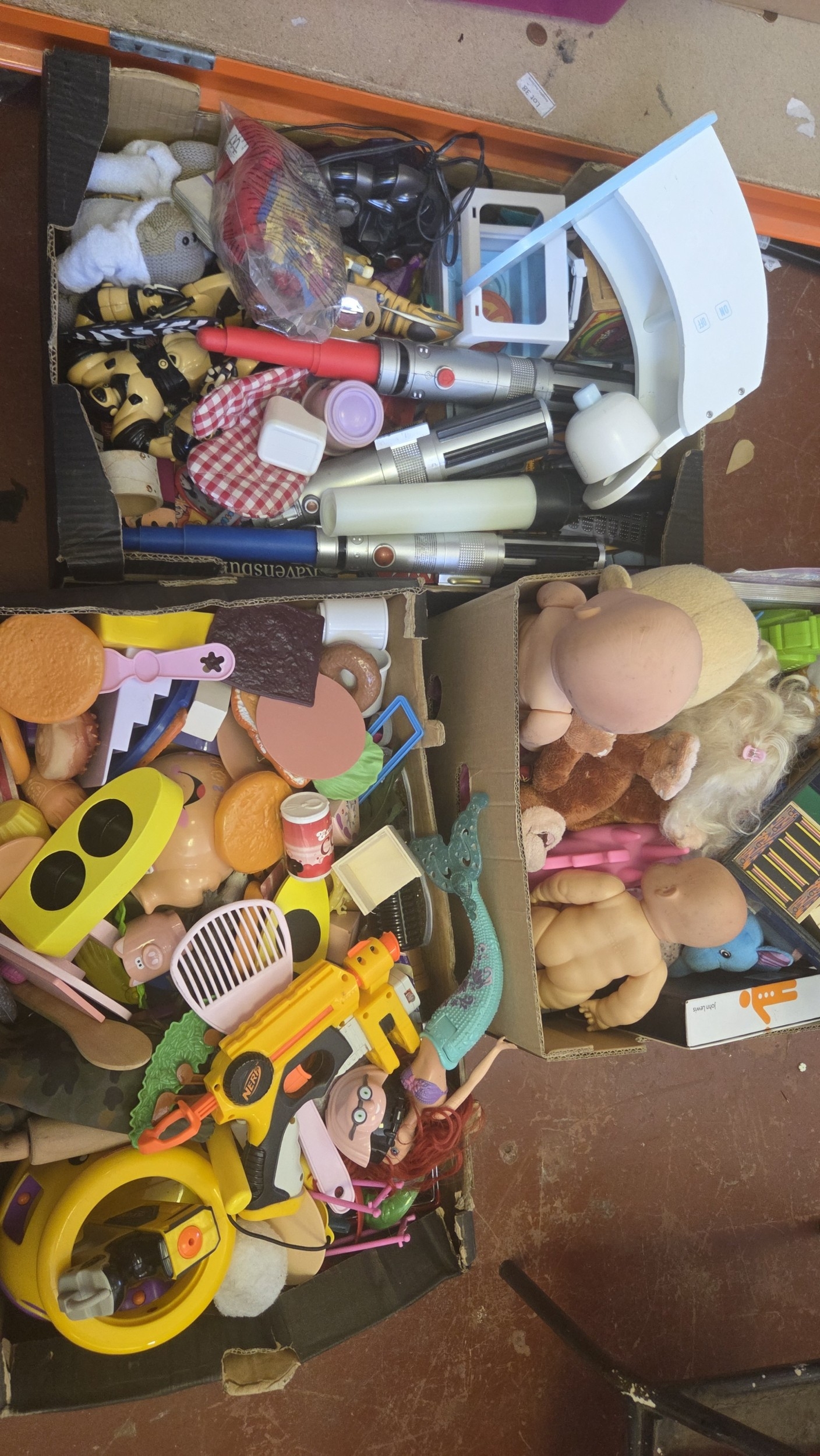 Three Boxes of Assorted Children's Toys and Play Accessories including NERF and Melissa and Doug Items