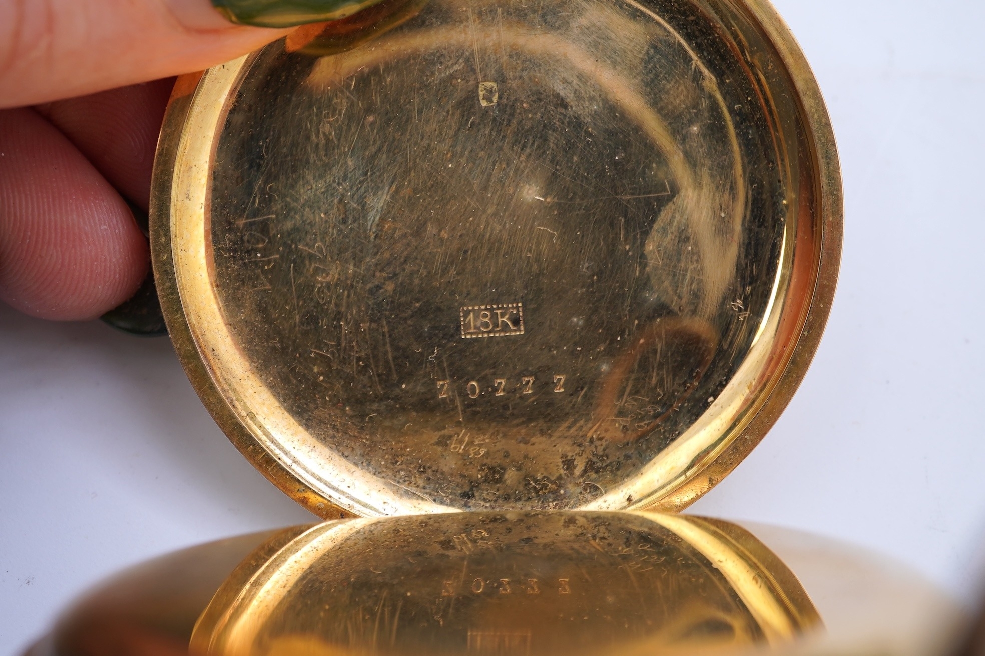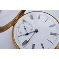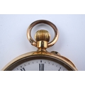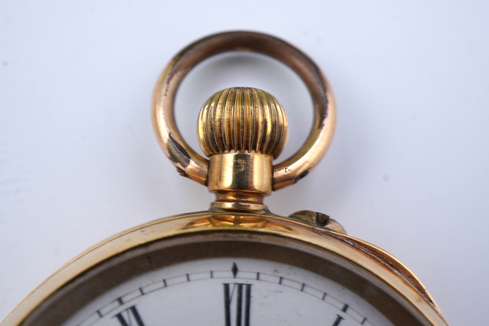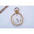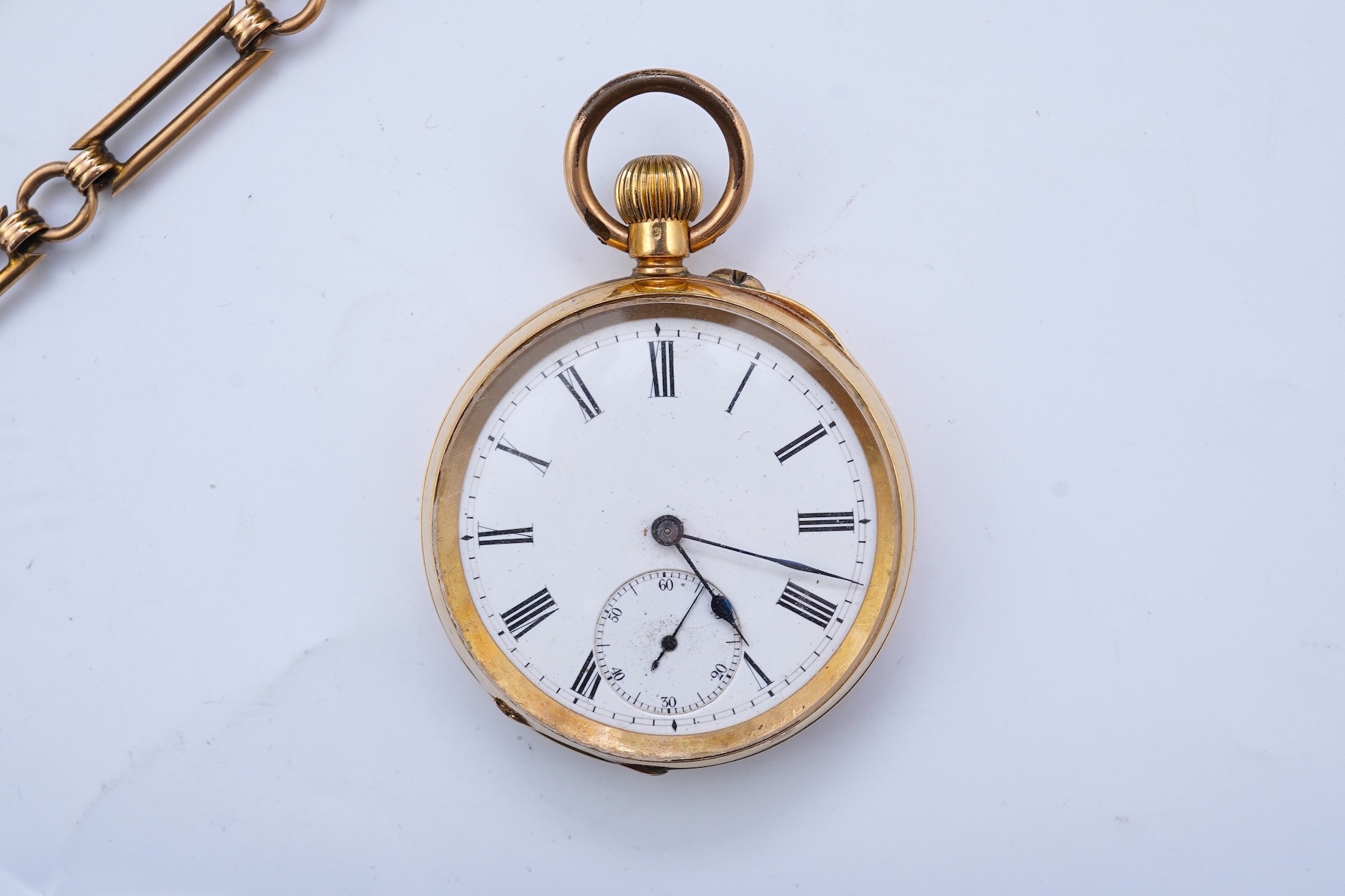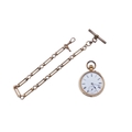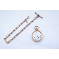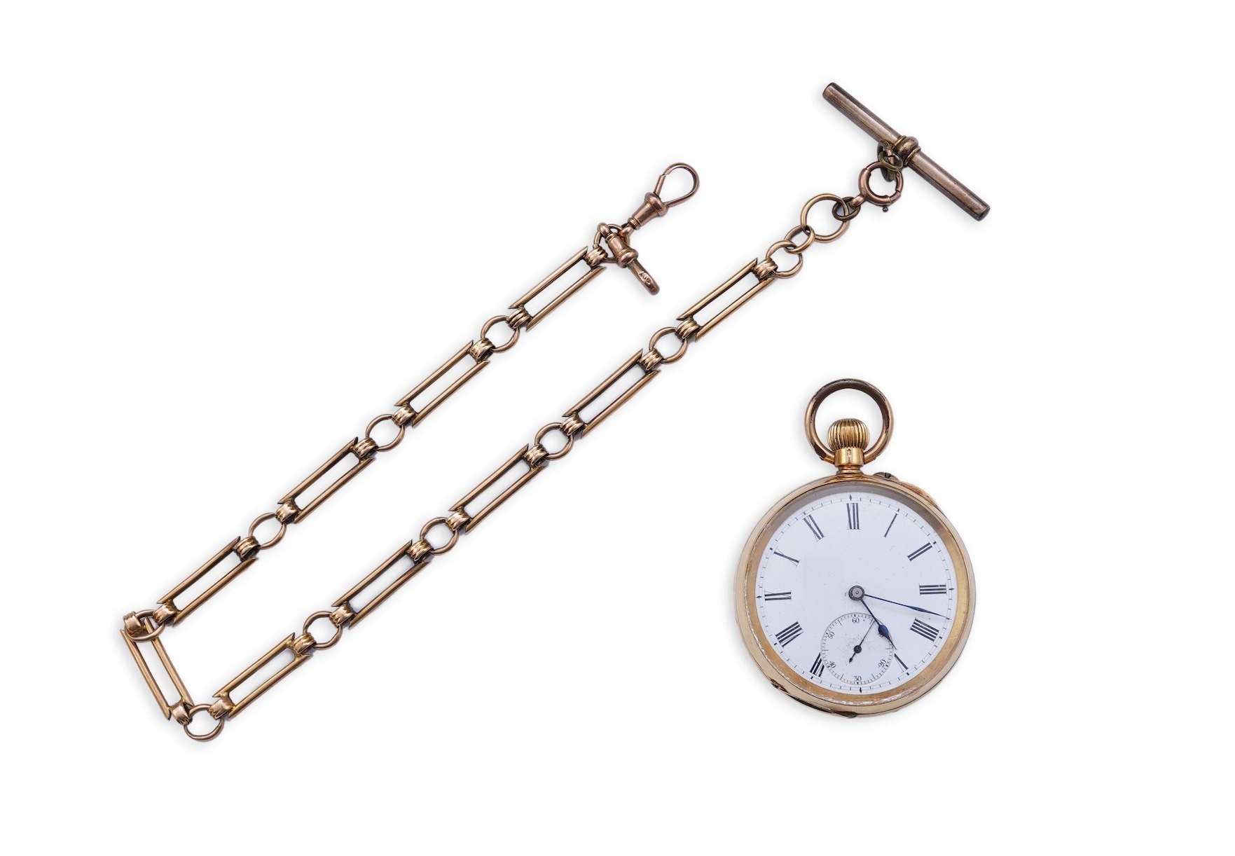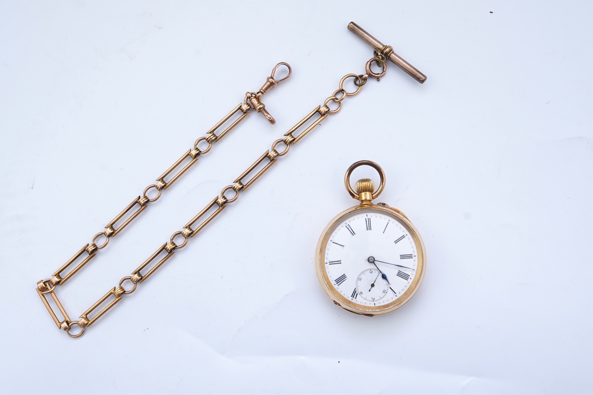 A continental 18k gold open faced keyless lever pocket watch, with a 9ct albert, the watch with Roman dial and subsidiary seconds, case diameter 48mm, gross weight 78 grams, the albert with gold plated T-bar, 37cm, gross weight 34.5 grams.
