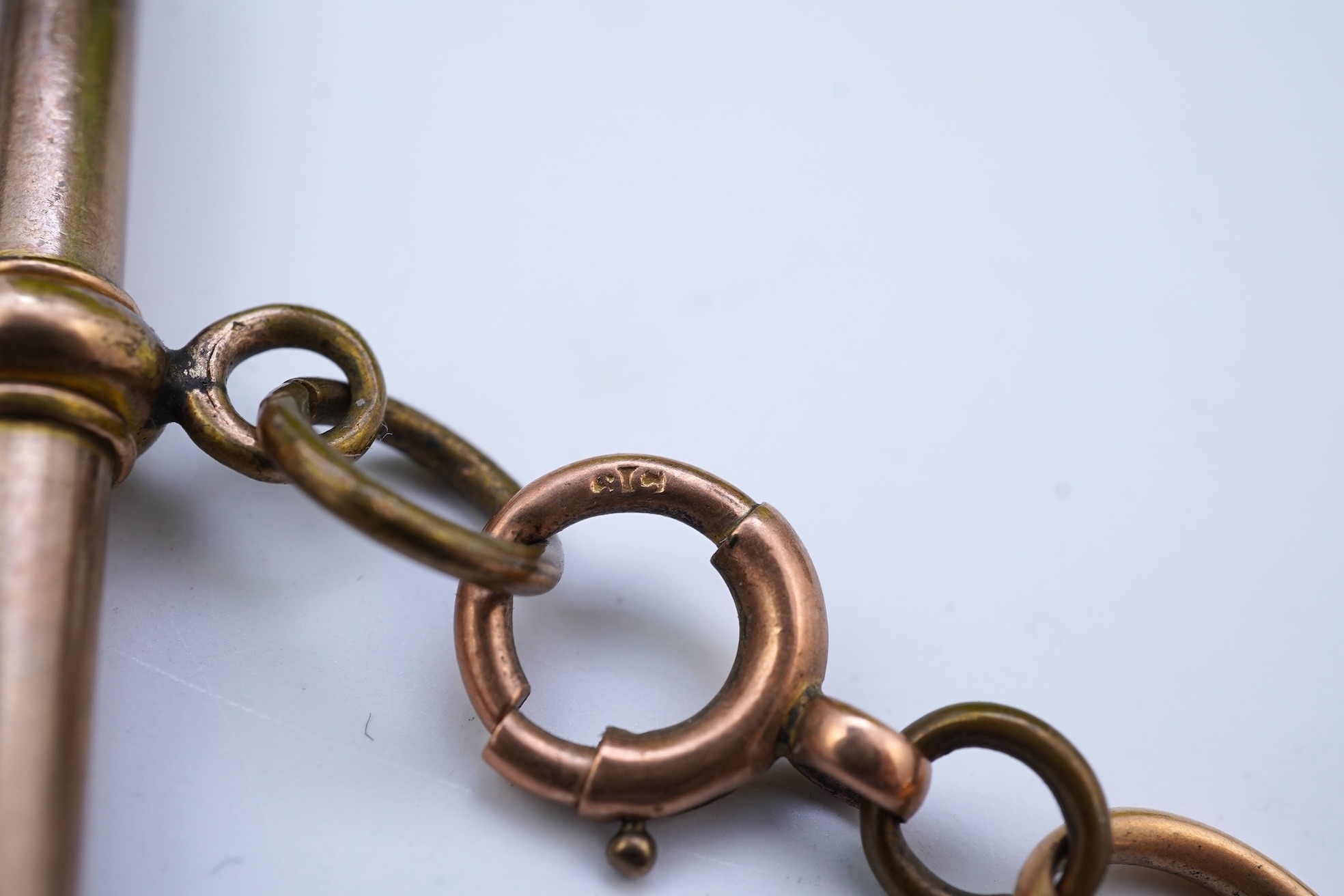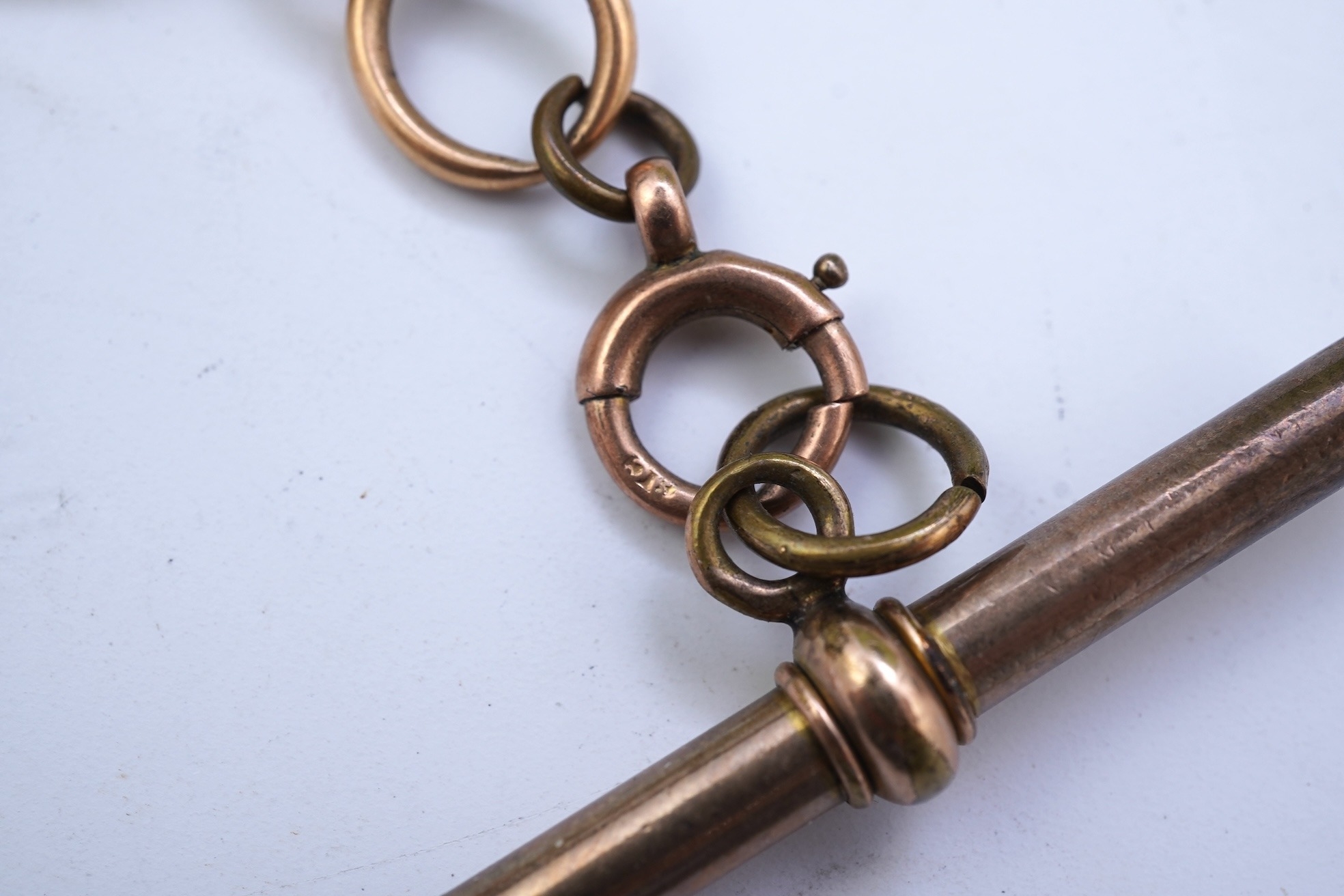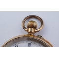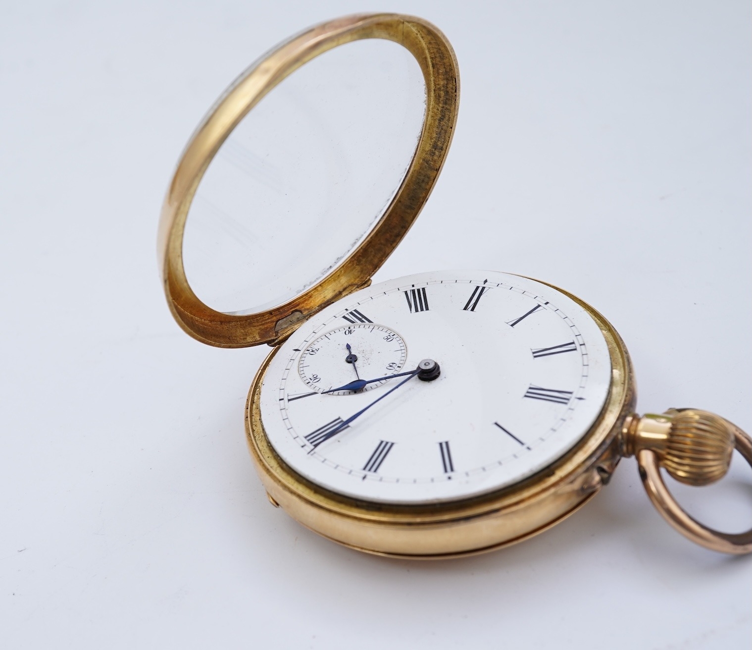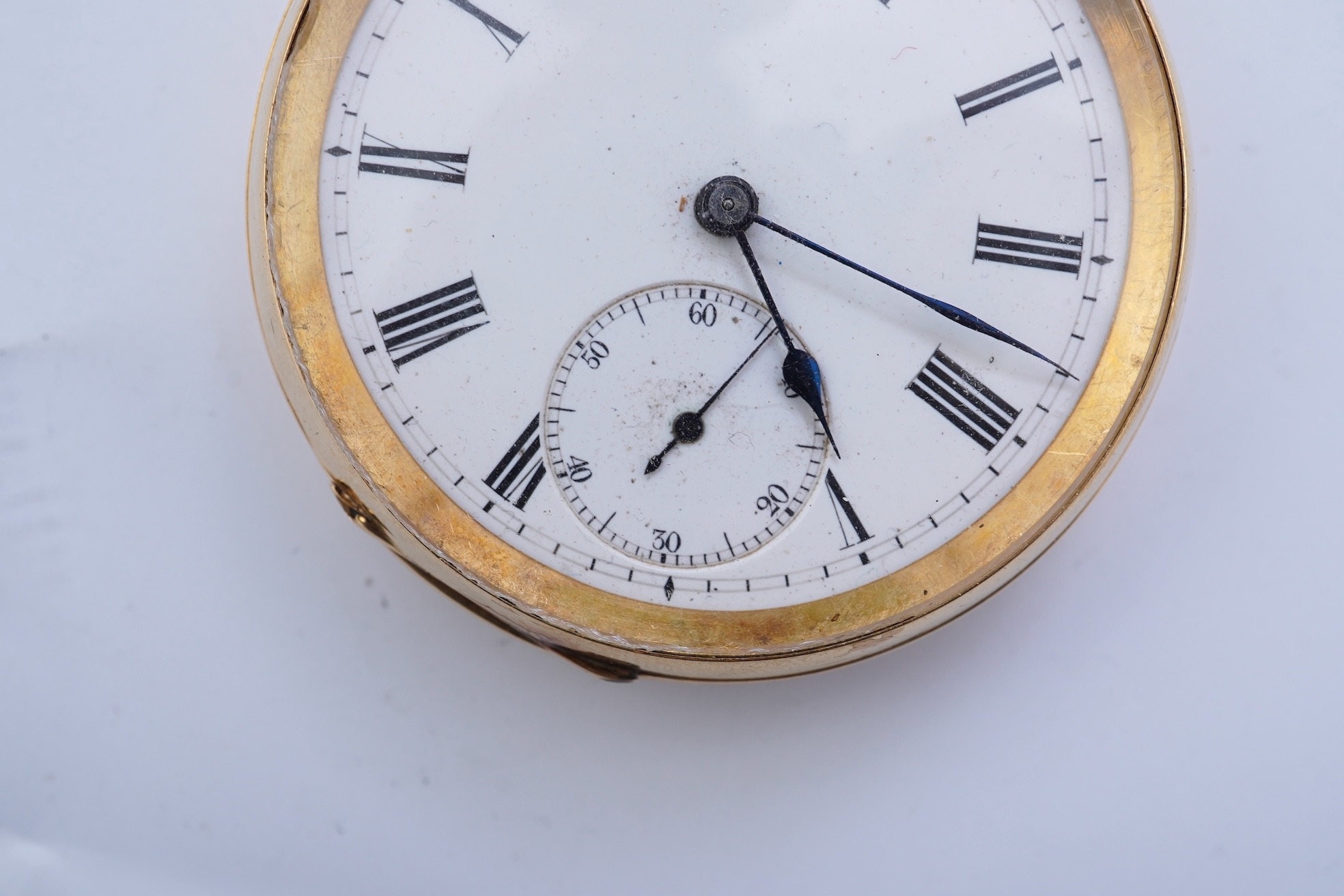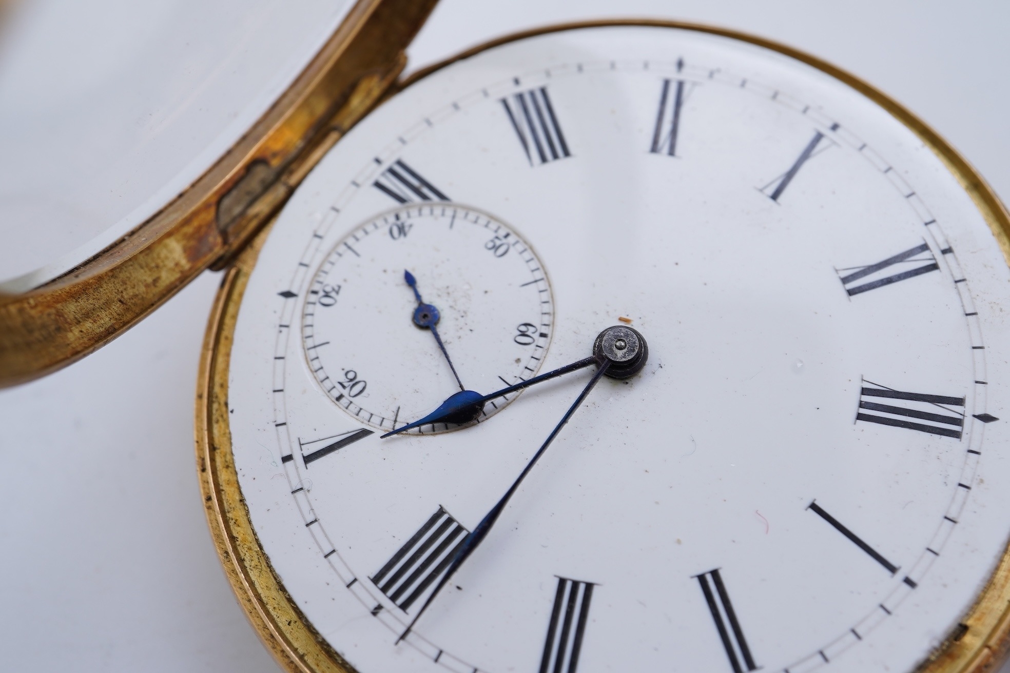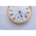 A continental 18k gold open faced keyless lever pocket watch, with a 9ct albert, the watch with Roman dial and subsidiary seconds, case diameter 48mm, gross weight 78 grams, the albert with gold plated T-bar, 37cm, gross weight 34.5 grams.