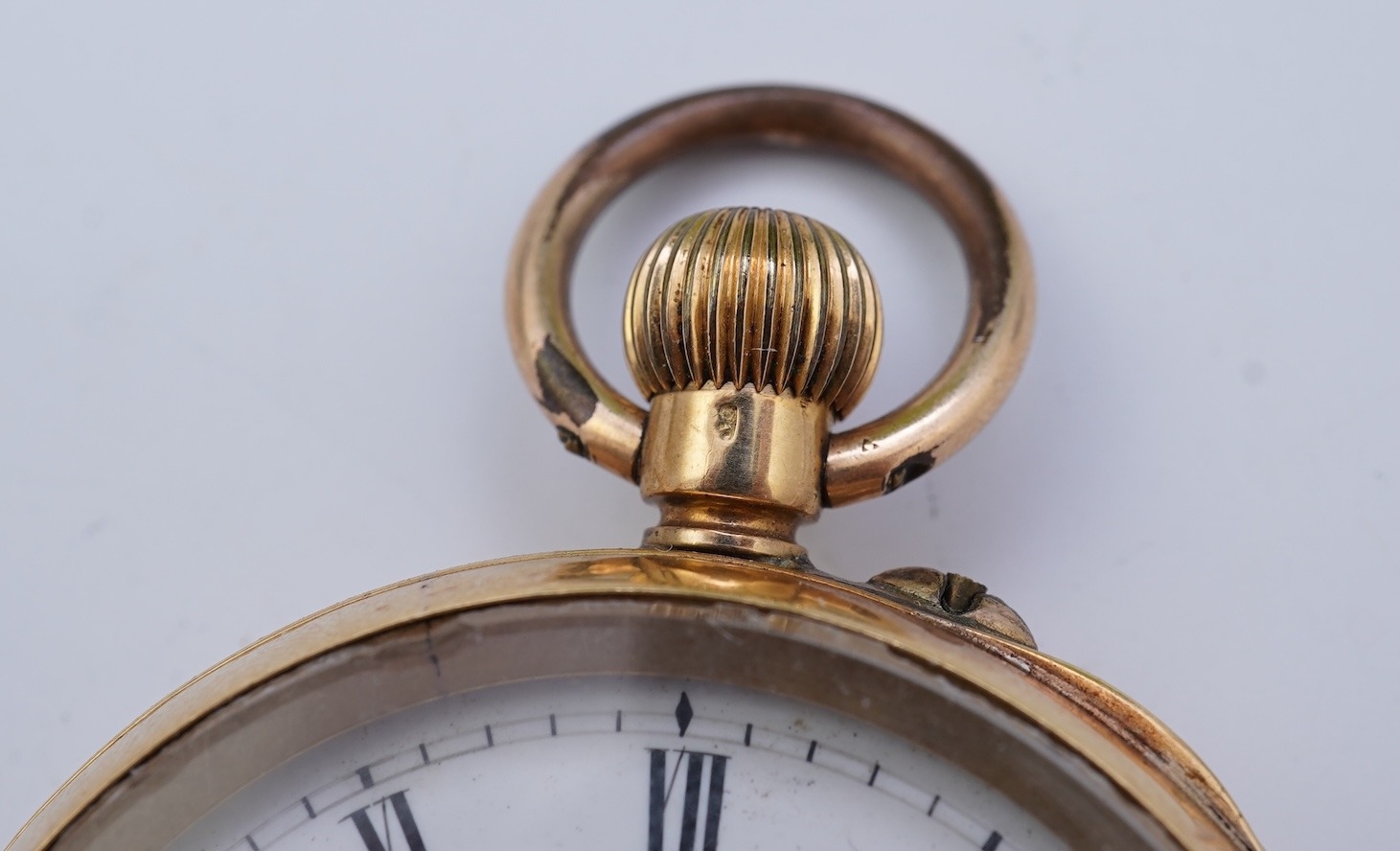 Pocket watch glass loose. Tiny chip to the enamel on the dial. A few small dents around the side of the case. Surface scratches and abrasions to the case back. Watch ticks then stops when wound, so in need of some attention.