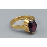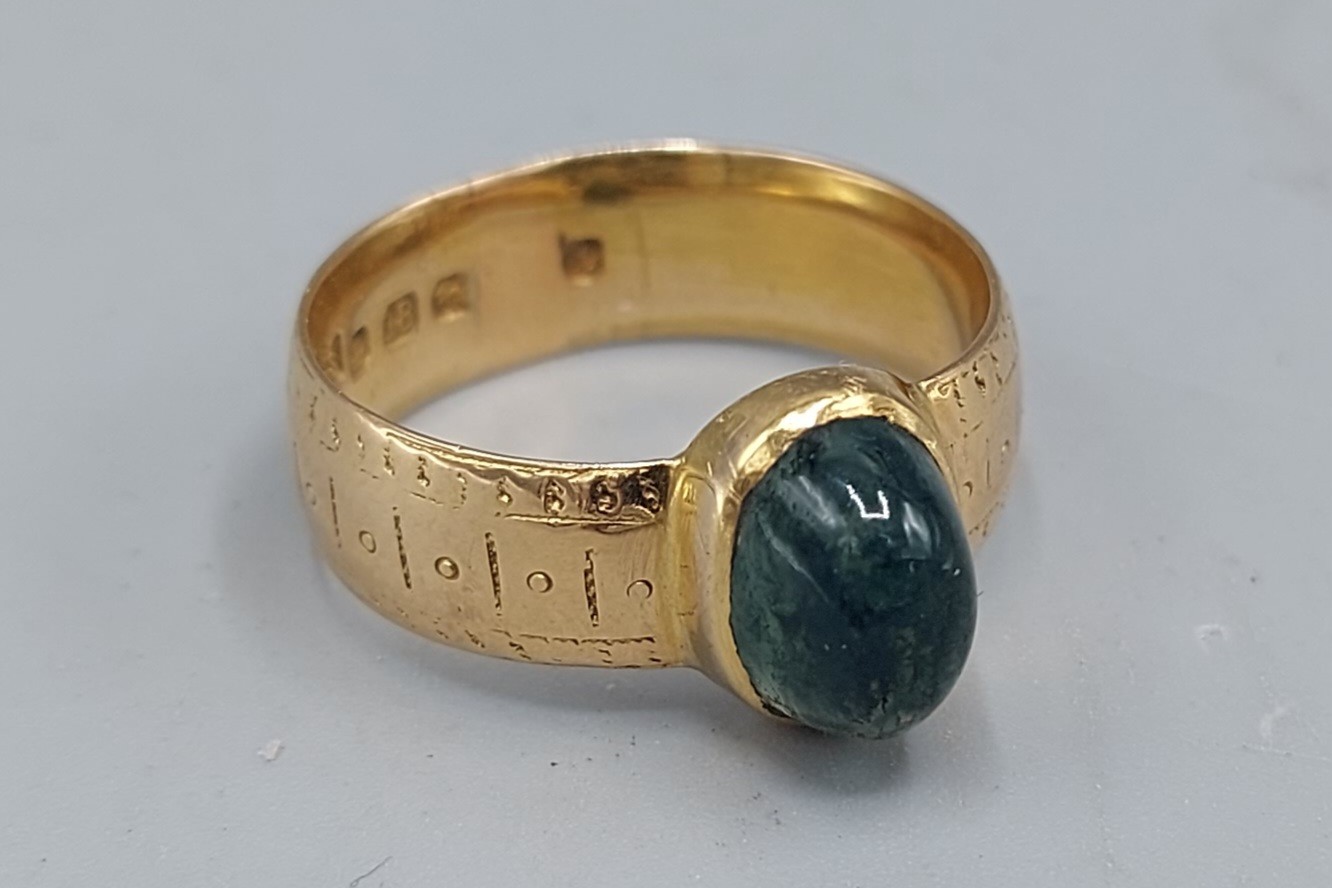 An 18ct gold ring set with a green Cabochon stone, 6.9gms, ring size Q