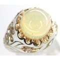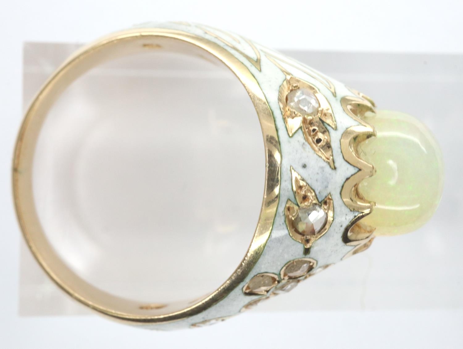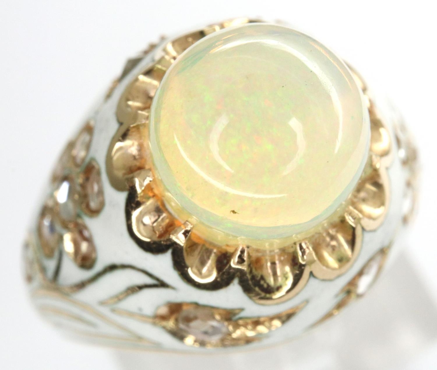 Presumed 18ct and white enamel ring set with large opal and diamonds, size M/O, 7.0g. P&P Group 1 (£14+VAT for the first lot and £1+VAT for subsequent lots)
