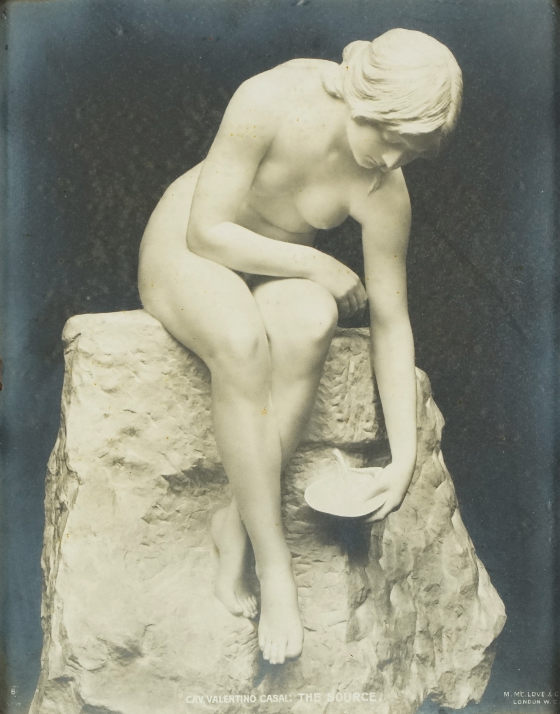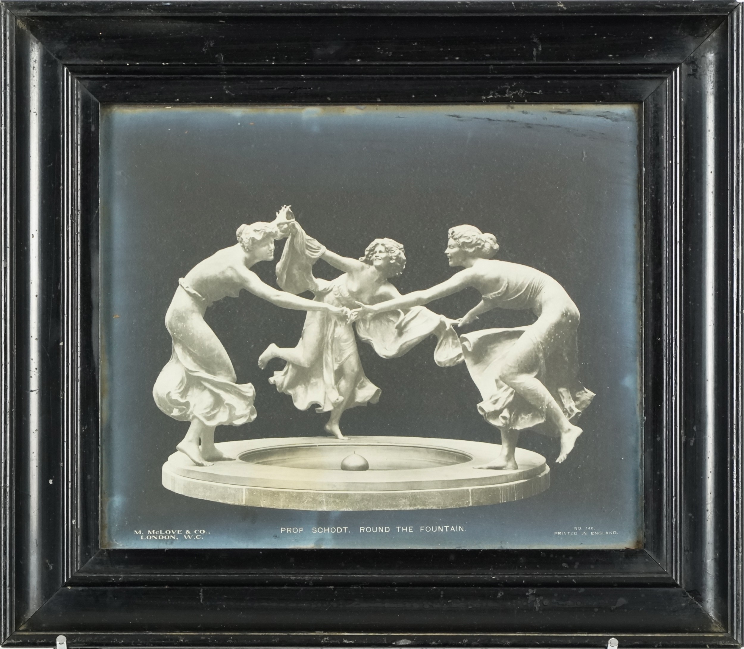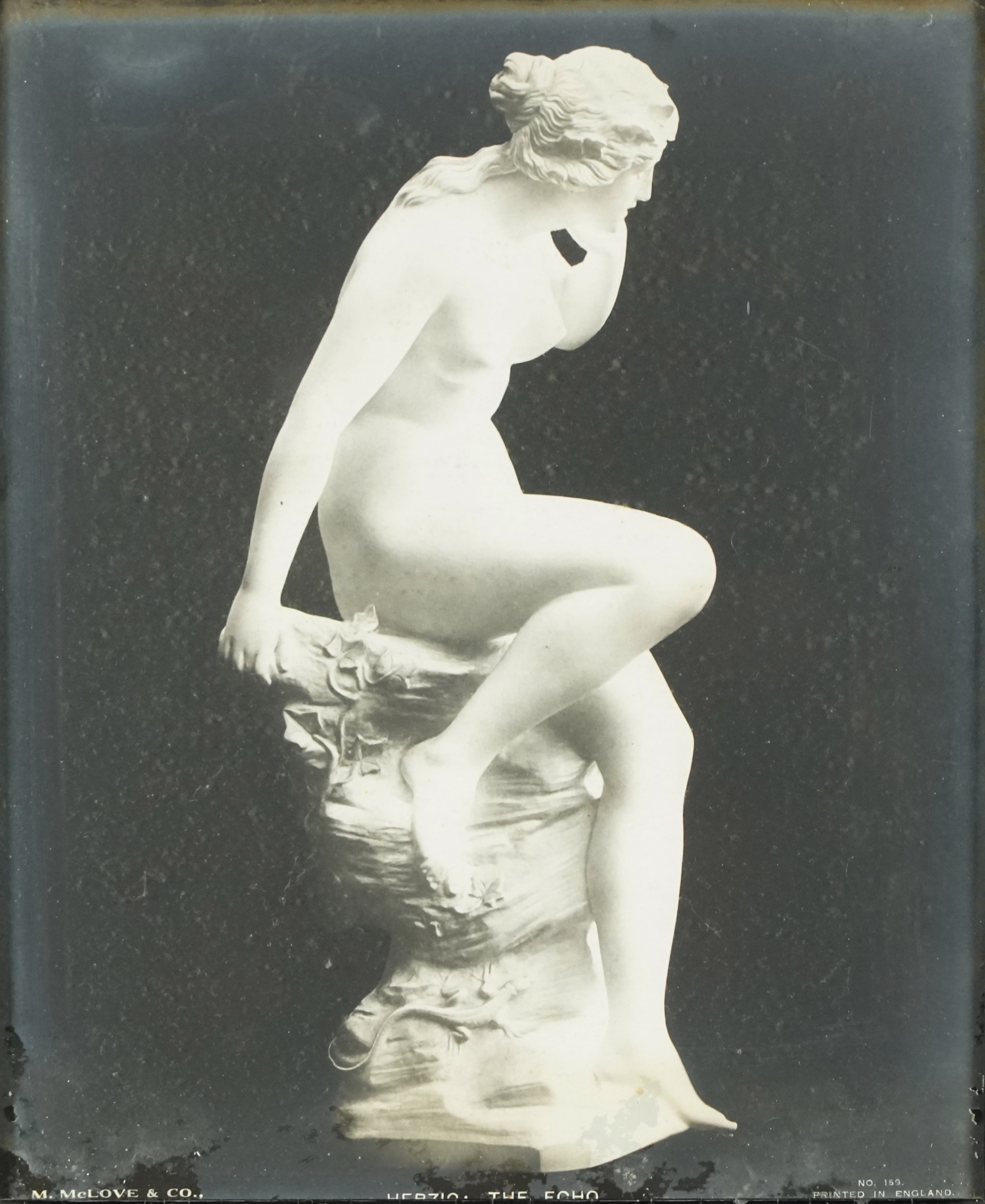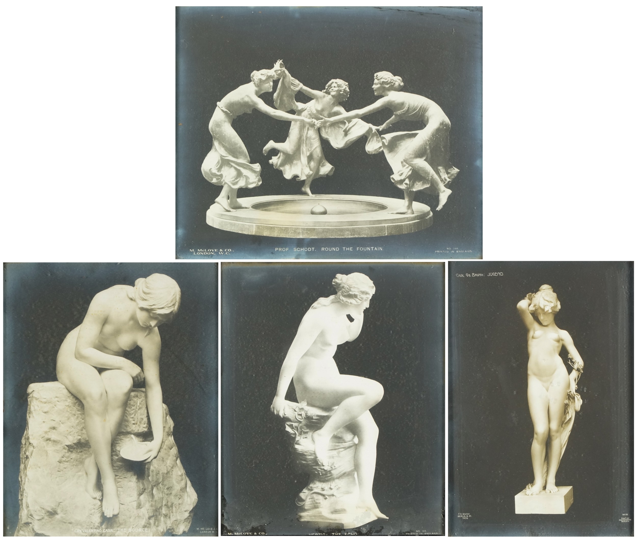 A pair of M. McLove & Co. black and white photographic prints of famous sculptures including Herzig The Echo and Valentino Casal The Source together with two similar black and white photographs of sculptures, each within an ebonised frame, the largest 29cm x 24cm.