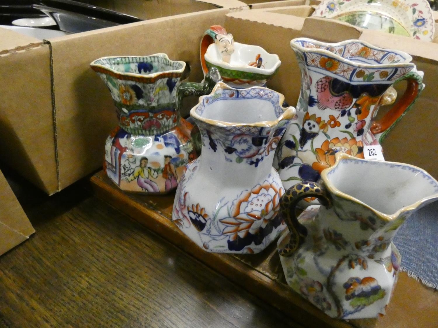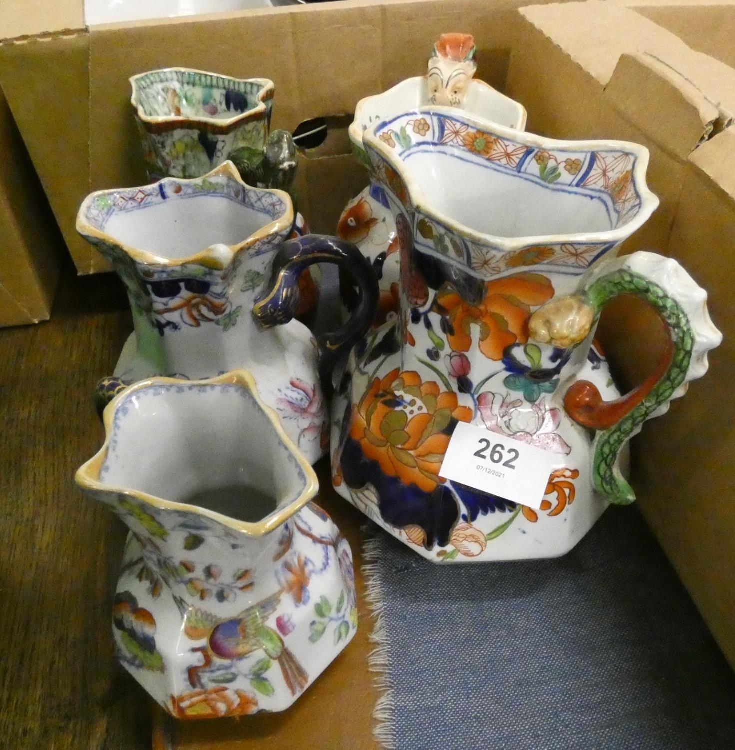 Five antique Masons Ironstone jugs.