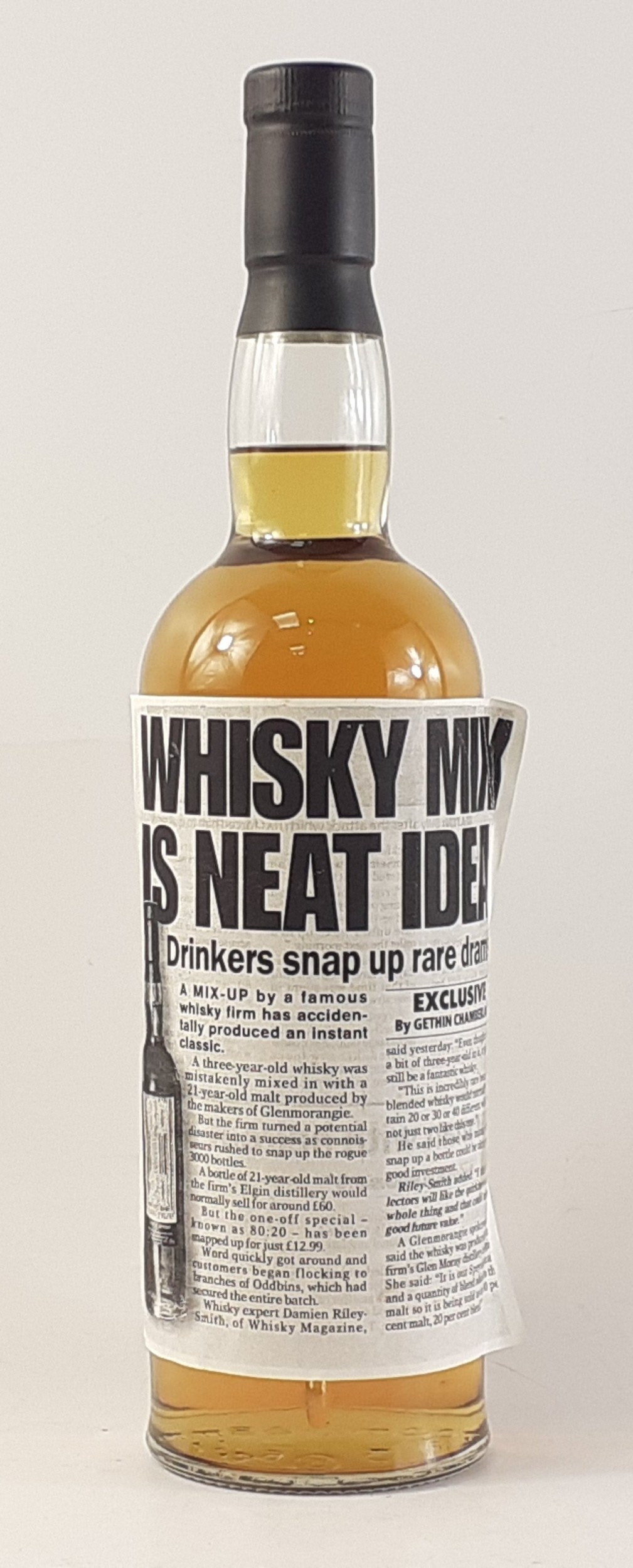 A RARE DRAM! 80:20 Produced at the Glenmorangie Glen Moray distillery and distributed exclusively through Oddbins. A three year old Malt accidentally mixed with a 21 year old Malt. Interesting bottle with the story adhered to the bottle from a contemporary newspaper article.