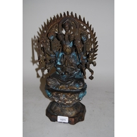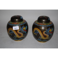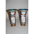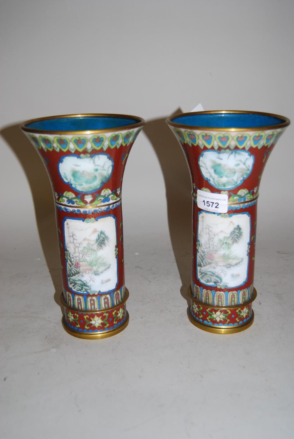 Pair of 20th Century cloisonne trumpet form vases decorated with panels of animals, birds and landscapes on a terracotta ground, 9.5ins high