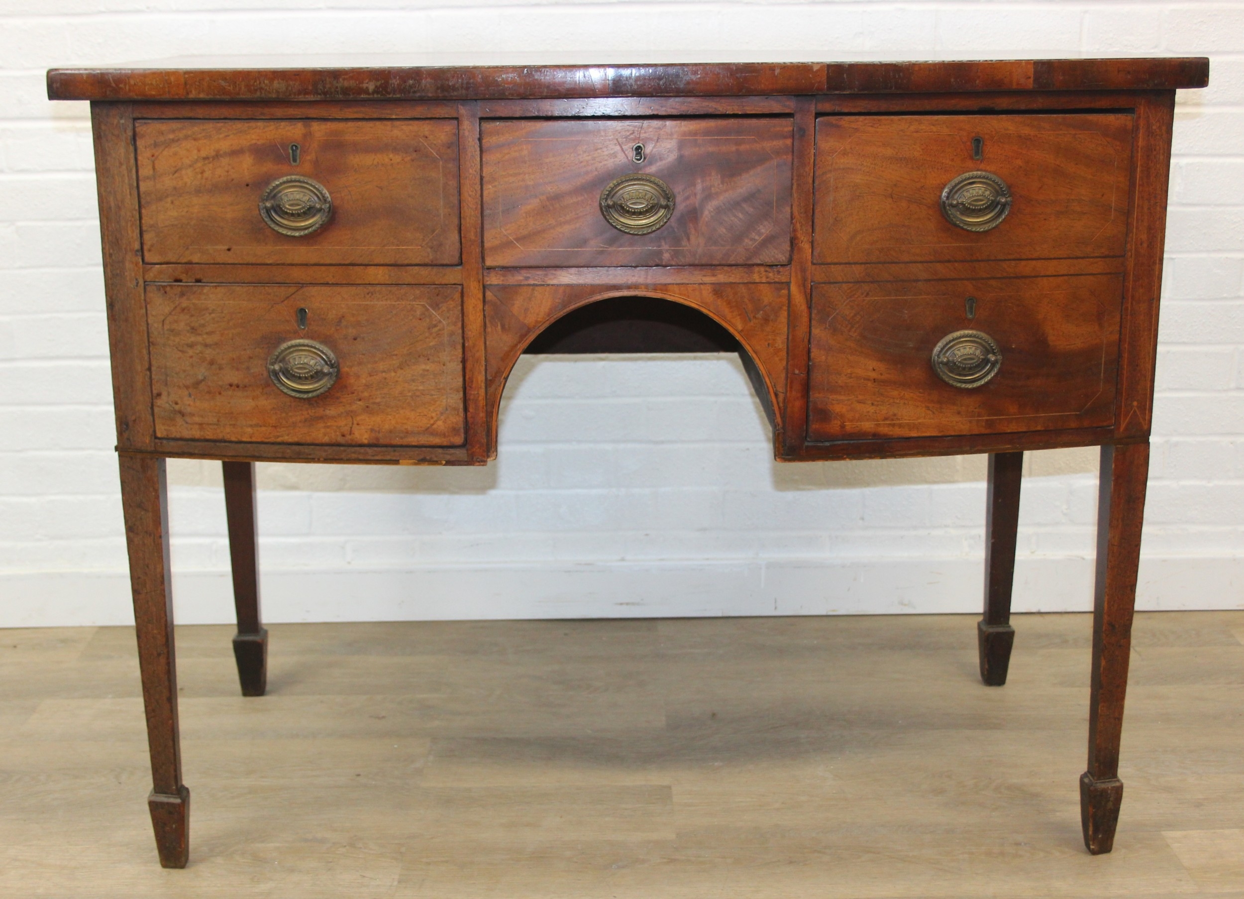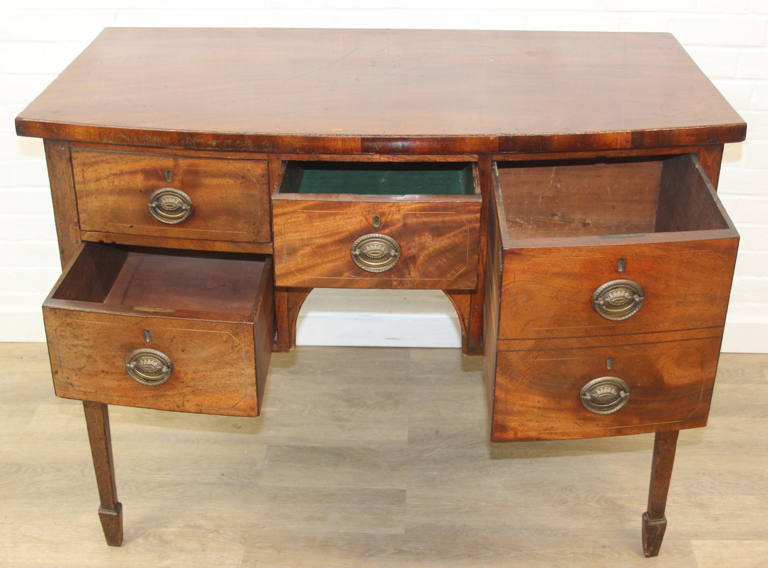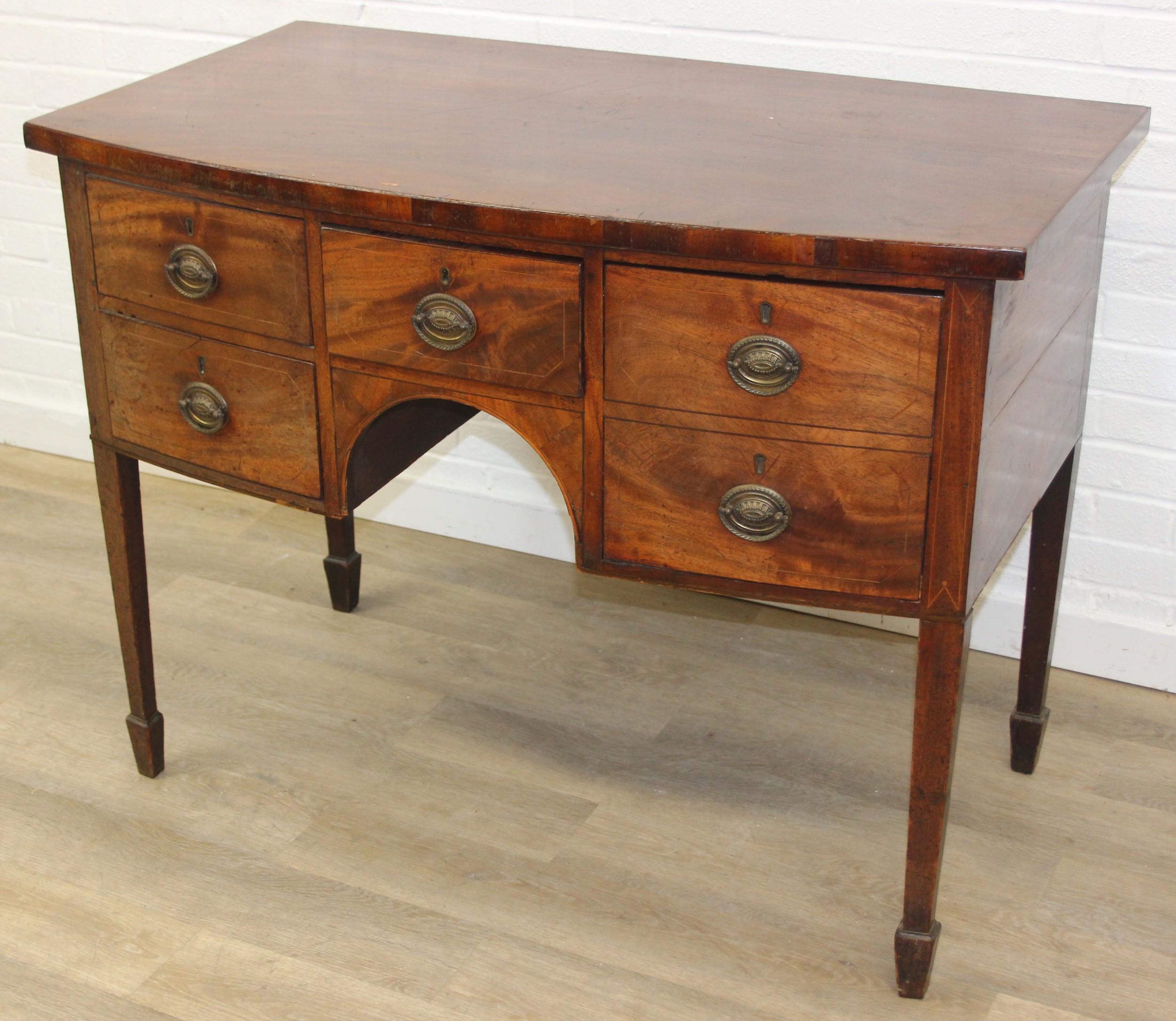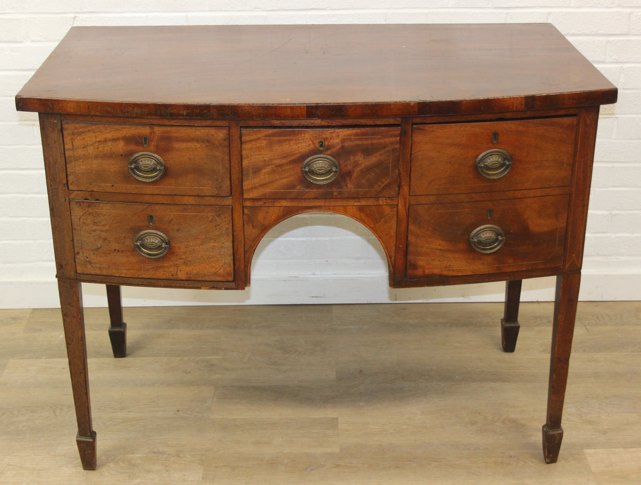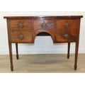 A Regency period mahogany bow fronted sideboard with five drawers and brass handles, 121cm x 68cm x 92cm