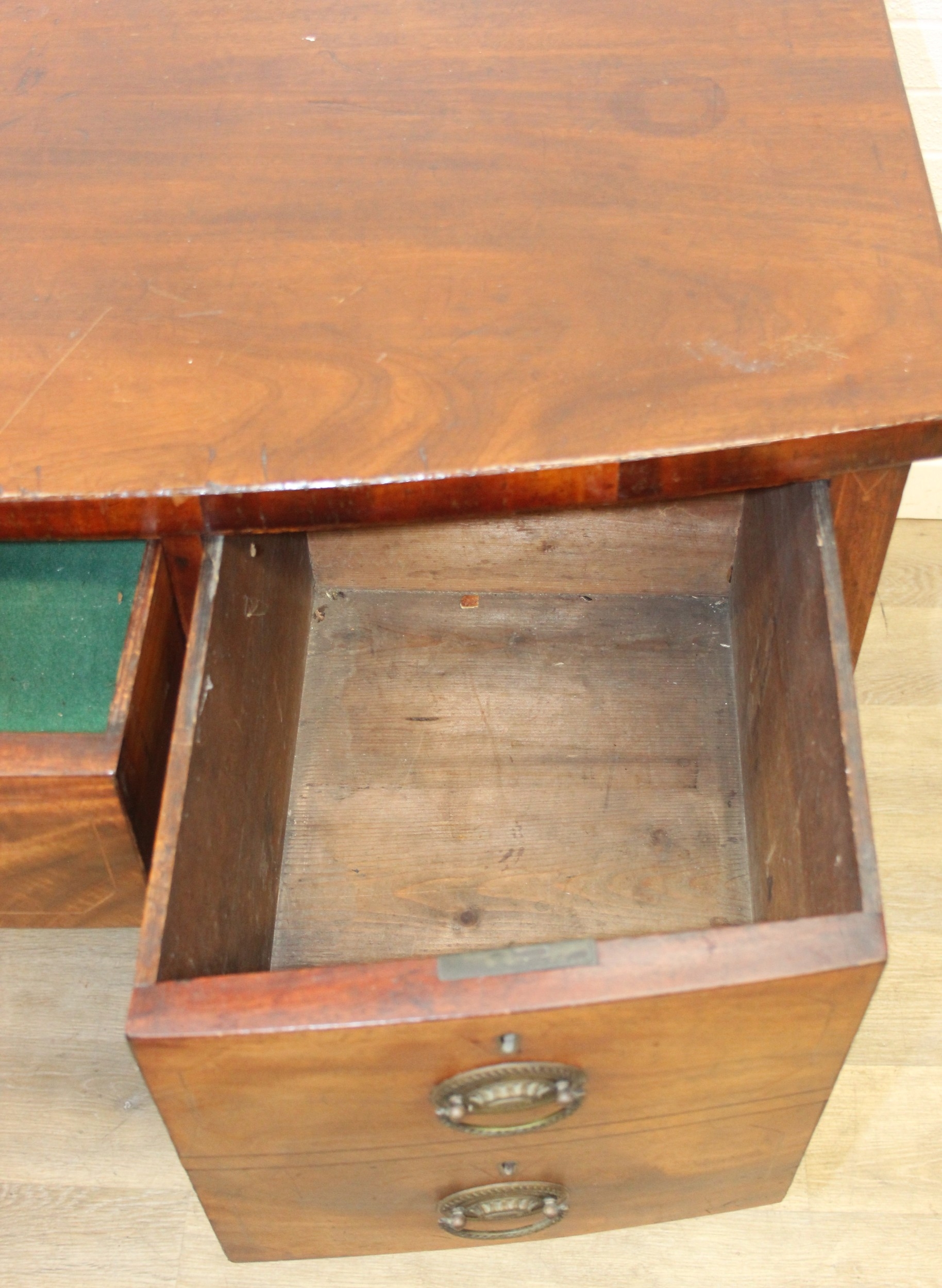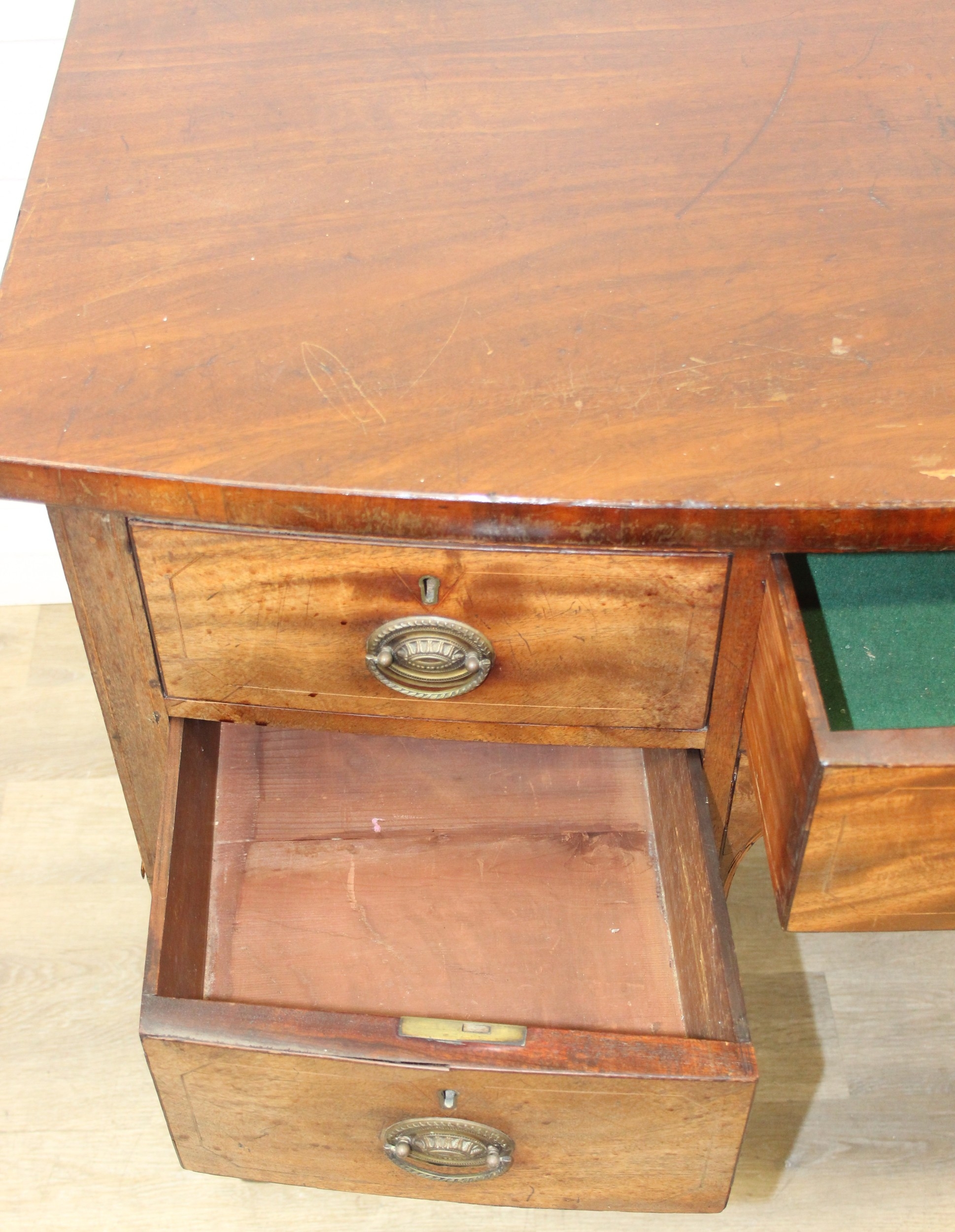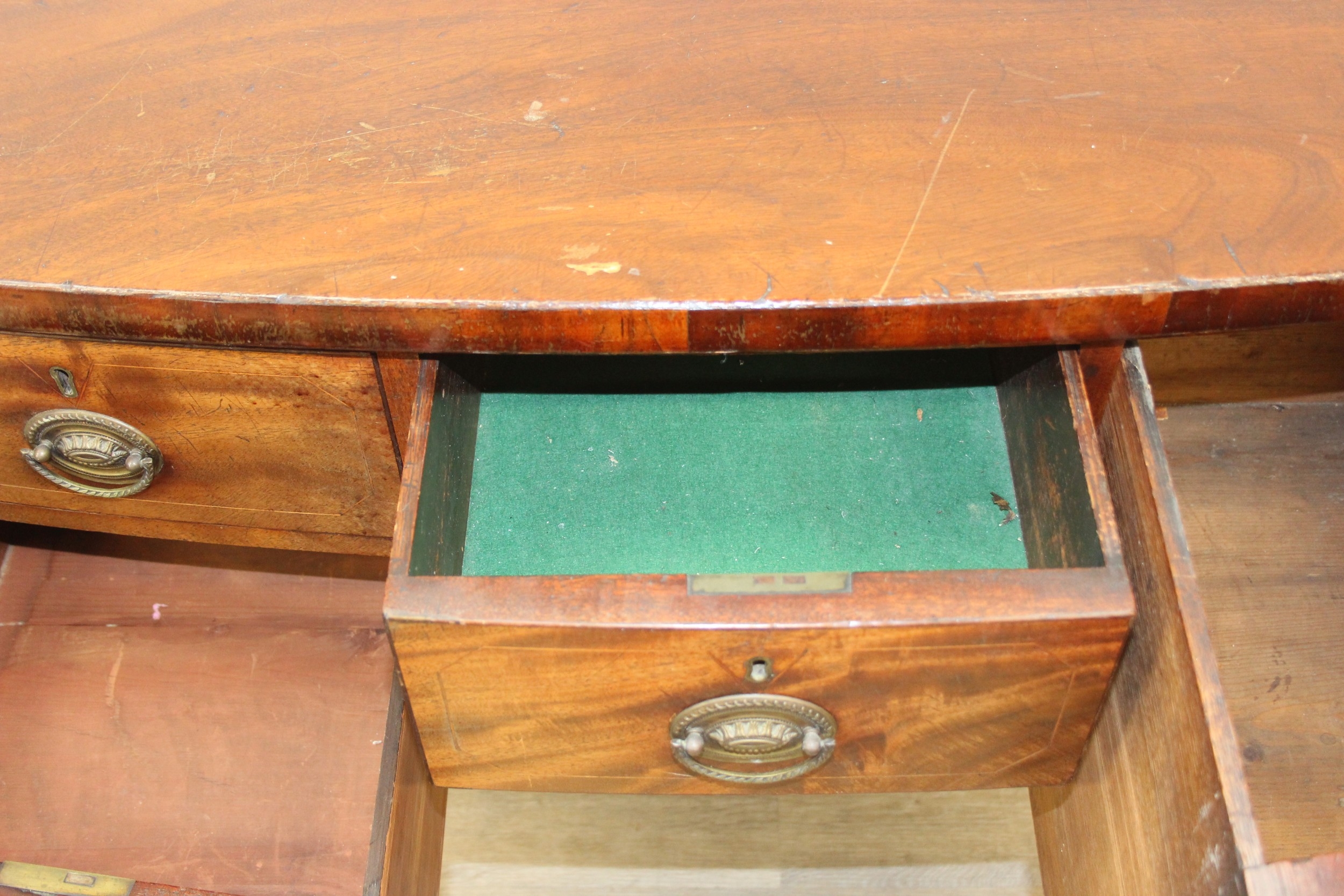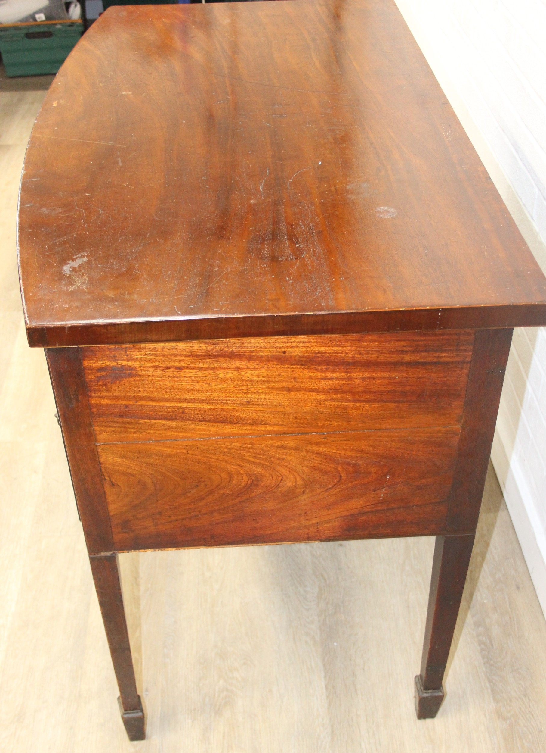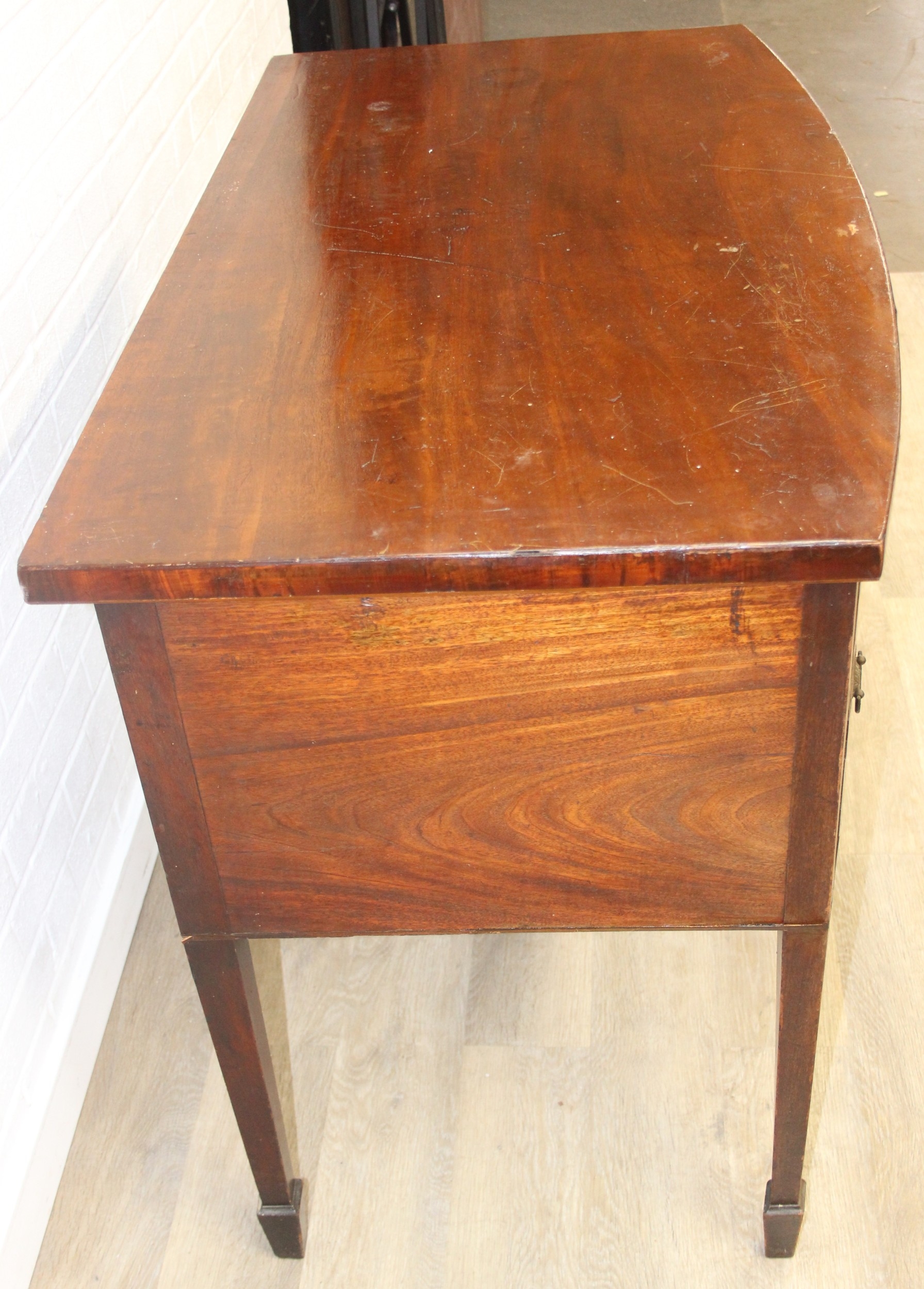 A Regency period mahogany bow fronted sideboard with five drawers and brass handles, 121cm x 68cm x 92cm