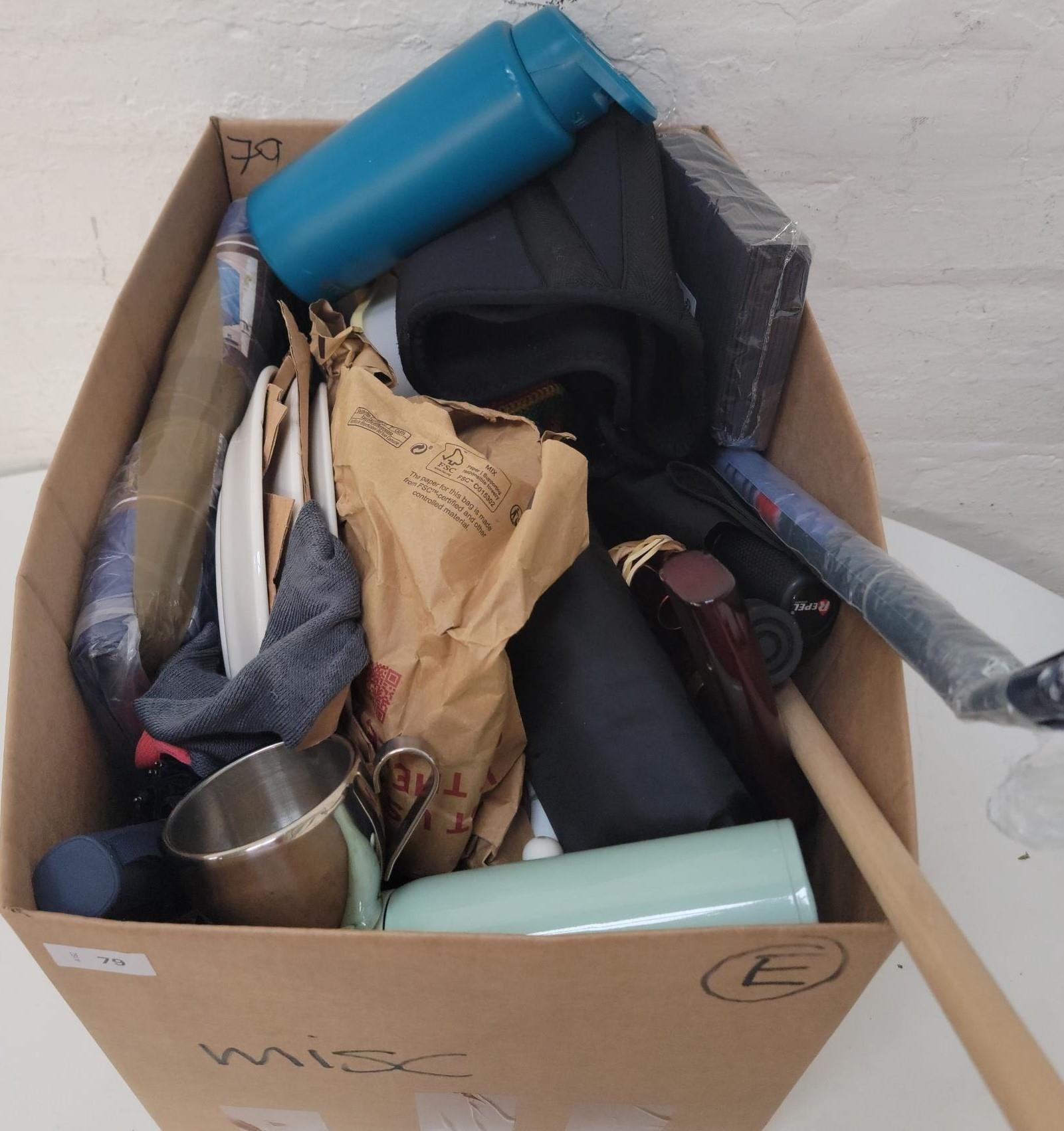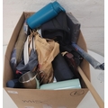 ONE BOX OF MISCELLANEOUS ITEMSincluding: water bottles, umbrellas, plates and a tarpaulin